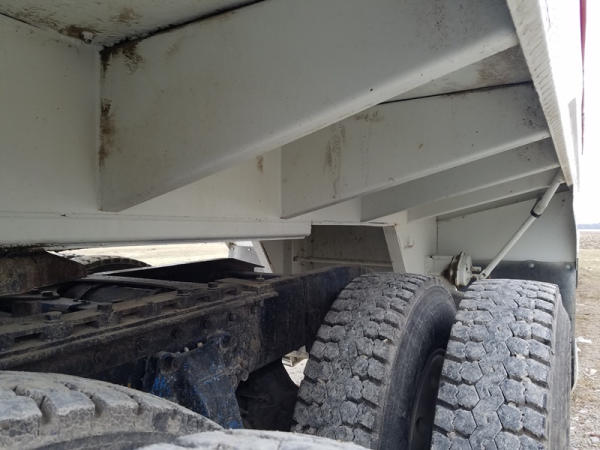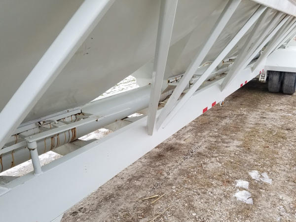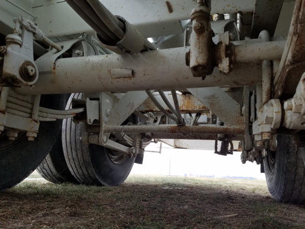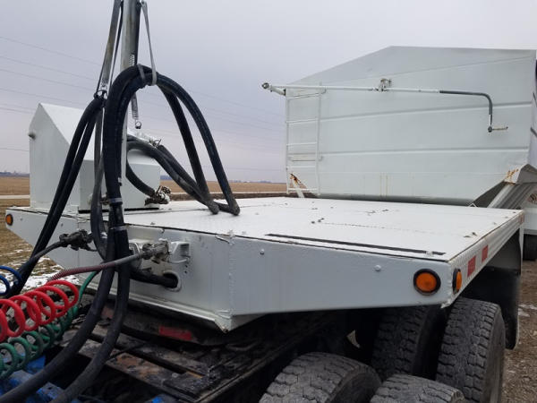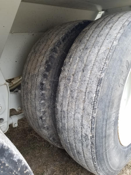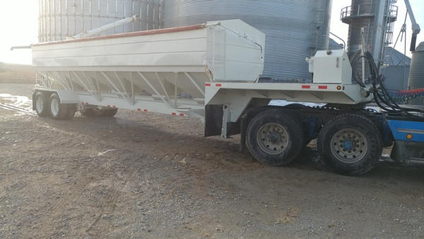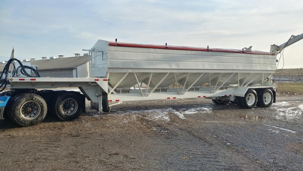 1995 Rayman Field Charger Dry Tender Trailer (NP7713), 24 ton capacity, 5 compartments with rear split compartment, tandem axle, spring suspension, hydraulic, manual roll tarp, overhead swing auger, 295/75R22.5 tires.
