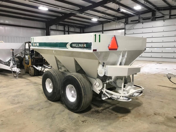 Willmar Super 600 Dry Spreader (NP7722, Unit 11), stainless steel, tandem axle, flotation tires, PTO, 50' spread pattern, dual spinners.
