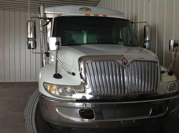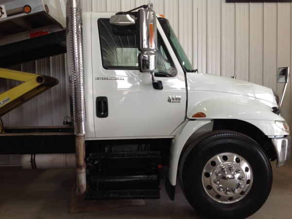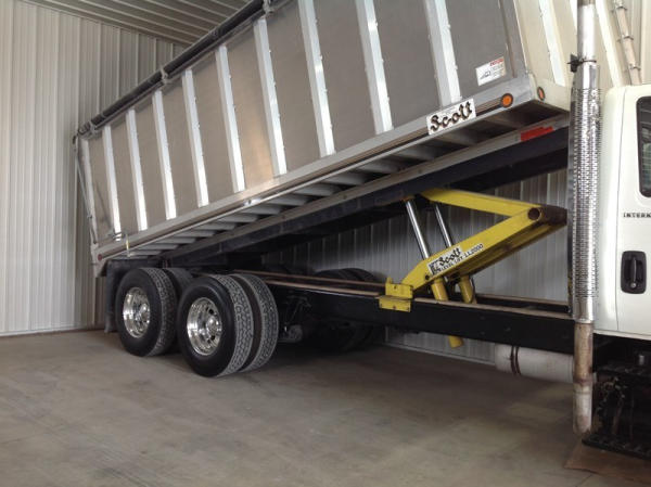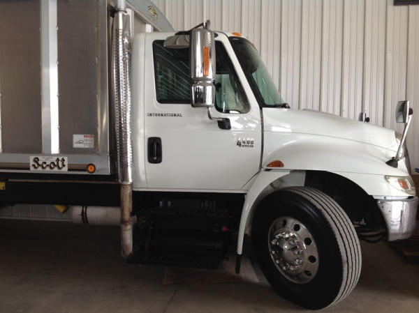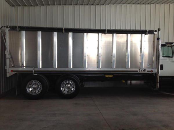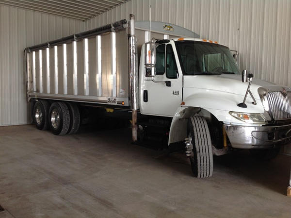 2004 International 4400 Grain Truck (AL567), Detroit 530 engine, Allison automatic transmission, on 6 aluminum rims, tires 75%, SRT tarp, Scott hoist, Scott aluminum box, twin screw, shows 224,292 miles.