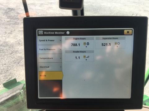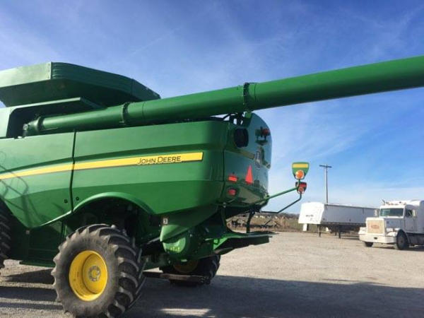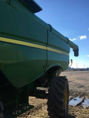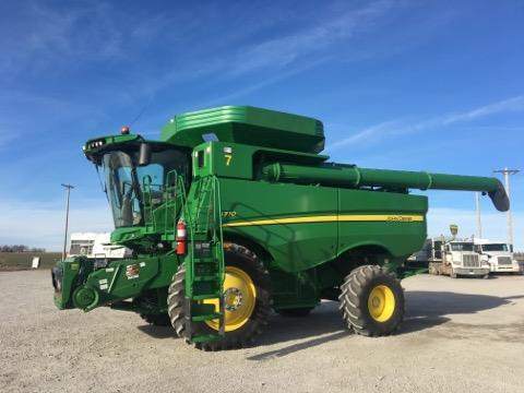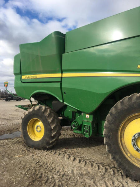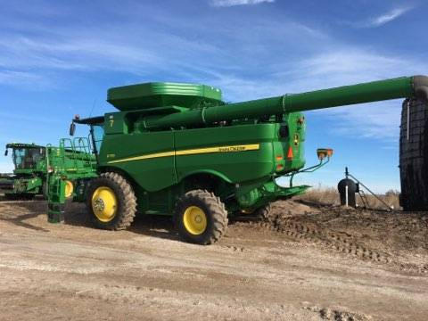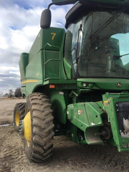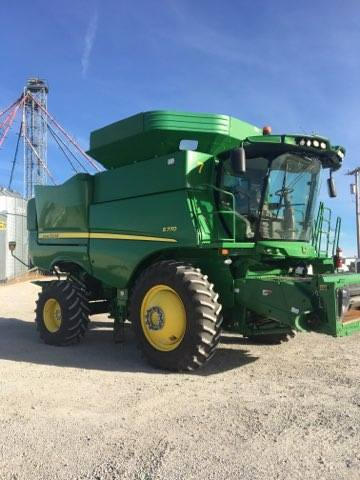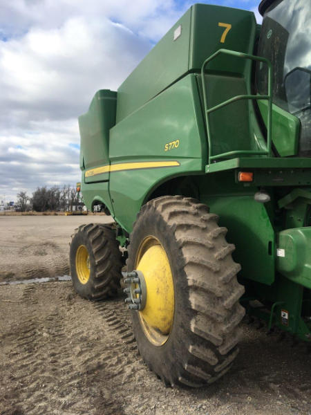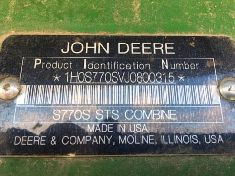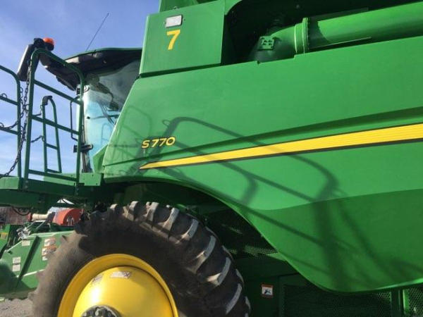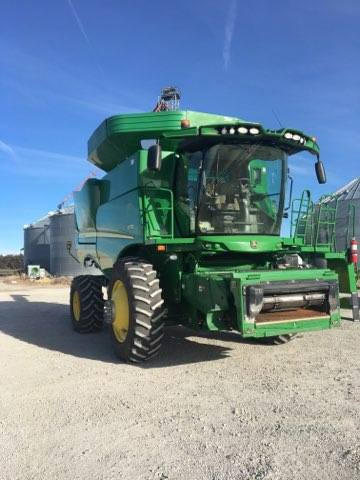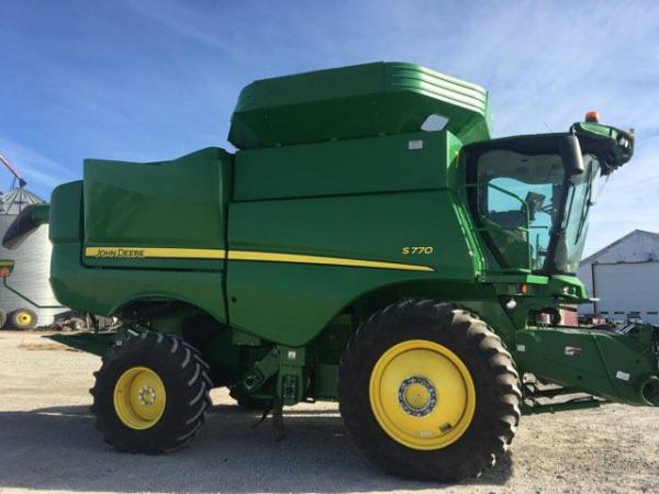 2018 John Deere S770 Combine (DL421), final tier 4 engine, hydrostatic transmission, 3 speed electrical shift, pump - hydro variable displacement, gearbox multiple speed 2, stalk chopper, joystick right hand control, gear drive, hi torque variable speed drive, custom cutter extended wear package, extended wear grain handling, 26ft / 7.9m unload auger, manual adjust vane tailboard, full grain tank sensor, side hill performance package, 600/70R28 R1W (FS/GY) & 520/85R42 R1 DUAL 157A8 tires, shows 785 engine hours, shows 521 separator hours.
