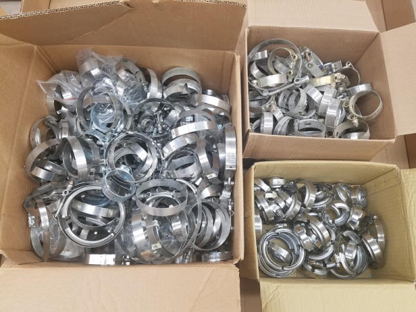 Clamps (PZ2678), 3 boxes of assorted clamps, T-bolt, Worm gear, Flange clamps.