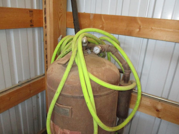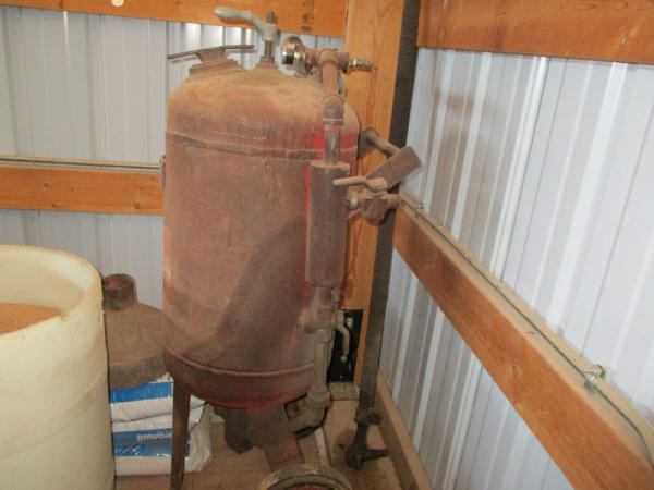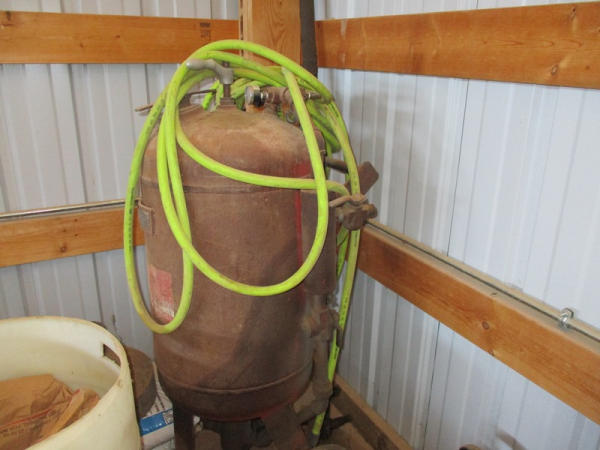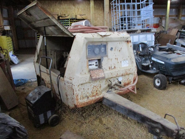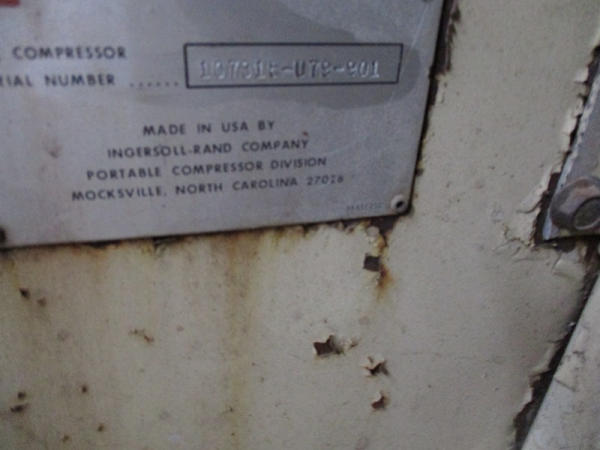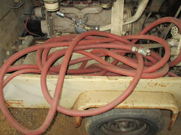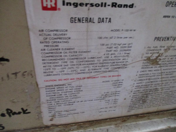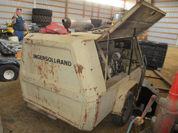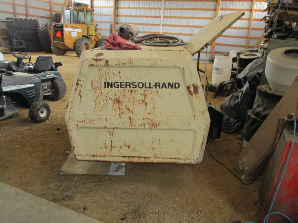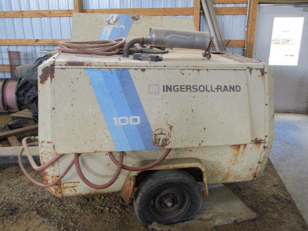 Ingersoll Rand (DR2917), 100 CFM portable air compressor, gas engine has less than 100 hours on overhaul, includes sand blasting pot, and hose, shows 3871 hours.