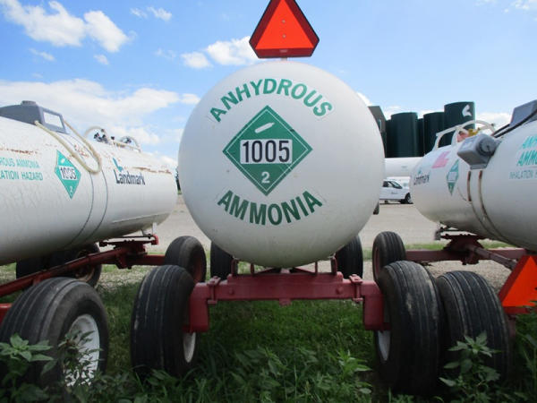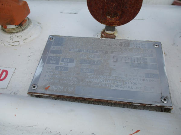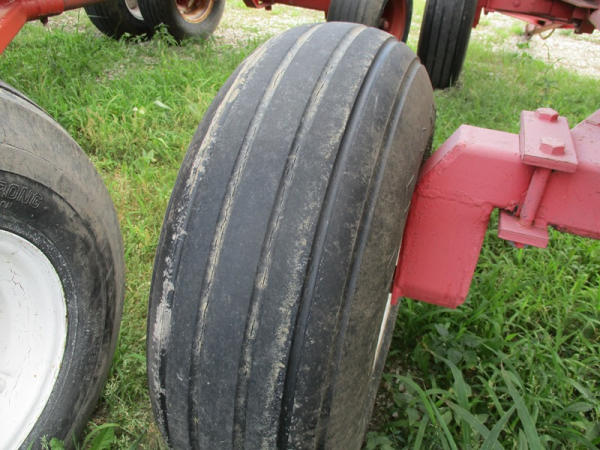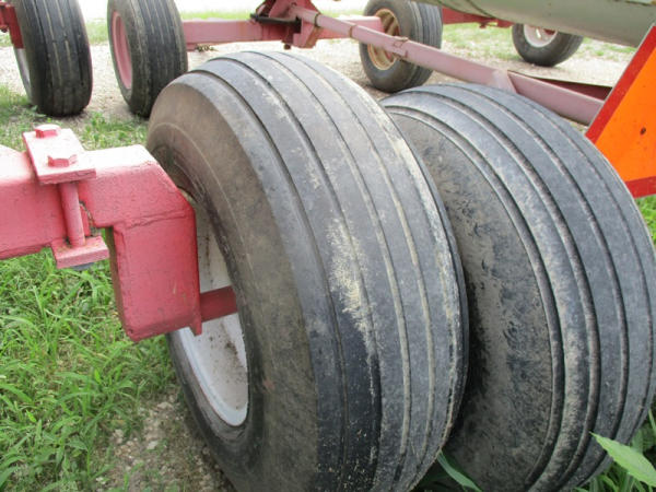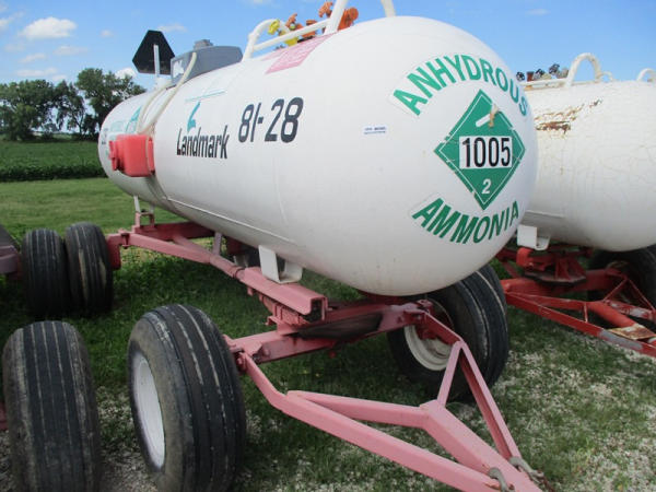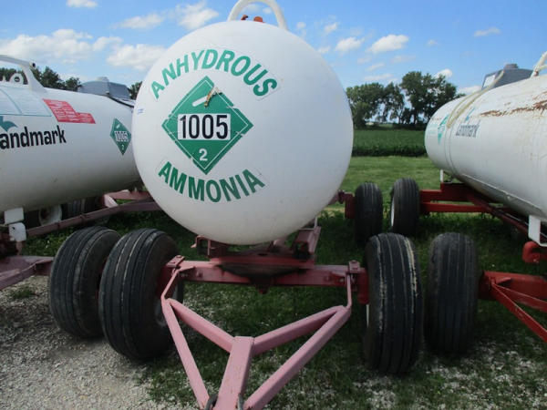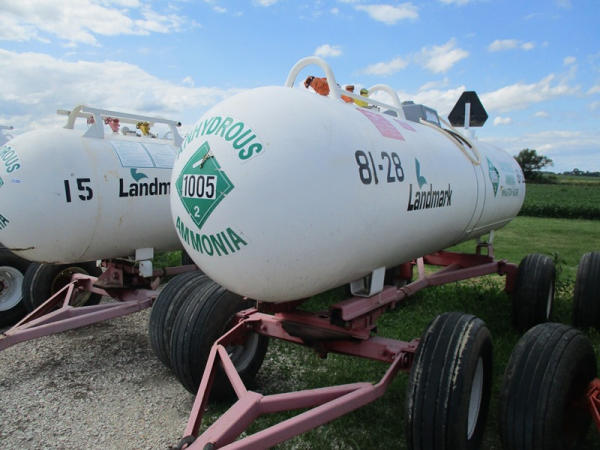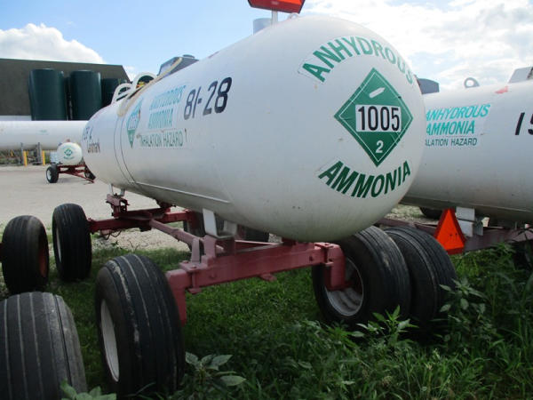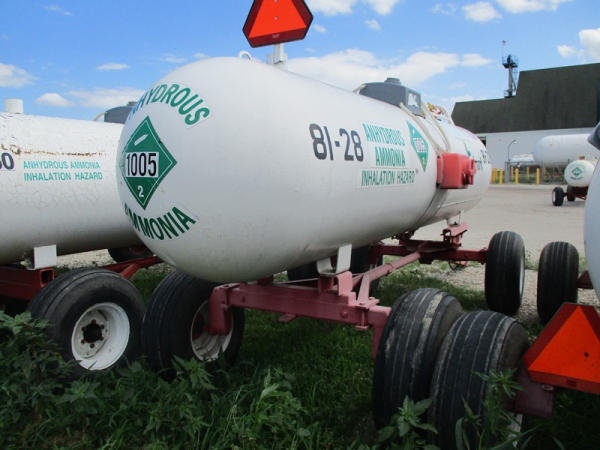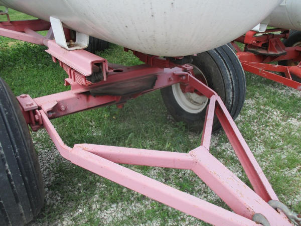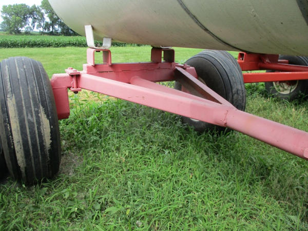 Nh3 Nurse Tank (DR2945 Unit 81-28), 1000 gallon tank, top front fill, data tag, 5th wheel style running gear, adjustable axles, rear hitch, 12.5L-15 tires.
