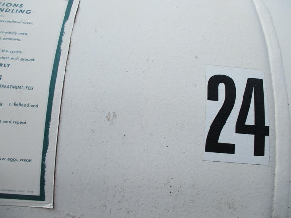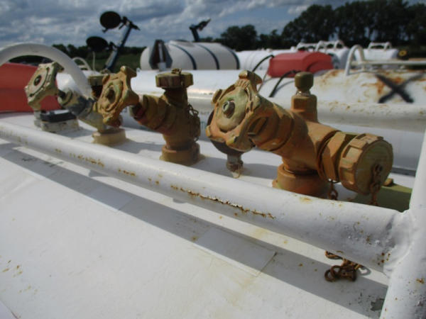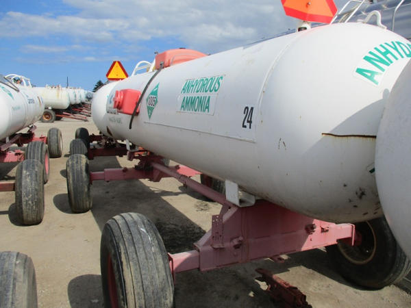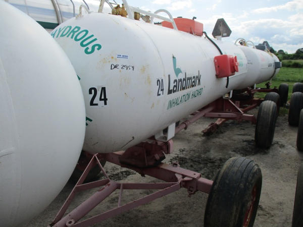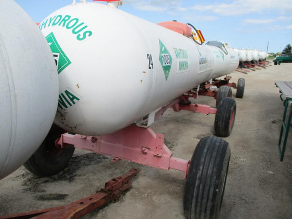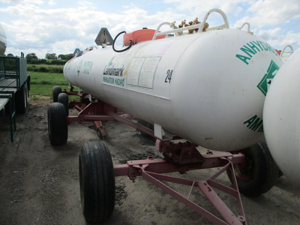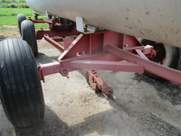 Nh3 Nurse Tank (DR2959 Unit 24), 1000 gallon tank, top front fill, data tag, 5th wheel style running gear, adjustable axles, rear hitch, 12.5L-15 tires.