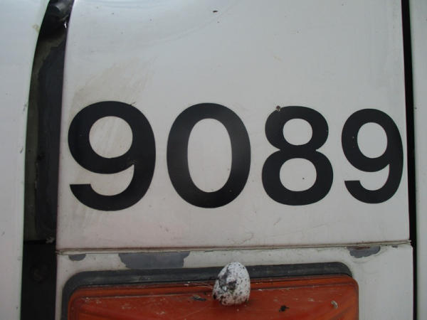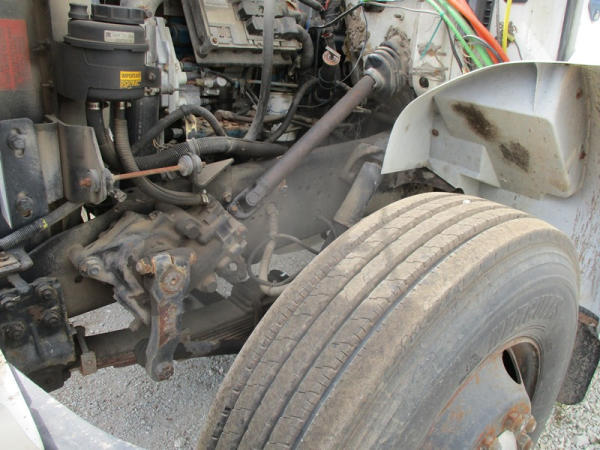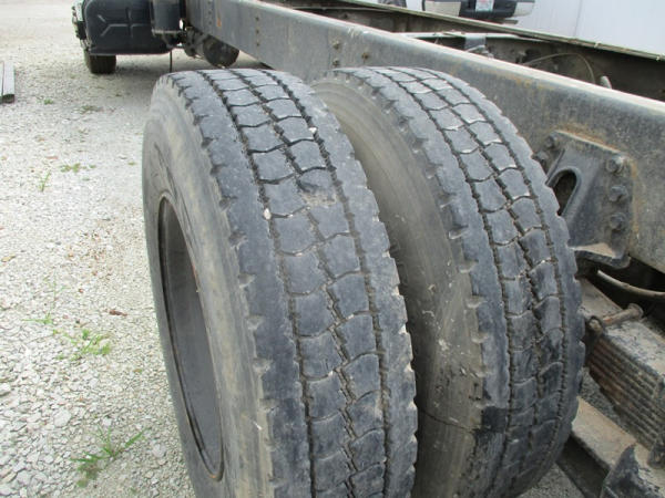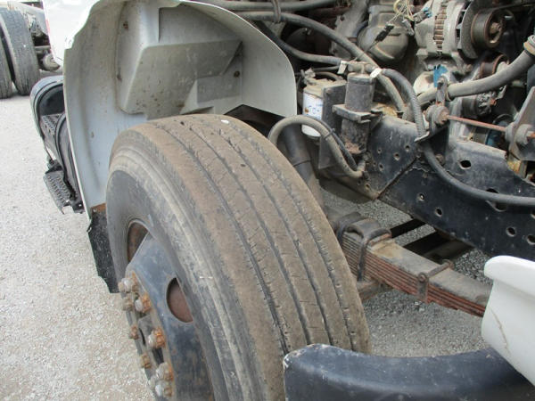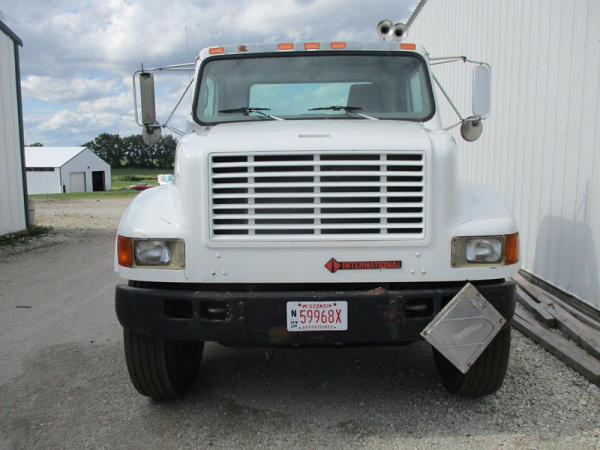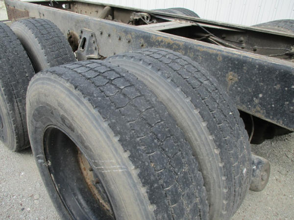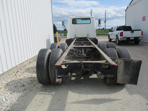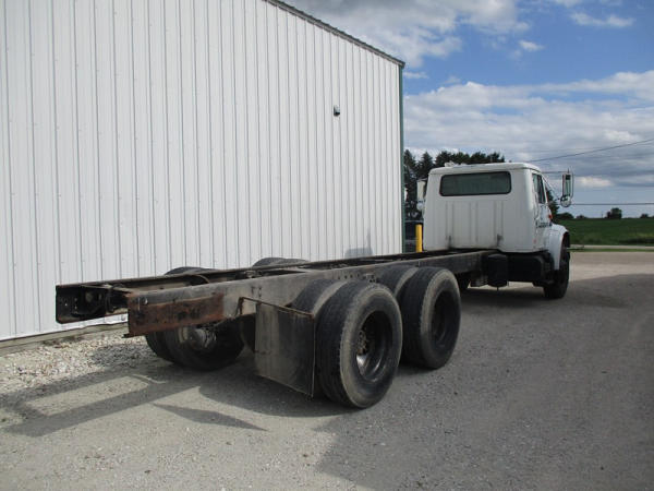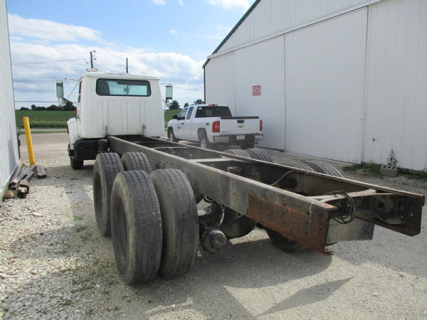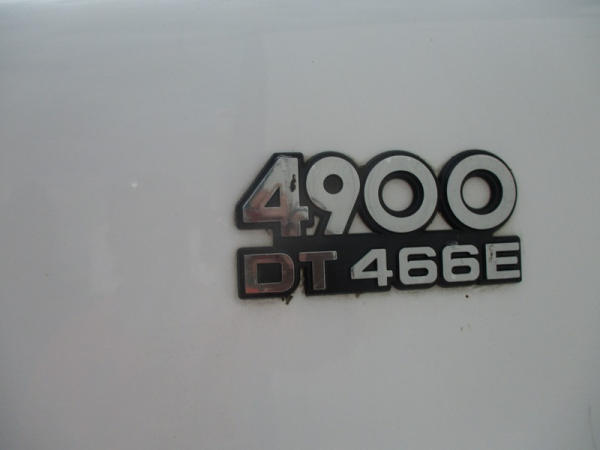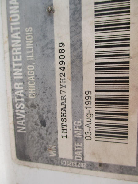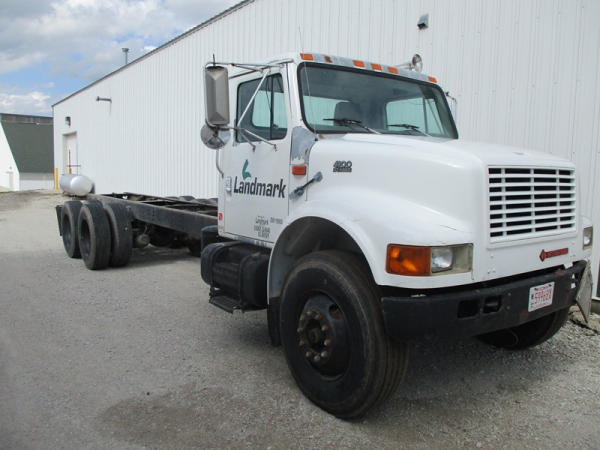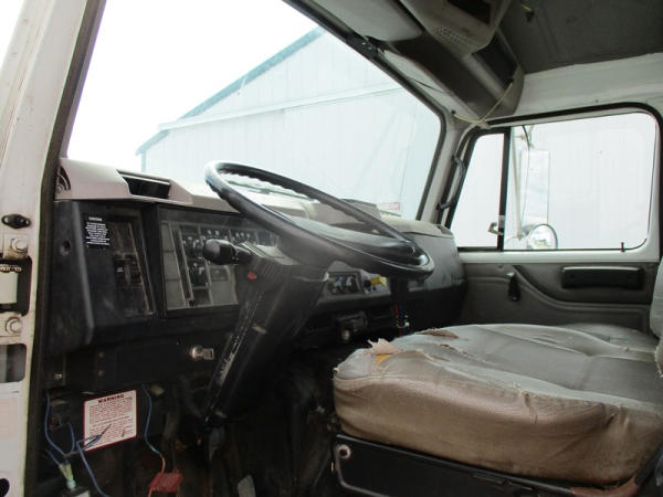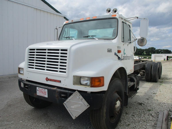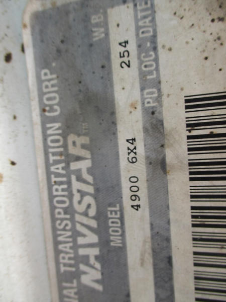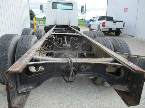 2000 International 4900 Cab/Chassis (DR2965 Unit 9089), cab/chassis, DT 466 diesel engine, 10 speed transmission, AM/FM radio, air brakes, tandem axle full screw, air conditioning, 23' of frame behind the cab, cruise control, 22.5 tires, shows 230,904 miles.