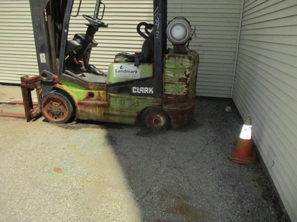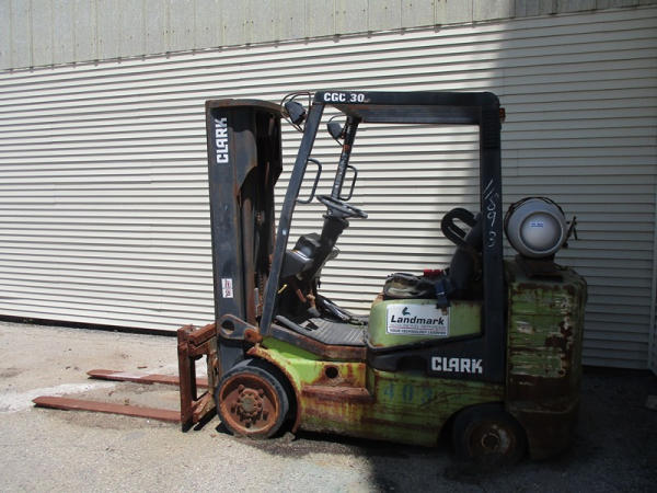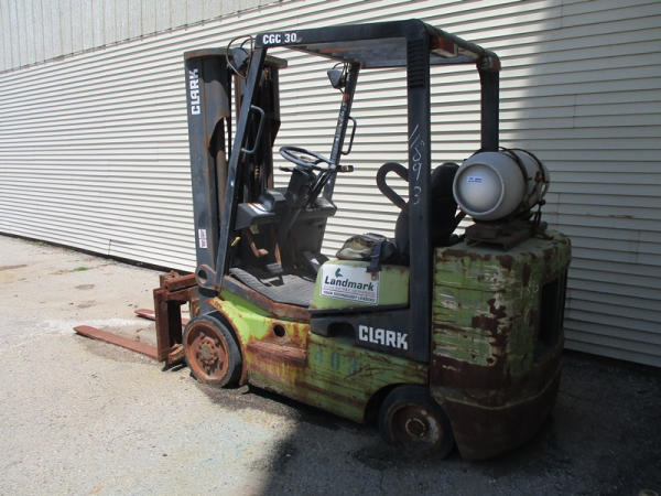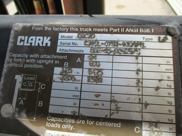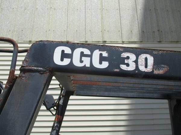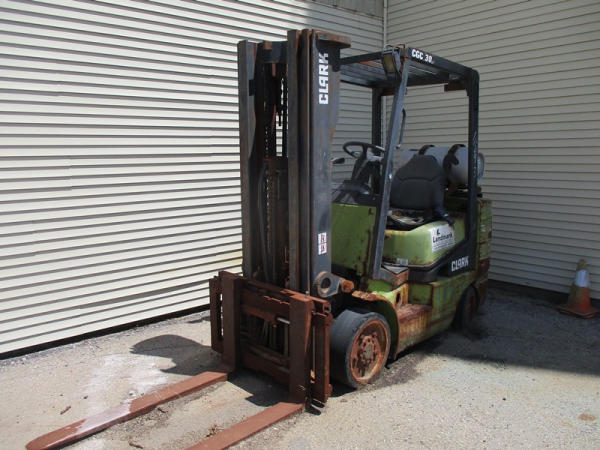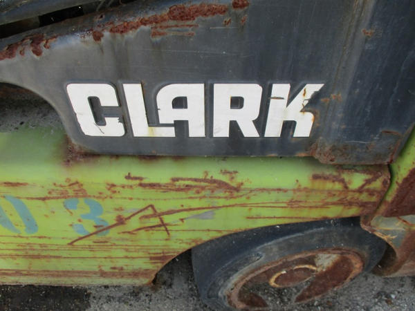Clark Forklift (DR2927), CGC-30, NON RUNNER, LP gas engine, shuttle shift drive, 3 stage mast, 3500 lb capacity, hard tires, hydraulic side shift.