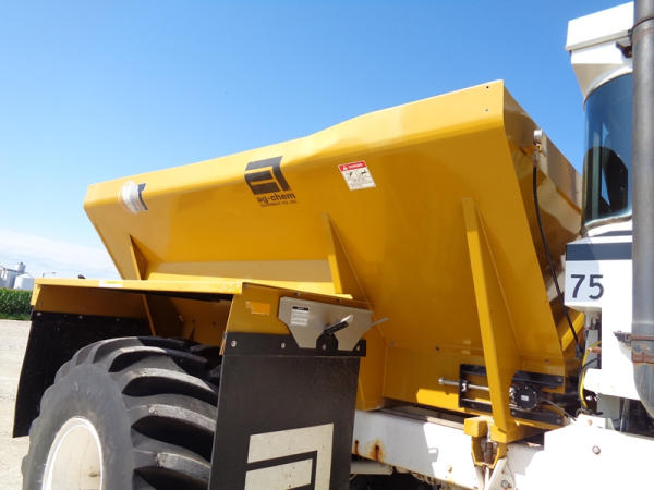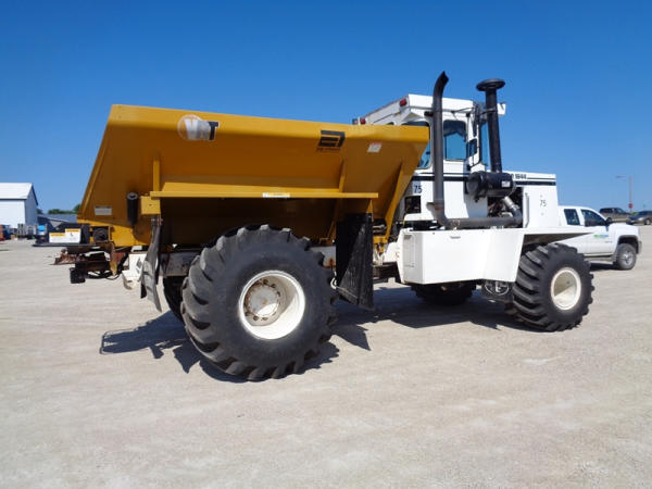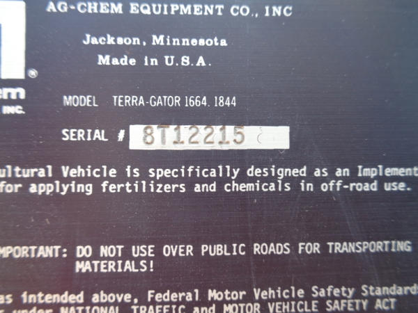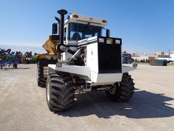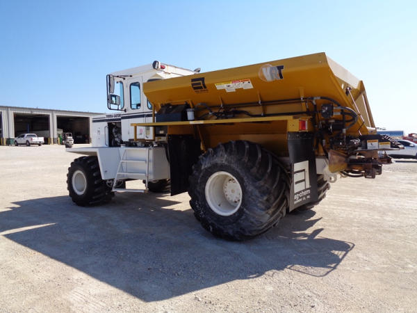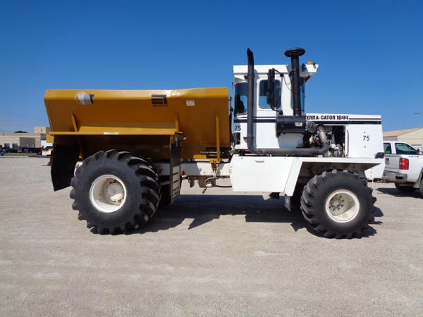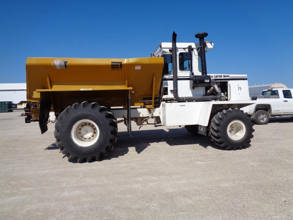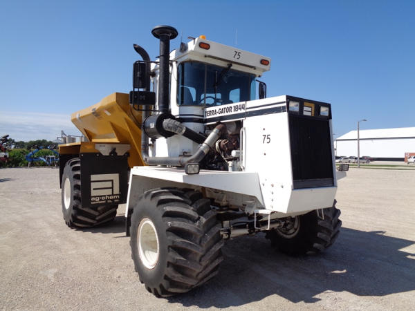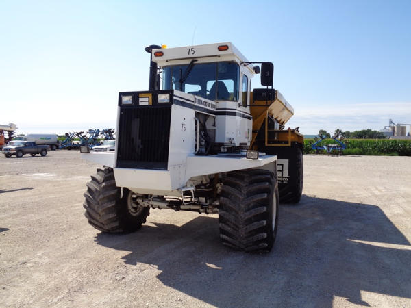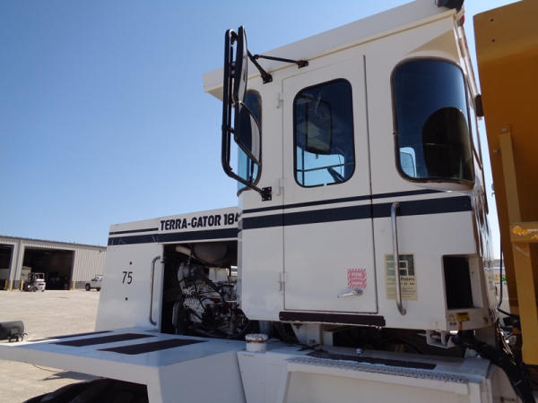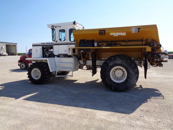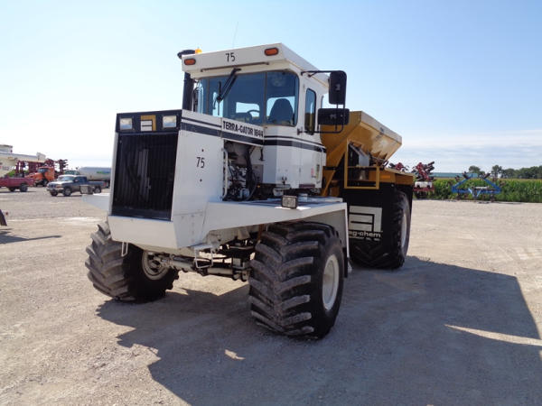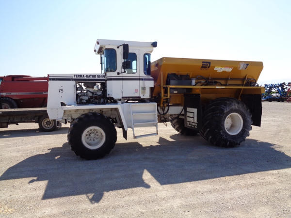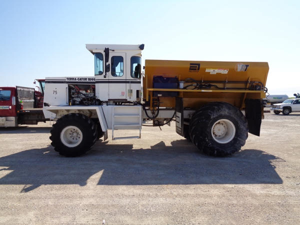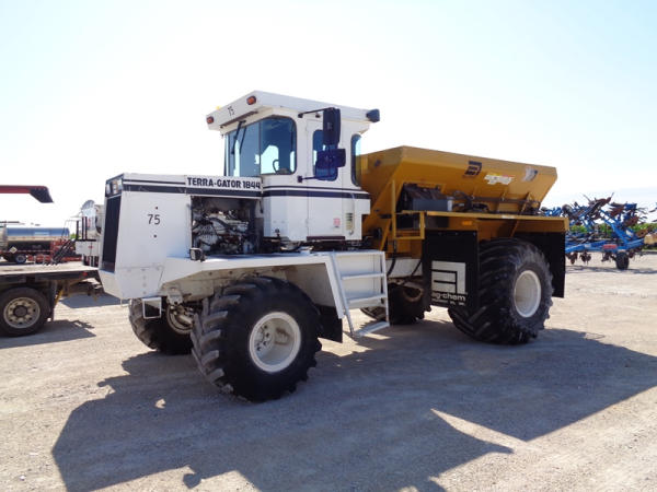 1995 Terra Gator 1844 Dry Floater (PZ2703, Unit 75), Cummins 6CTA 8.3L diesel engine, automatic transmission, air conditioning, heat, Am/Fm radio, New Leader dry spreader box, twin spinner, all hydraulic, S/N 109467, Firestone 48x31.00-20 front tires, Good Year & Firestone 66x43.00-25 tires, Falcon controller, lightbar, Trimble GPS, shows 6602 hours, 65,692 miles.