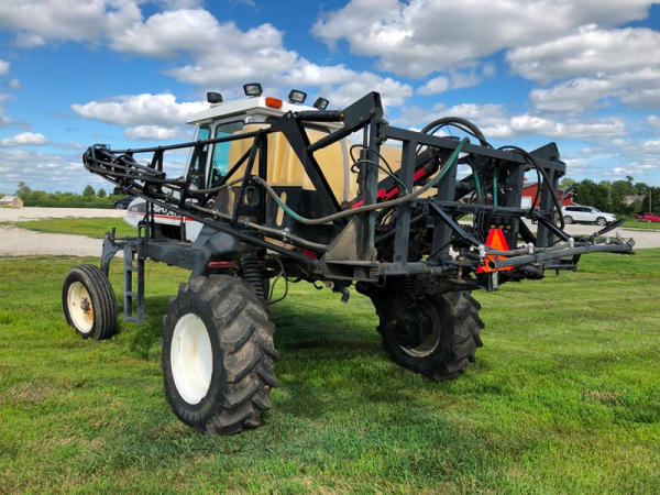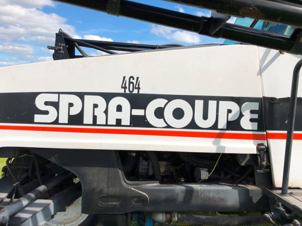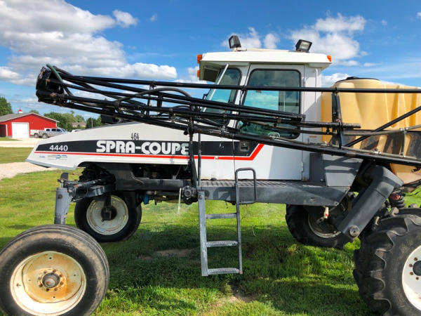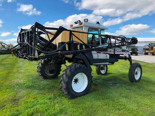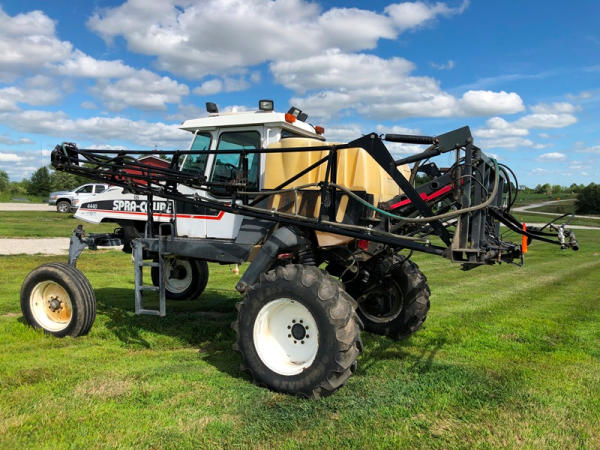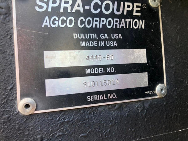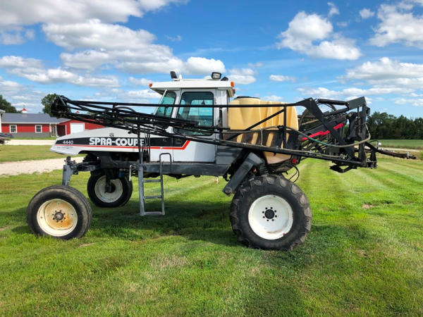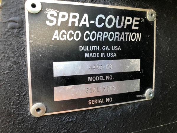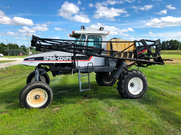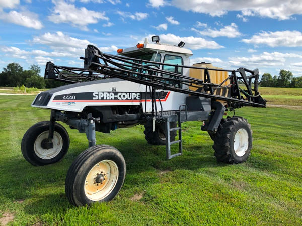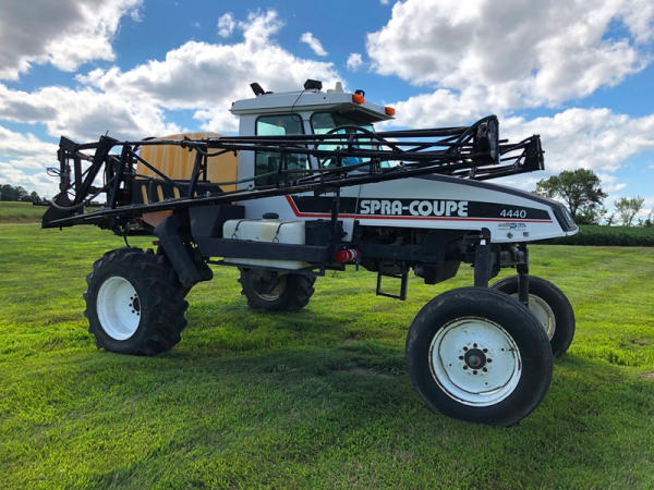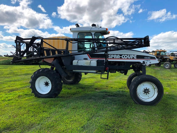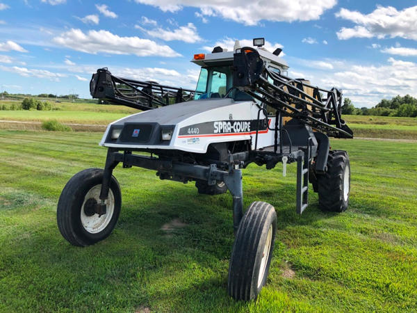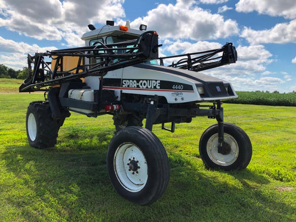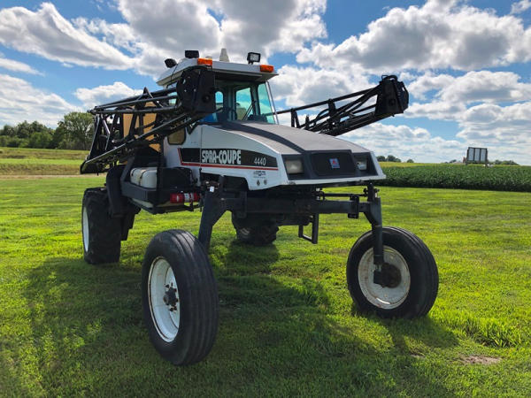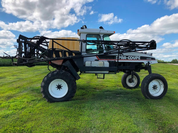 2000 Spra-Coupe 4440 Sprayer (NP8849, Unit 464), Diesel engine, 5 speed manaul transmission, heat, air conditioning, Am/Fm radio, 400 gallon poly liquid system, 60' boom, 20" spacing, 45 gallon poly side mount tank, 9.00-24 front tires, BKT 380/85R24 rear tires, Raven controller, shows 2,505 hours.