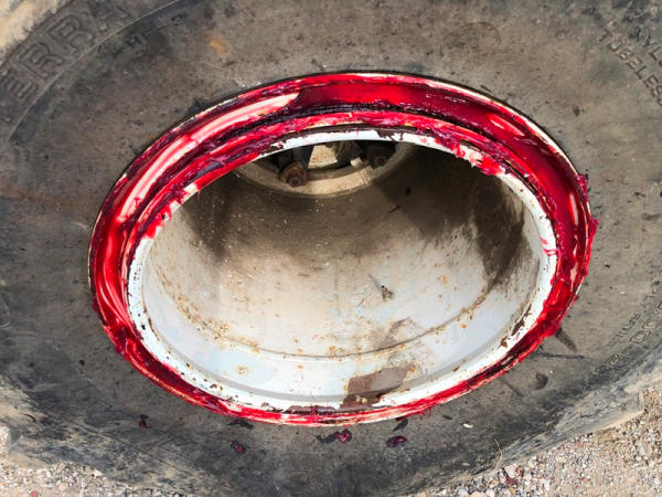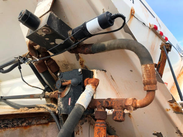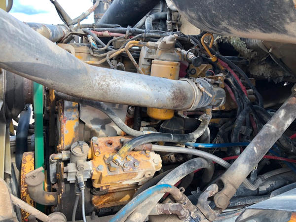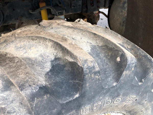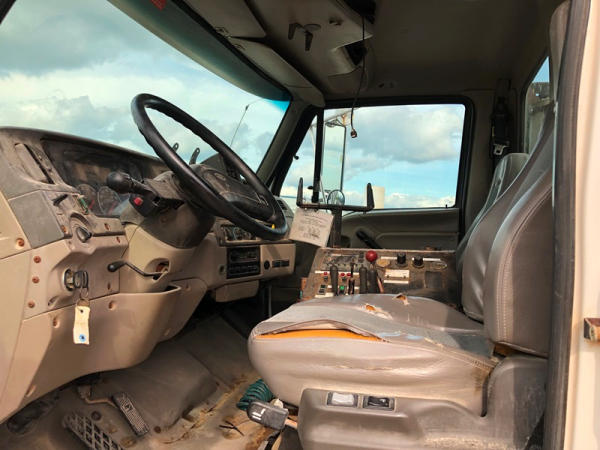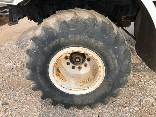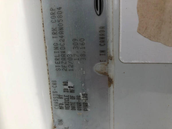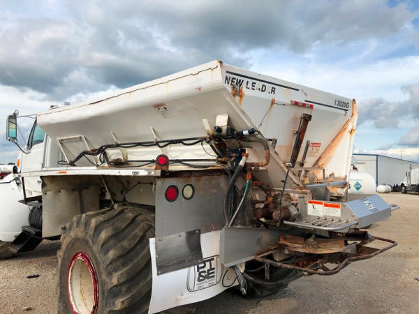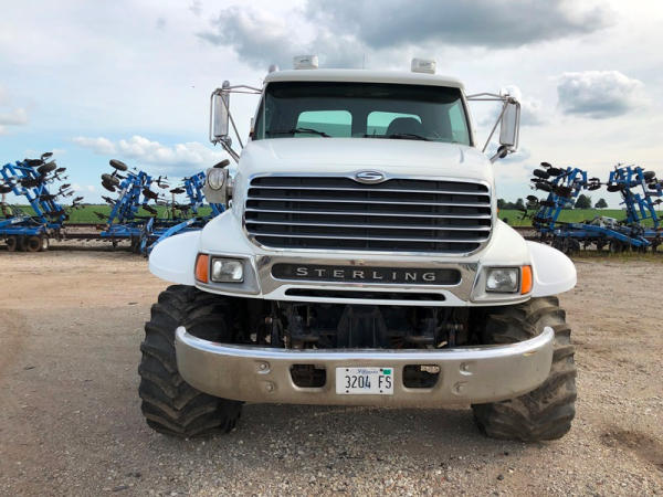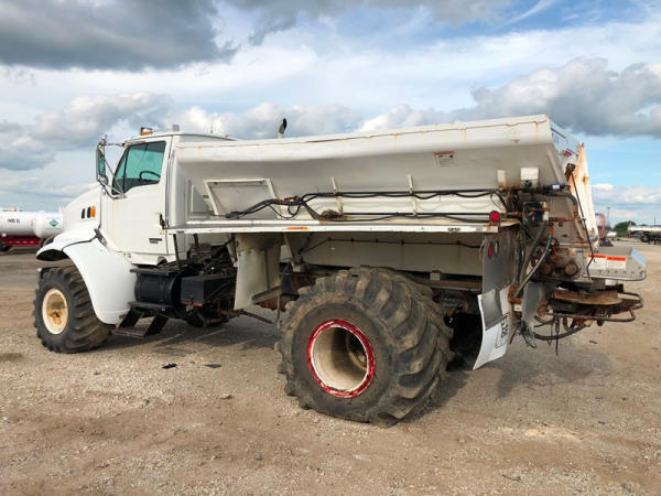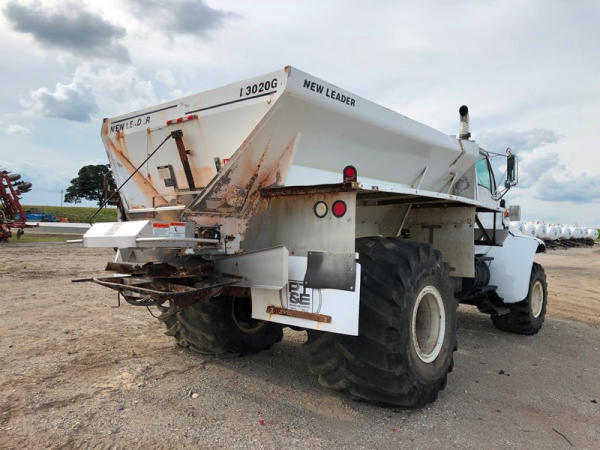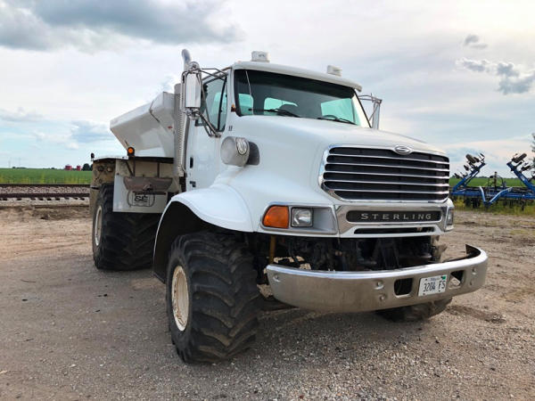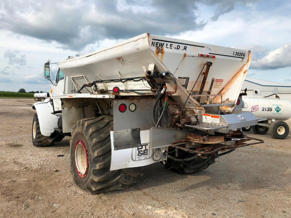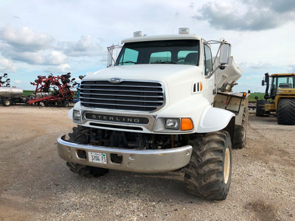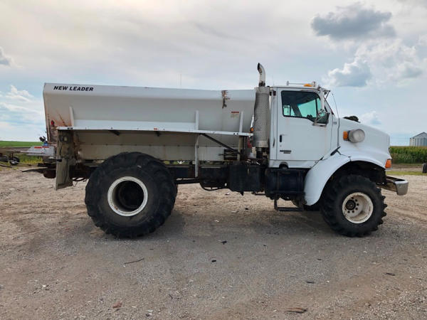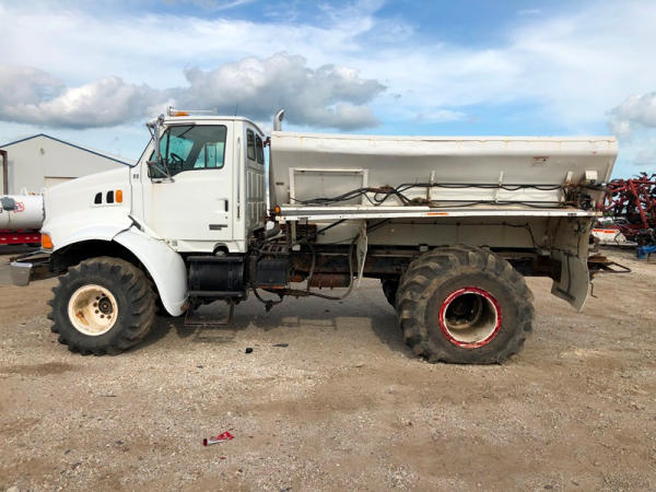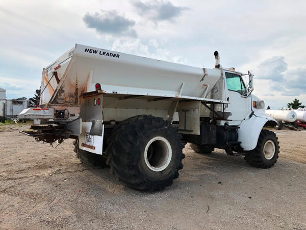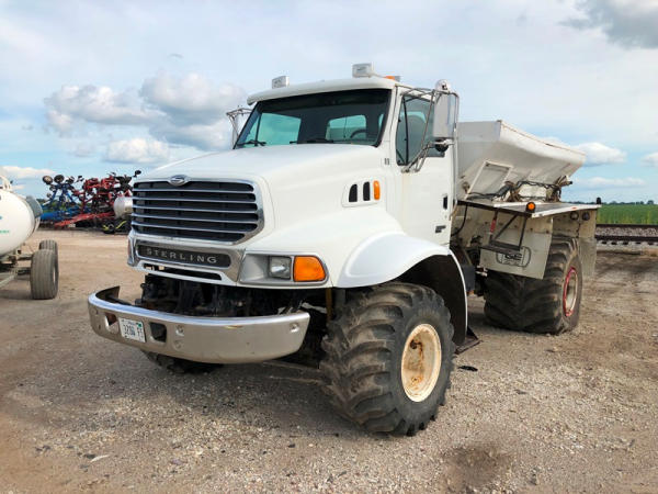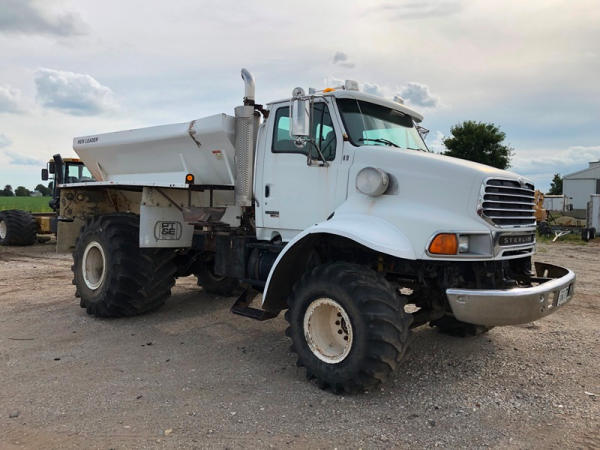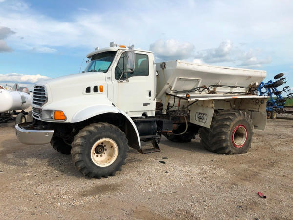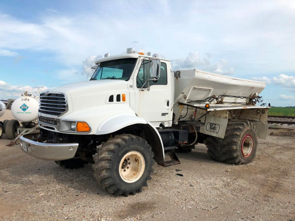 2004 Sterling Dry Floater (NP8881, Unit 89), Cat C7 diesel engine, automatic transmission, heat, air conditioning, Am/Fm radio, cruise, New Leader L3020 G4 - 13 dry spreader box (S/N 117426), hydraulic, dual spinners, 48x25.00-20 front tires, 66x43.00-25 rear tires (1 tire is flat and 1 tire has bead busted), GVWR 38,160lbs, shows 5,625 hours.