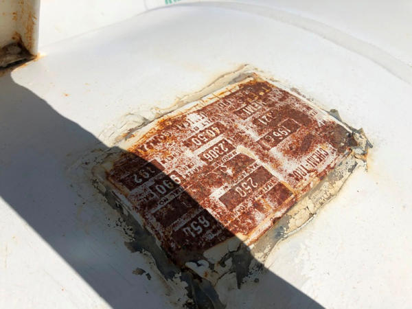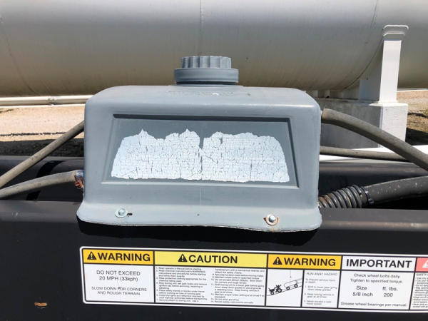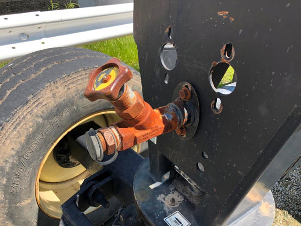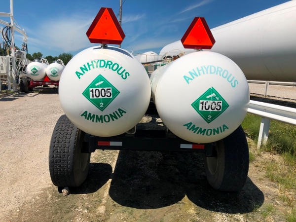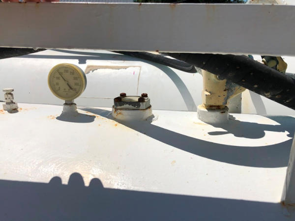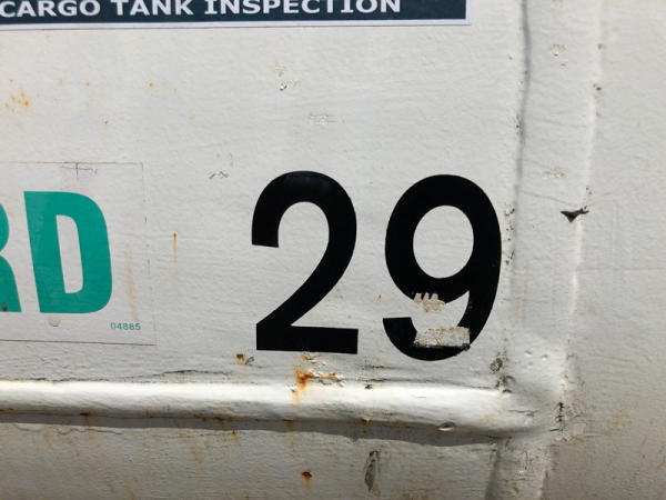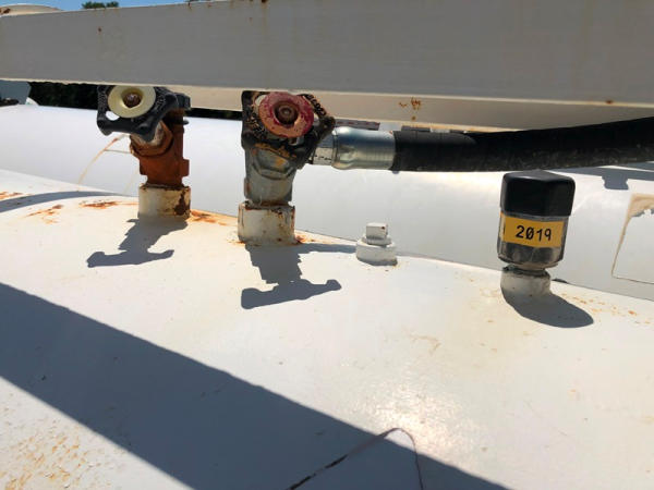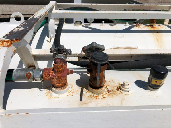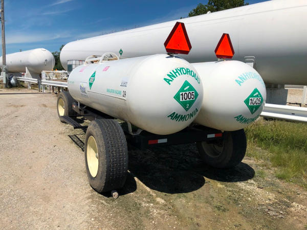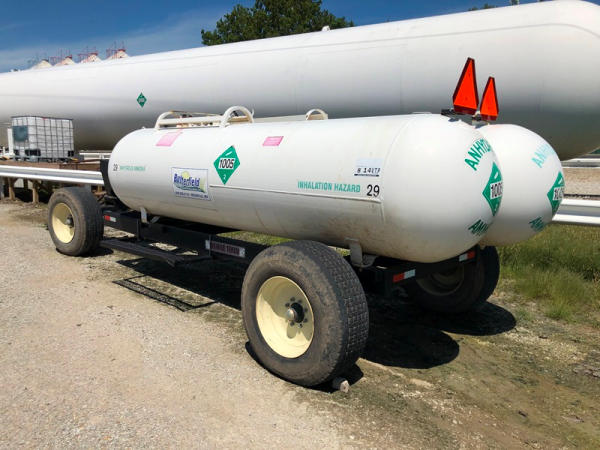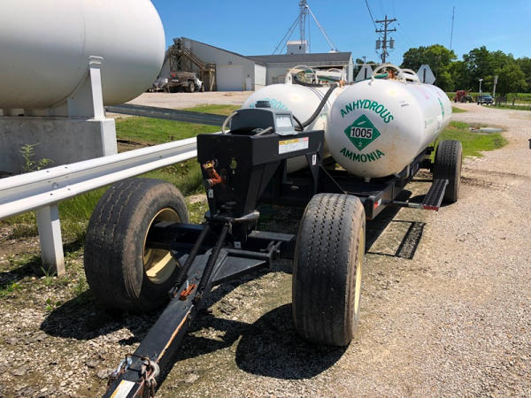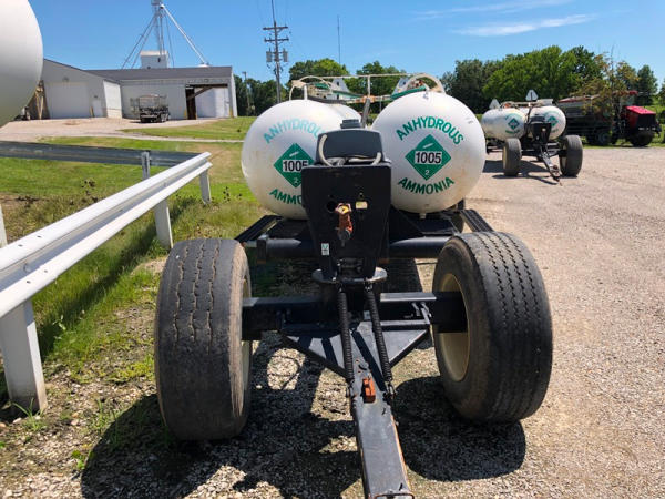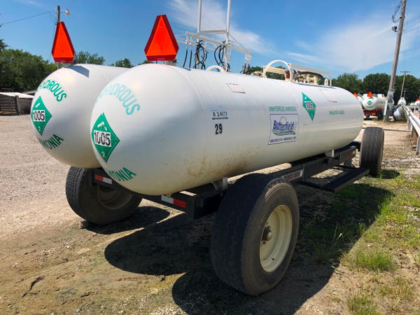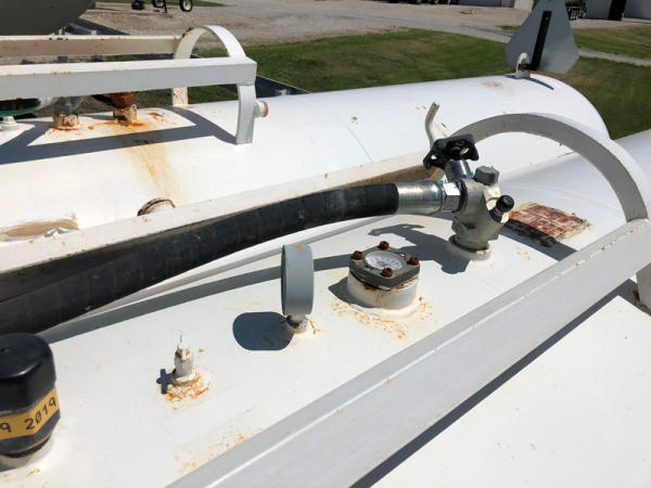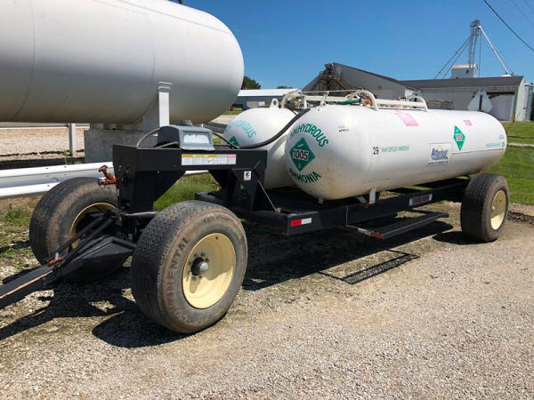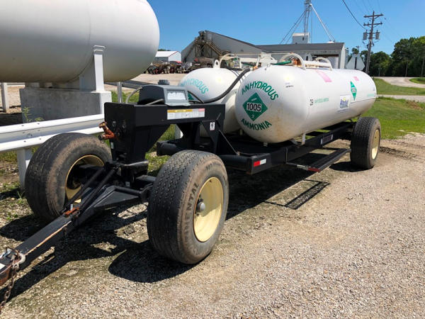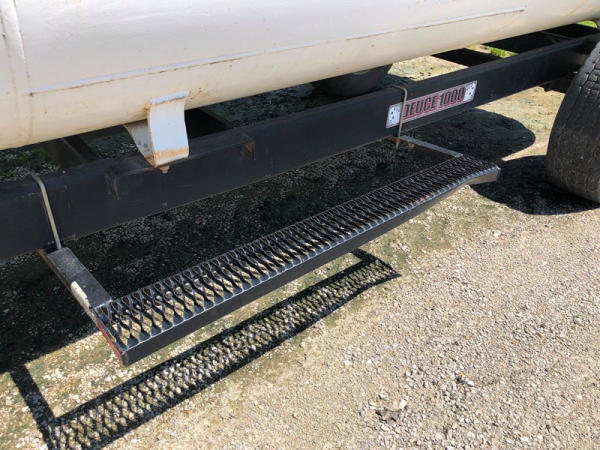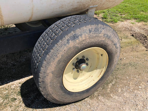 Double NH3 Tanks (NP8840, Tank 29), 1,000 gallon capacity, top front fill, water tank, CIRCLE K "Deuce 1000" double tank running gear, spring loaded tongue, side steps, 385/65R22.5 tires, inspection tag, Tank 1 - data plate, Tank 2 - NO date plate.