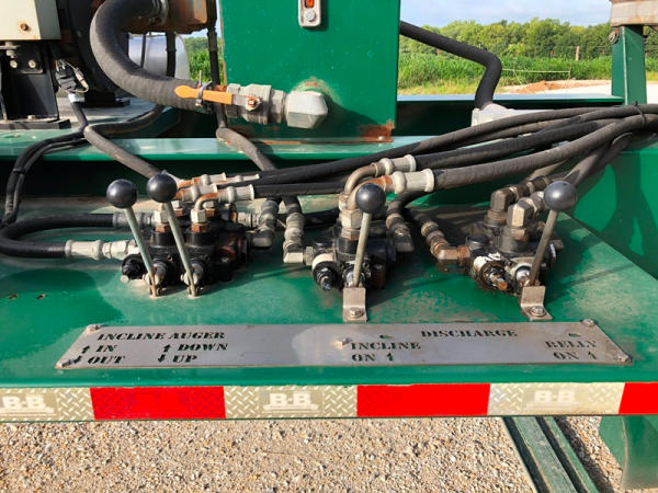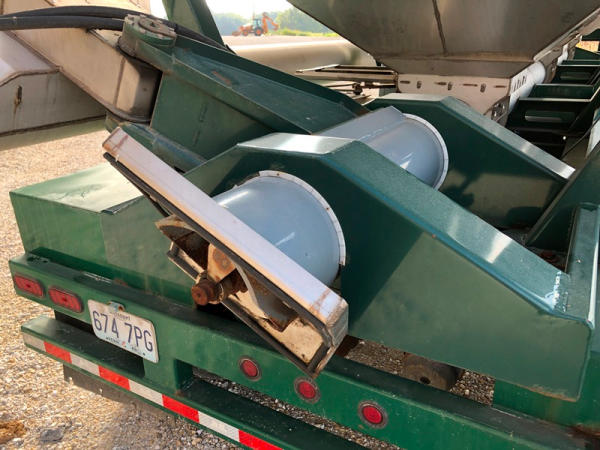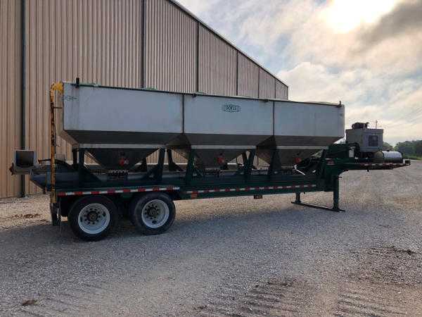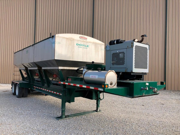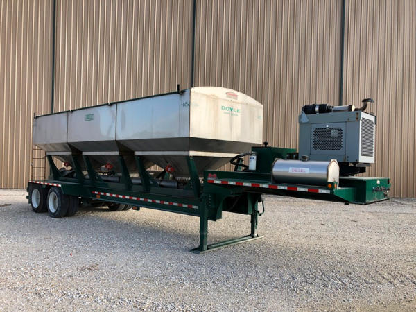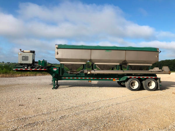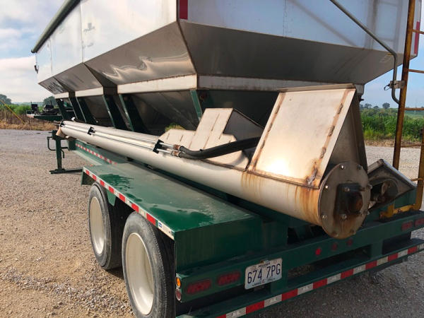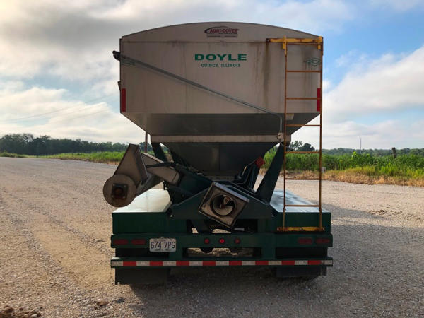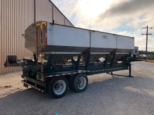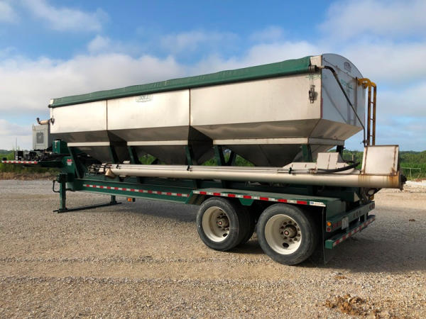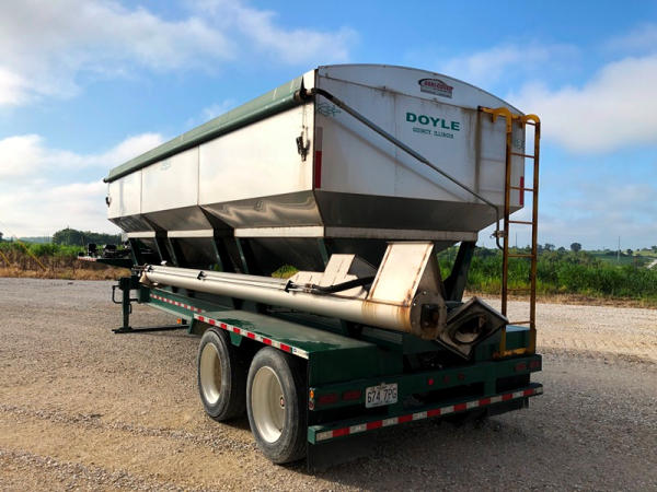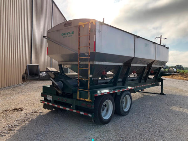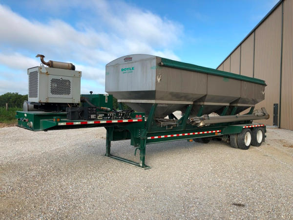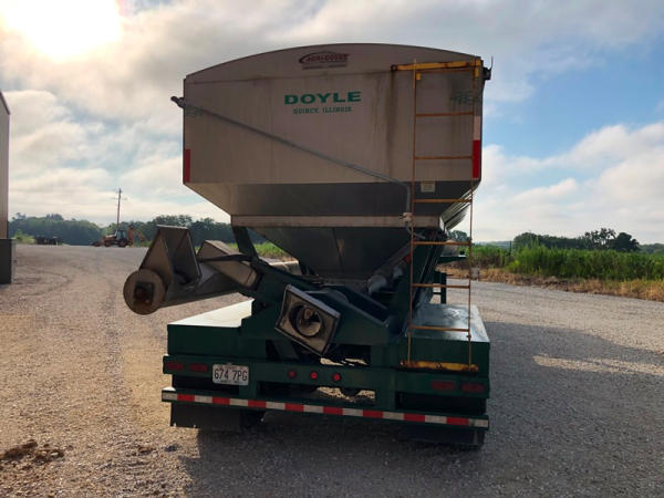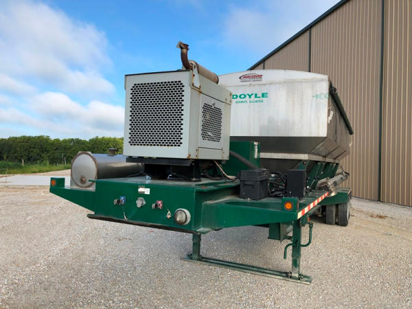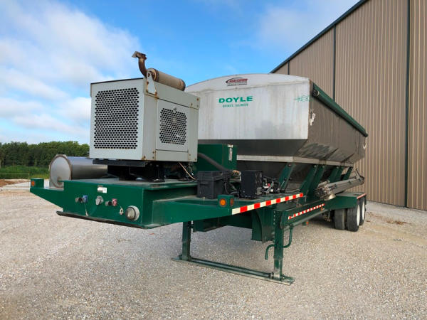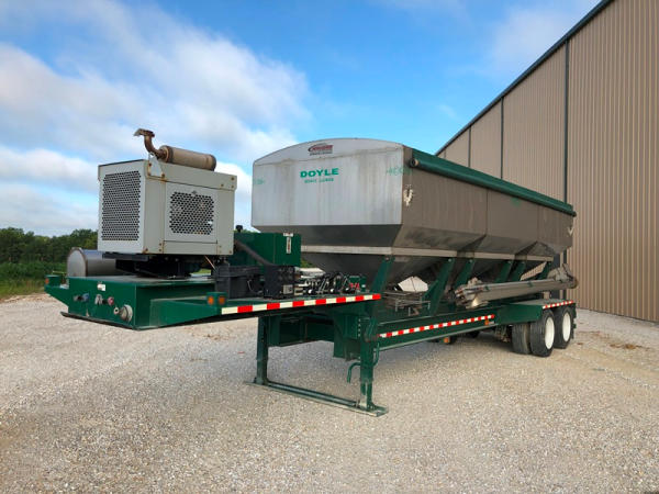 2015 Doyle Dry Tender Trailer (NP8857), 24 ton capacity, 3 compartment (8-8-8), 304 stainless steel, side discharge auger, (3) Vibco vibrators, Agri-Cover SRT-2 spool roll tarp, incline/discharge auger controls, rear ladder, 2014 Kubota 3.6L water cooled diesel engine, 22 gallon diesel tank, 52 gallon hydraulic tank, LOFA Industries, Inc. electric start control panel, shows 170 hours, mounted on 2015 B&B semi trailer, Model DDT24 TANDEM TRA/REM, tandem axle, spring suspension, Haldex ABS, 255/70R22.5 tires, GVWR 60,000lbs.