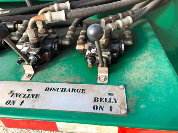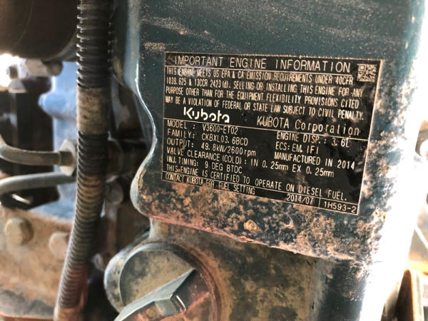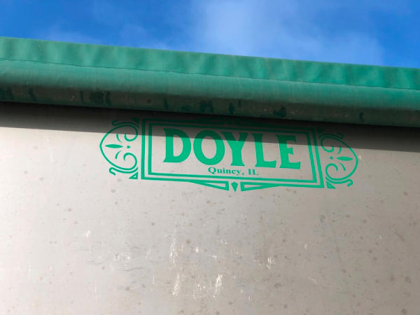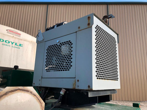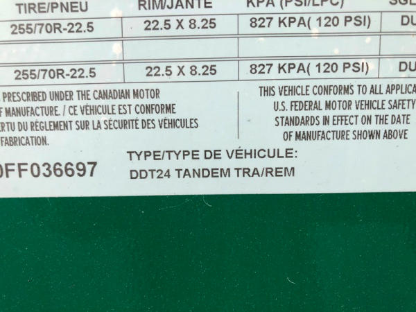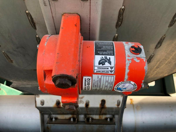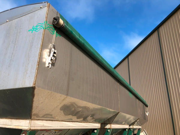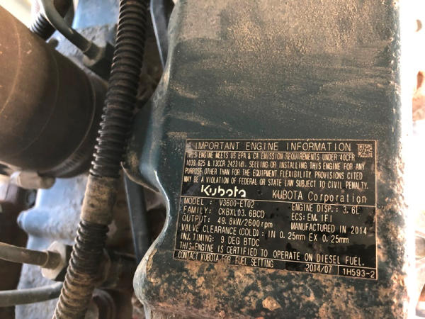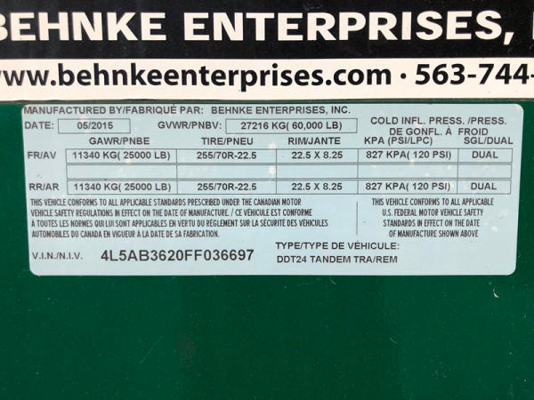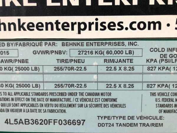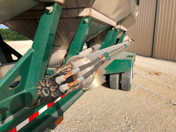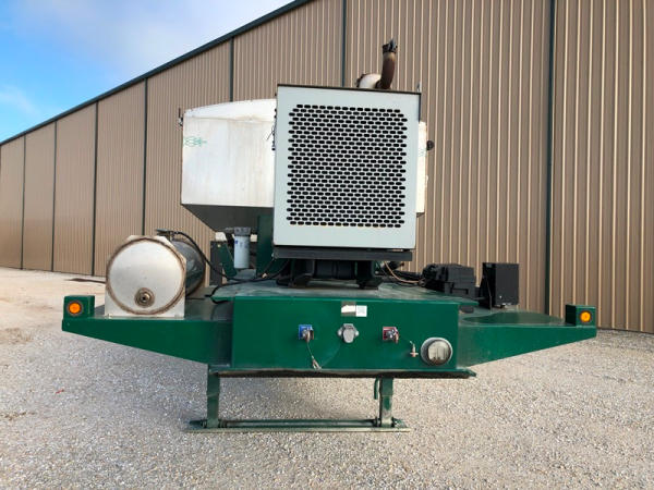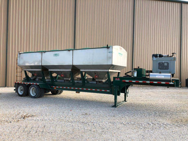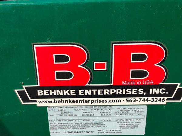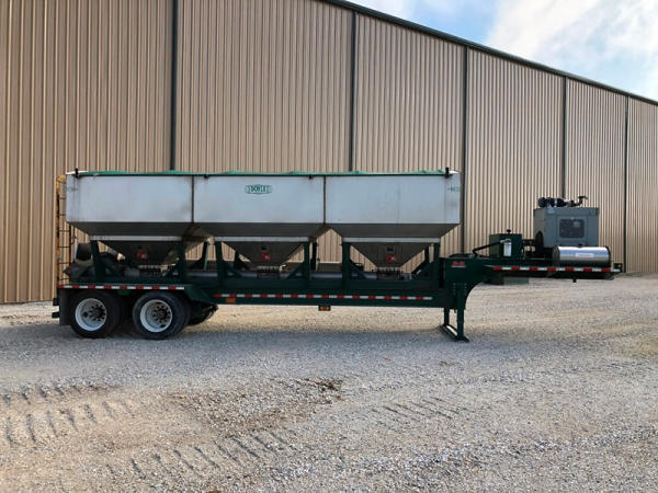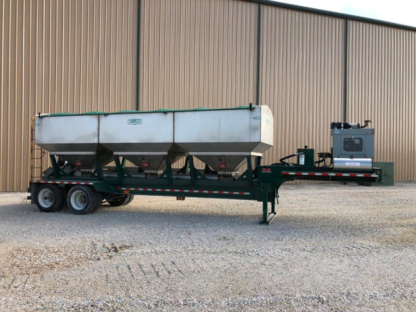 2015 Doyle Dry Tender Trailer (NP8857), 24 ton capacity, 3 compartment (8-8-8), 304 stainless steel, side discharge auger, (3) Vibco vibrators, Agri-Cover SRT-2 spool roll tarp, incline/discharge auger controls, rear ladder, 2014 Kubota 3.6L water cooled diesel engine, 22 gallon diesel tank, 52 gallon hydraulic tank, LOFA Industries, Inc. electric start control panel, shows 170 hours, mounted on 2015 B&B semi trailer, Model DDT24 TANDEM TRA/REM, tandem axle, spring suspension, Haldex ABS, 255/70R22.5 tires, GVWR 60,000lbs.