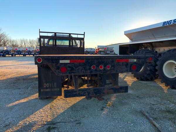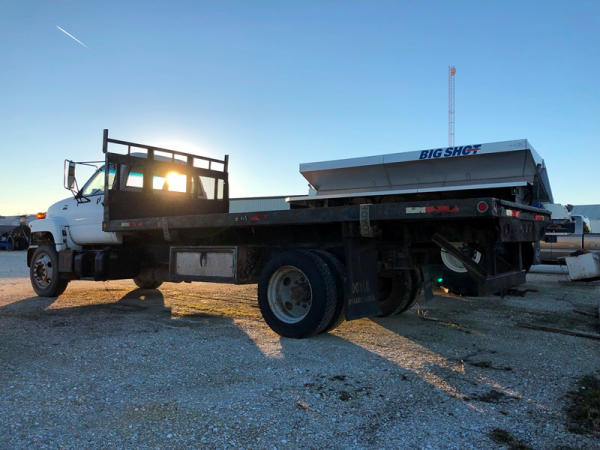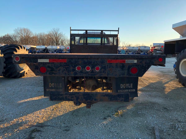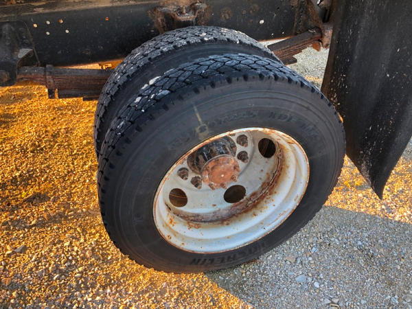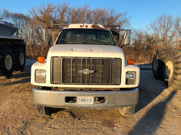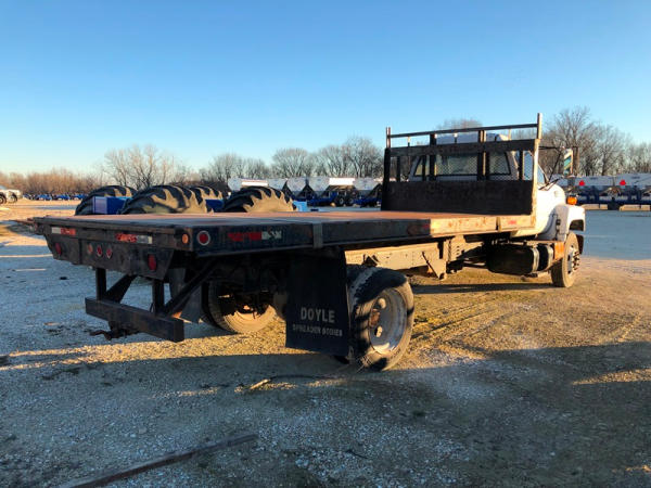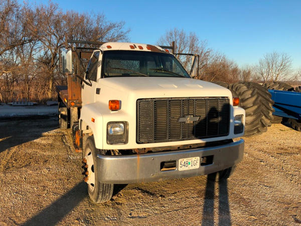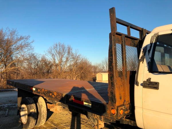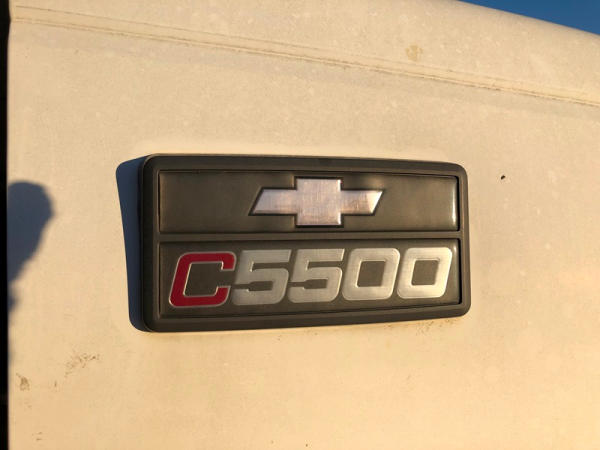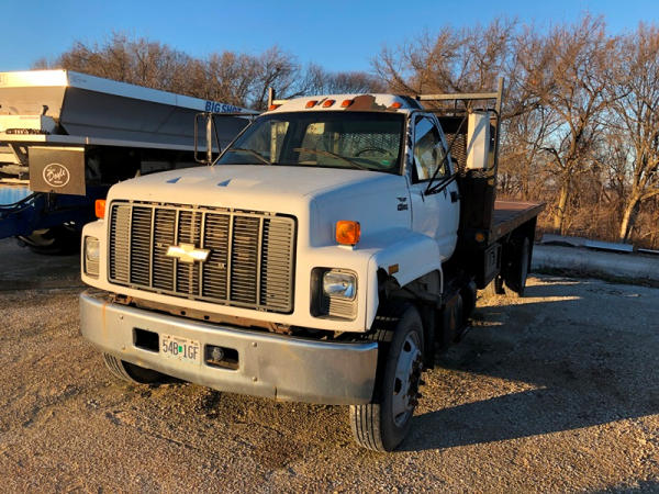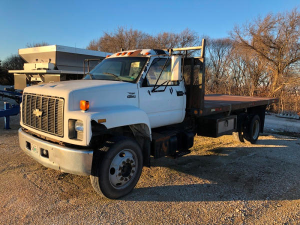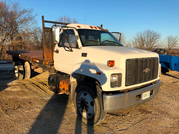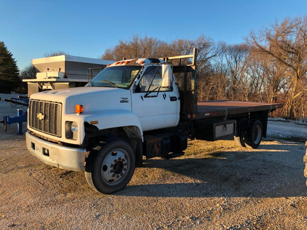 1997 Chevy C5500 Flatbed Truck (NP8883), Cat 3116 diesel engine (170 HP), 5 speed transmission, heat, Am/Fm radio, single axle, spring suspension, steel flatbed (S/N 102991-4), dual hoist, 235/80R22.5 tires, shows 320,772 miles.