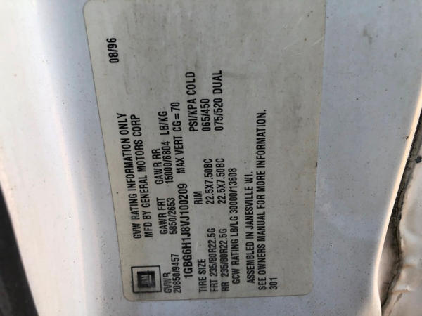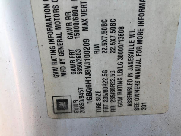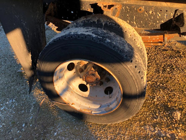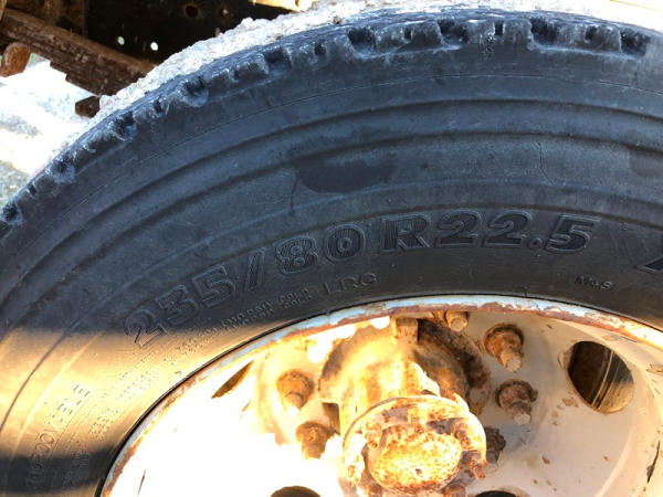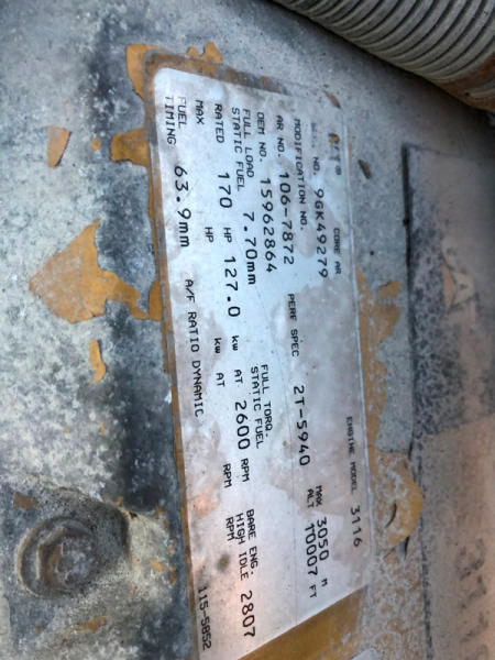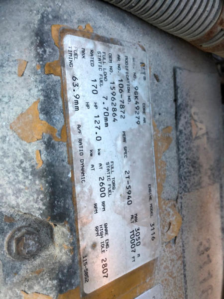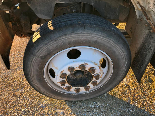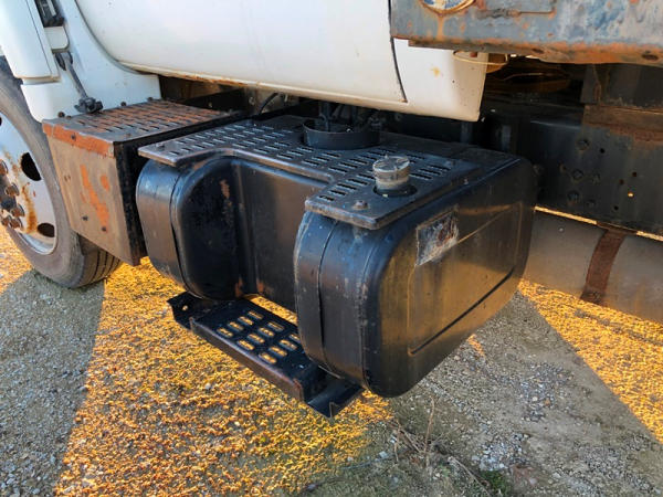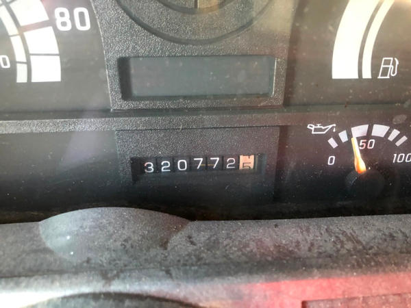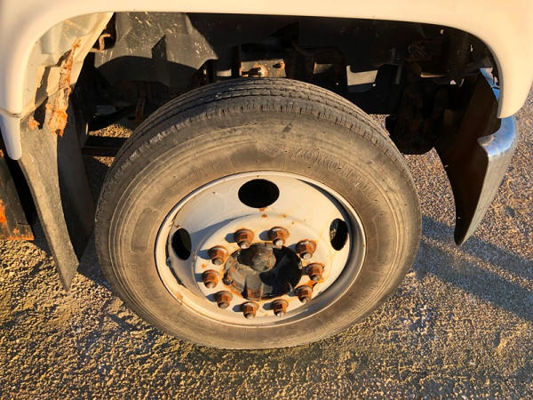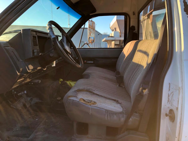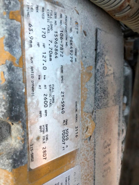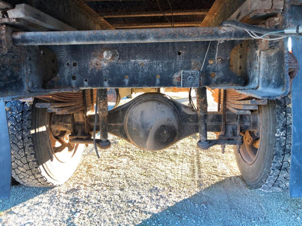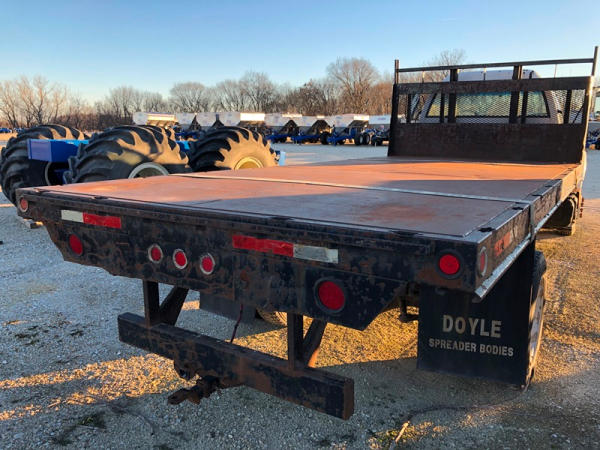 1997 Chevy C5500 Flatbed Truck (NP8883), Cat 3116 diesel engine (170 HP), 5 speed transmission, heat, Am/Fm radio, single axle, spring suspension, steel flatbed (S/N 102991-4), dual hoist, 235/80R22.5 tires, shows 320,772 miles.