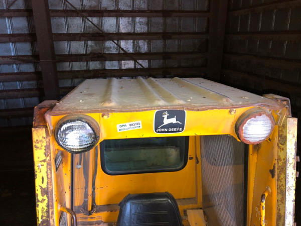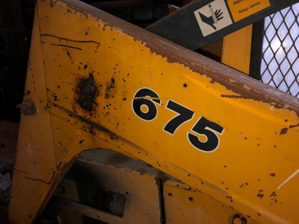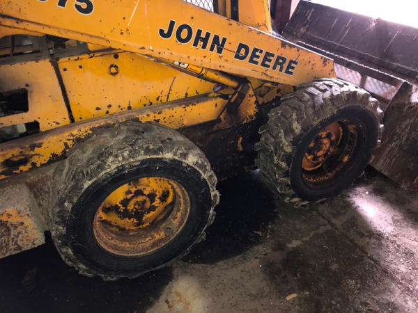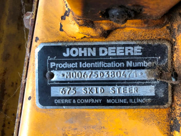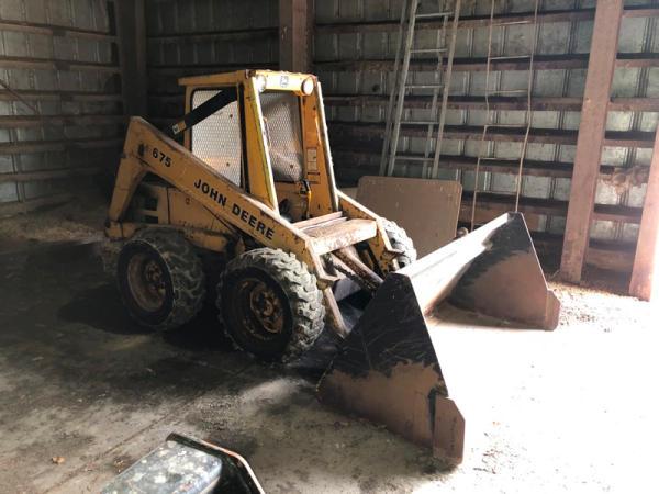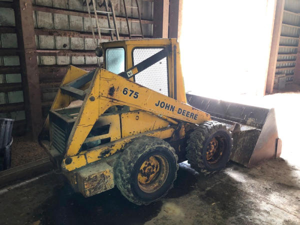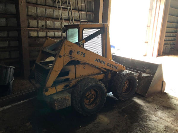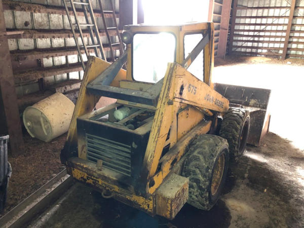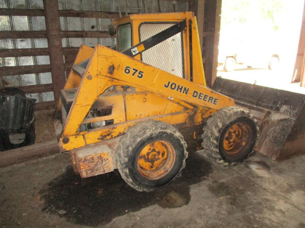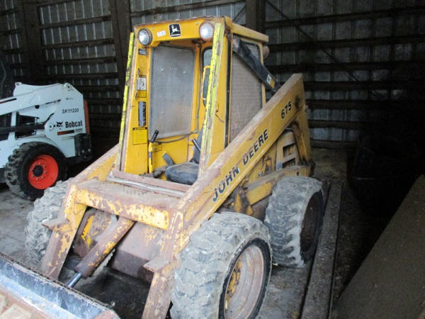 John Deere 675 Skid Steer (DR3135), diesel engine, enclosed cab on 3 sides, rubber tire, 6' bucket, 10-16.5 tires, shows 3,713 hours.