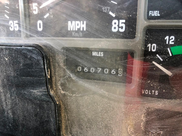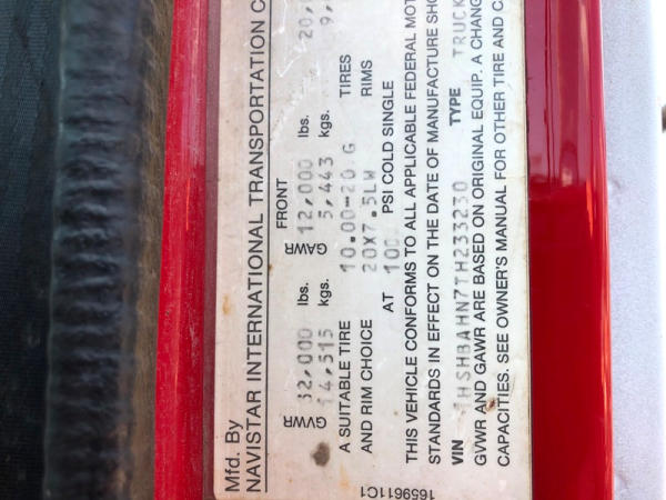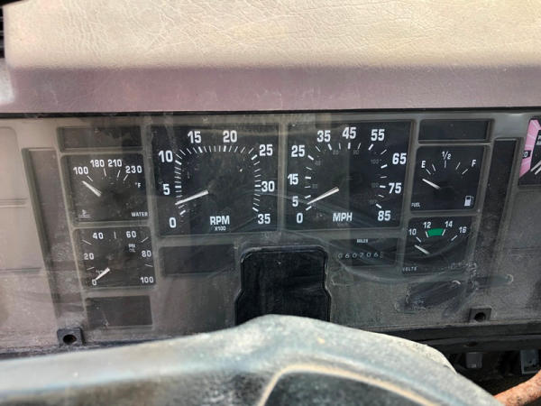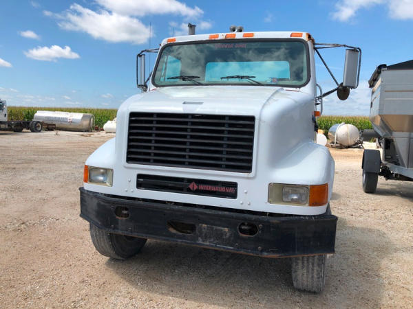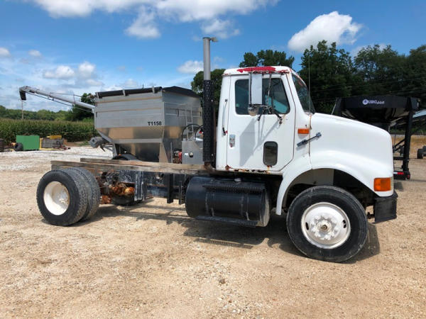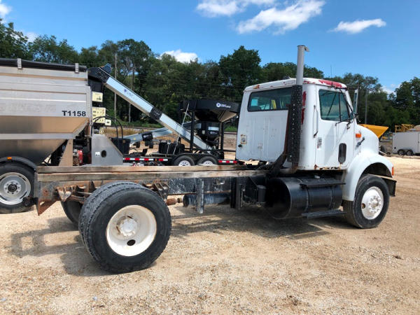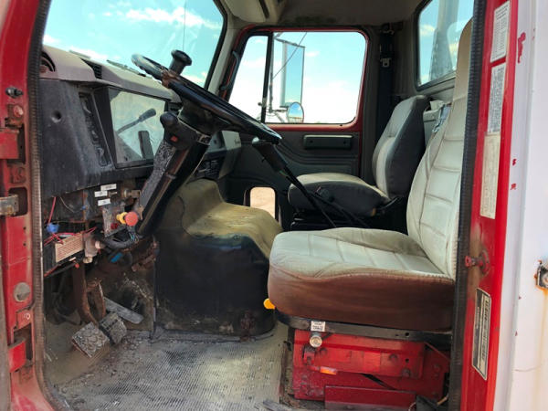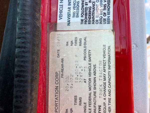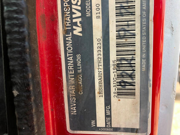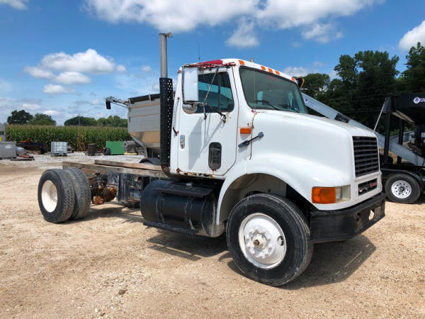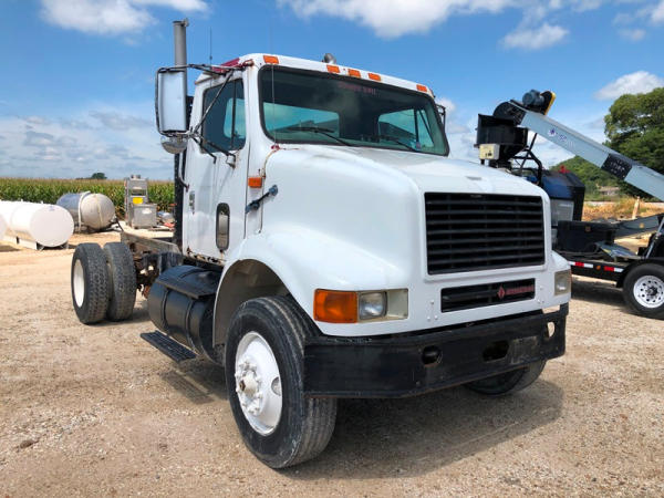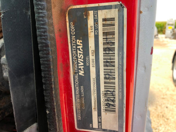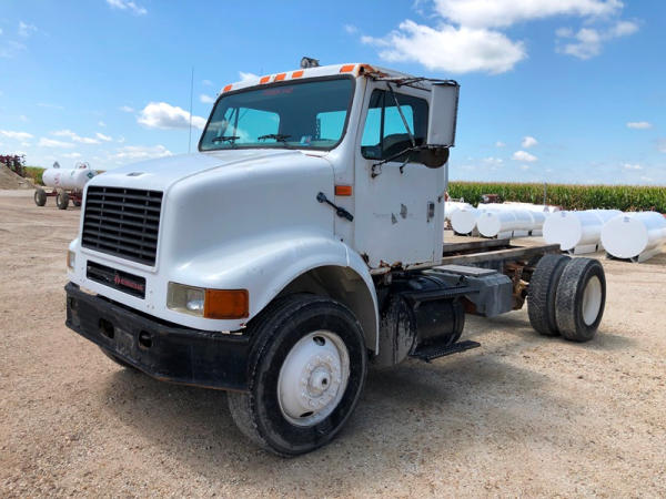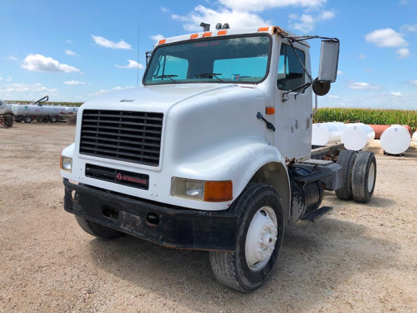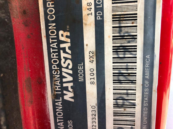 1996 International 8100 Cab/Chassis (NP8868), diesel engine, International 9 speed transmission, heat, air conditioning, Am/Fm radio, cruise, single axle, spring suspension, 295/75R22.5 tires, rear pintle hitch, GVWR 32,000lbs, shows 60,706 miles.