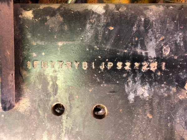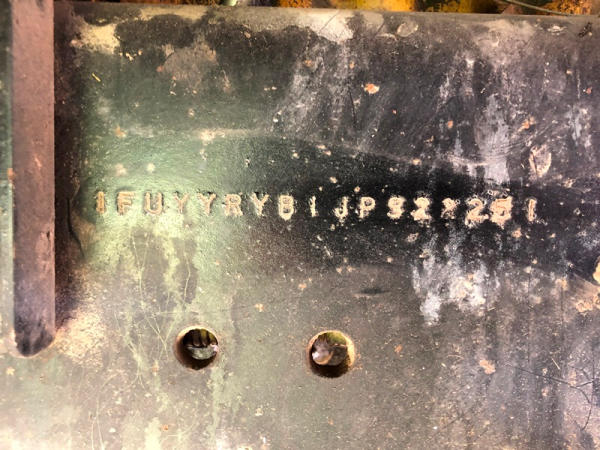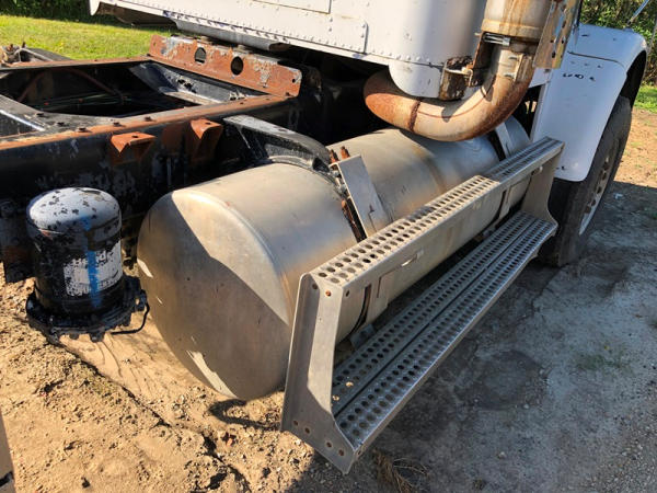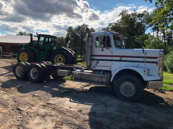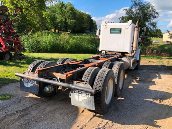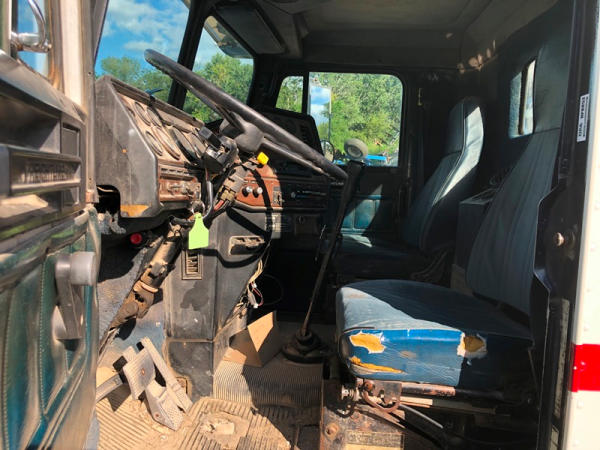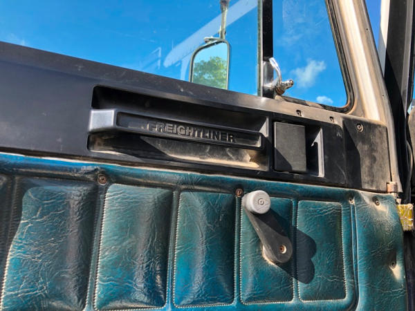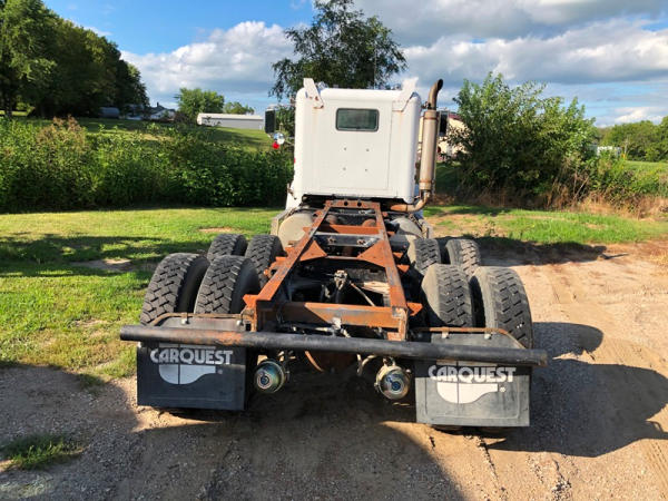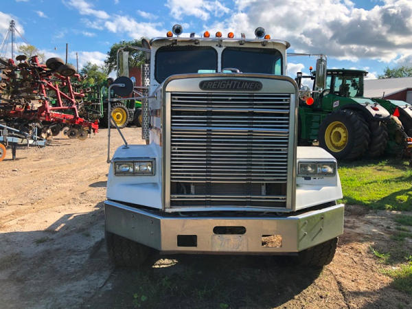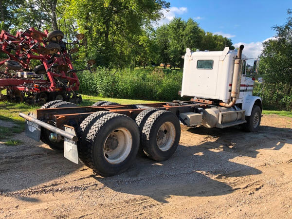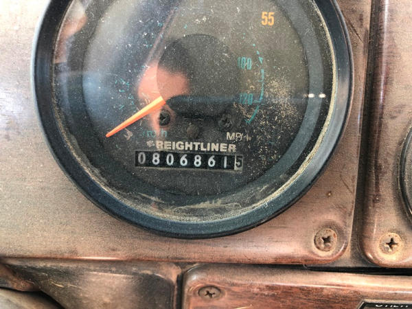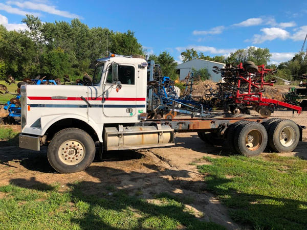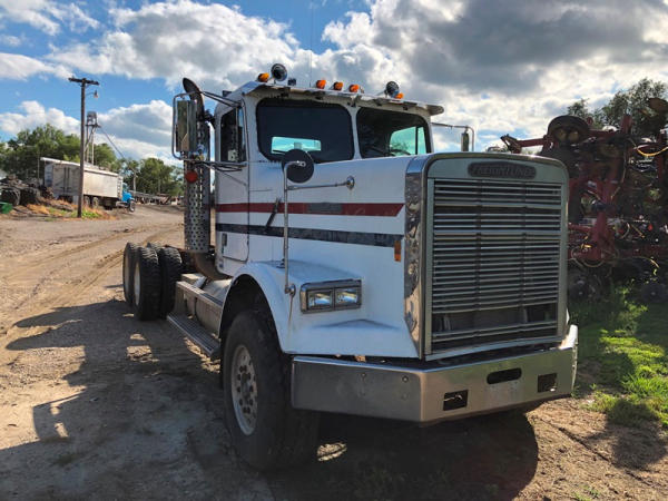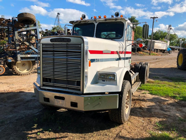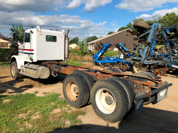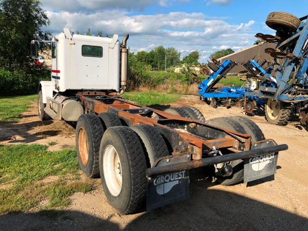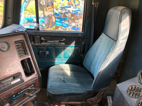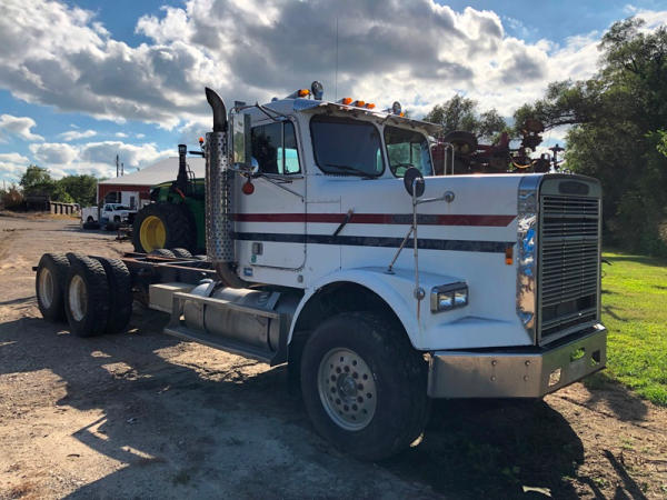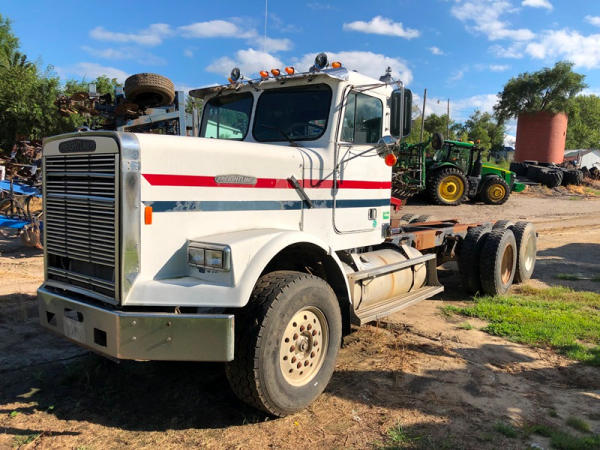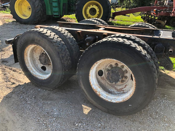 1988 Freightliner Cab/Chassis (NP8853, Unit 596), Caterpillar 3406B diesel engine, Eaton Fuller 9 speed transmission, heat, air conditioning, Am/Fm radio, tandem axle, spring suspension, 385/65R22.5 front tires, 11R24.5 rear tires, dual fuel tanks, shows 806,861 miles.