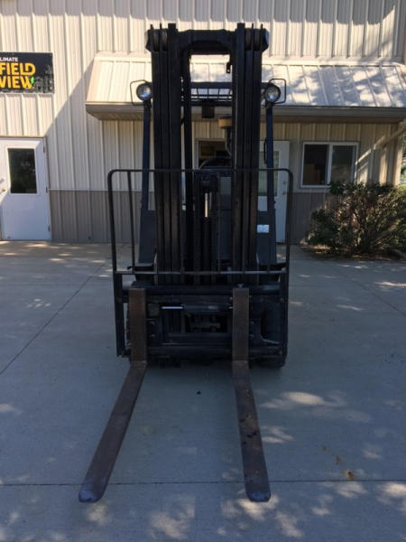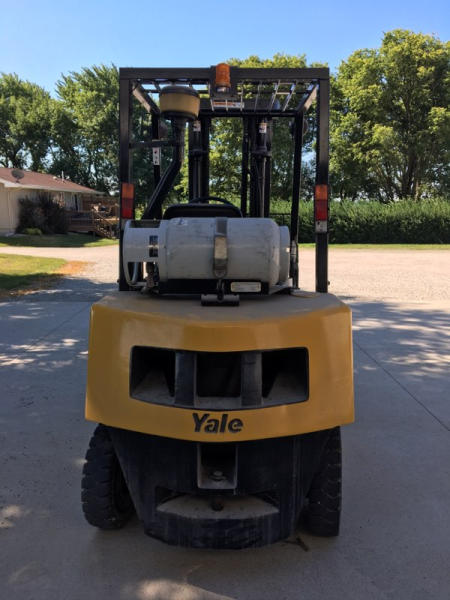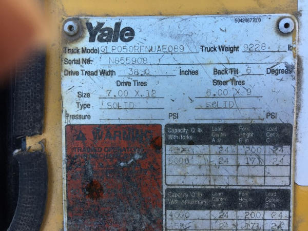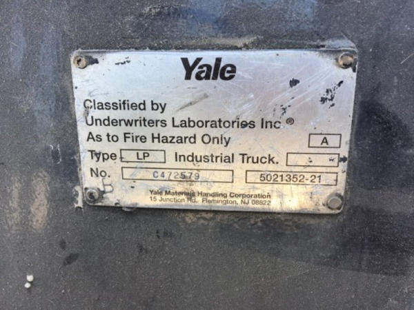 Yale GLP050 Forklift (KMK996), model: GLP050RFNUAE089, LP gas engine, shuttle shift transmission, 5000 lift capacity, 48" forks, canopy, lights, side shift, truck weight 9,228 lbs., back tilt 6 degrees, 38" drive tread width, foam filled solid tires, 7.00-12 drive tires, 6.00-9 steer tires, shows 7,814 hours.