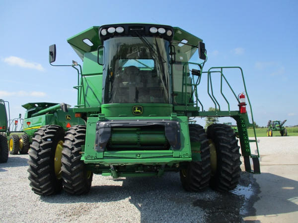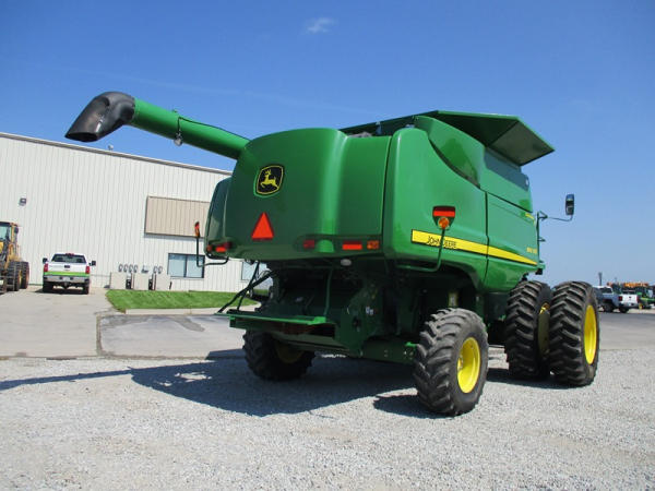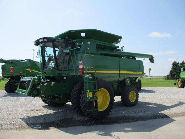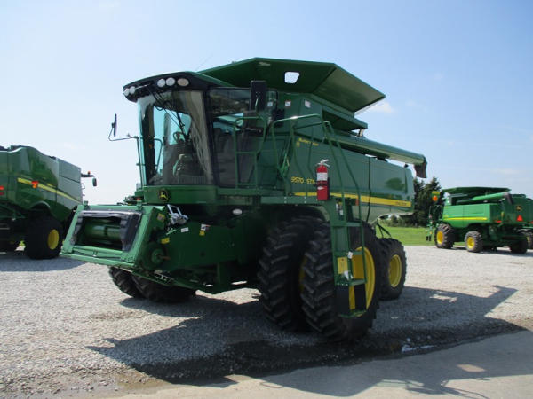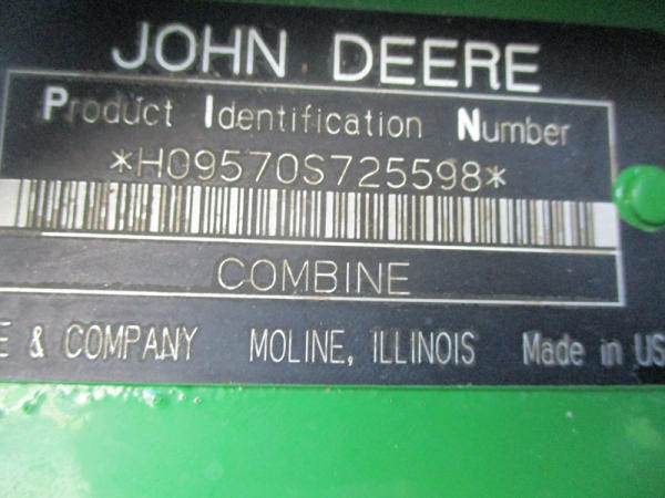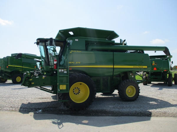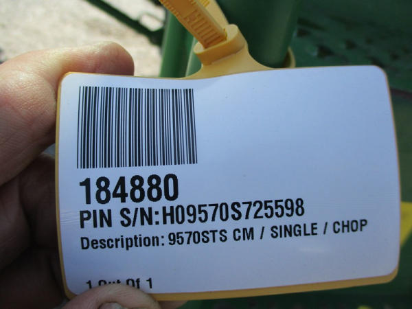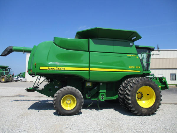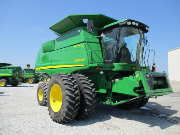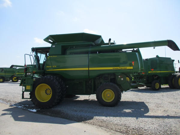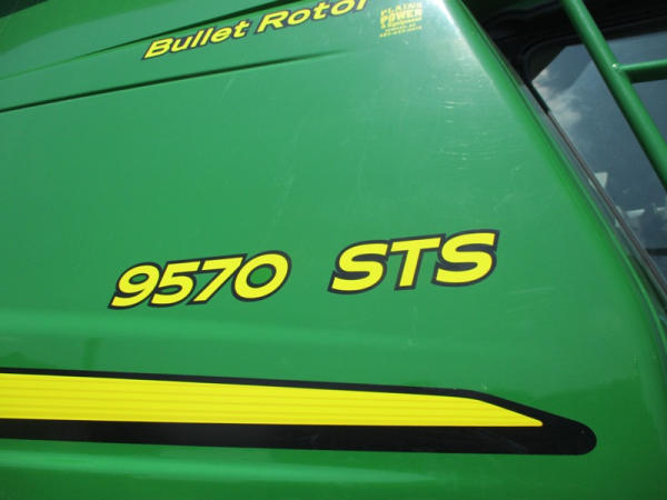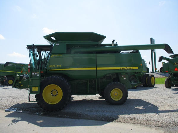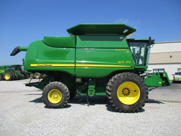 2008 John Deere 9570 STS Combine (DR3142, Unit 184880), John Deere diesel engine, hydrostatic drive, premier cab, grain tank extensions, 2 speed chopper w/spreader, single point hookup, contour master w/reverser, lateral tilt, Green Star 3 harvest monitor, 6.6 M unloading auger, AM/FM CD radio, cab heat/air conditioning, NEW 520/85R38 front tires & duals 480/85R26 rear tires, shows 2419 engine hours, 1416 seperator hours.