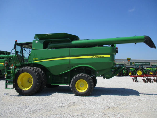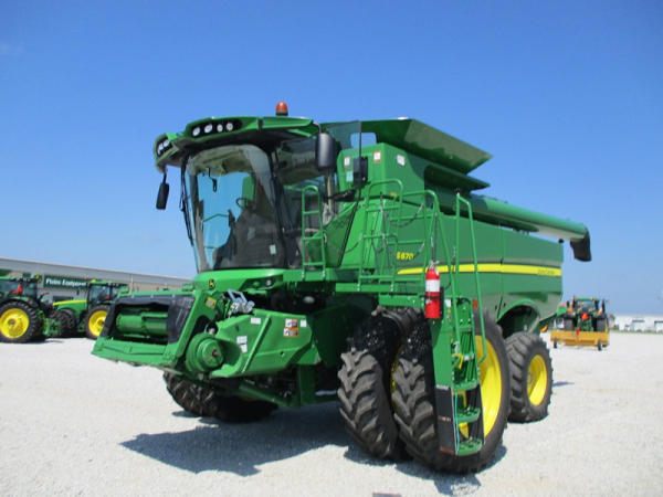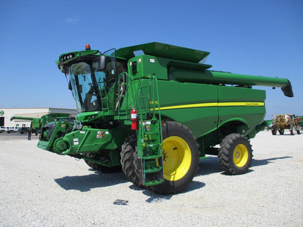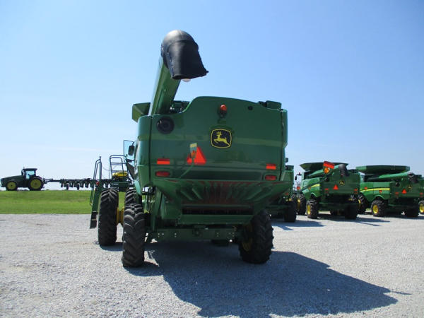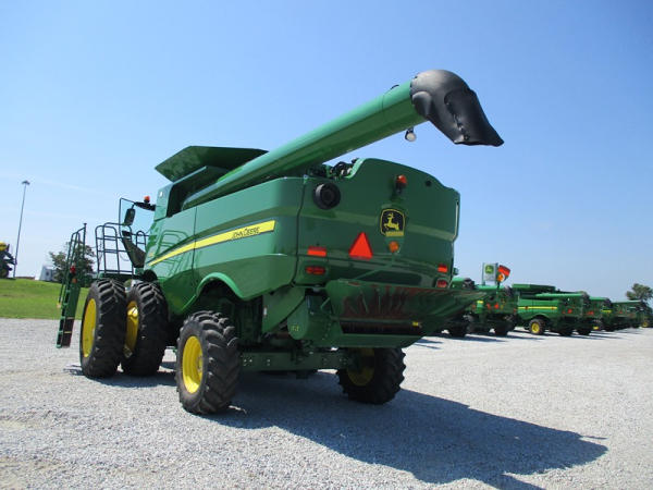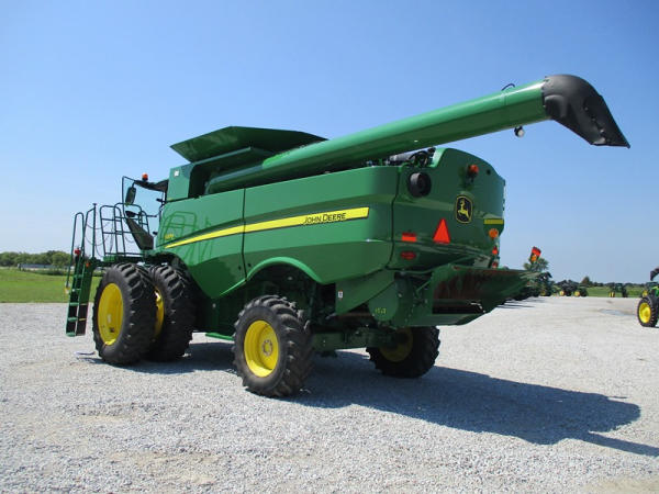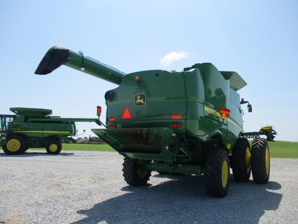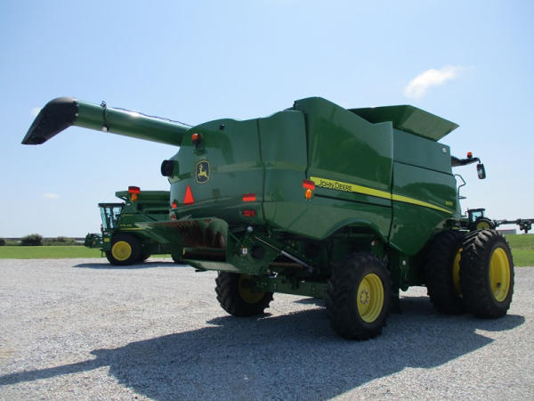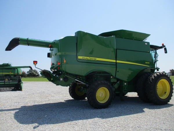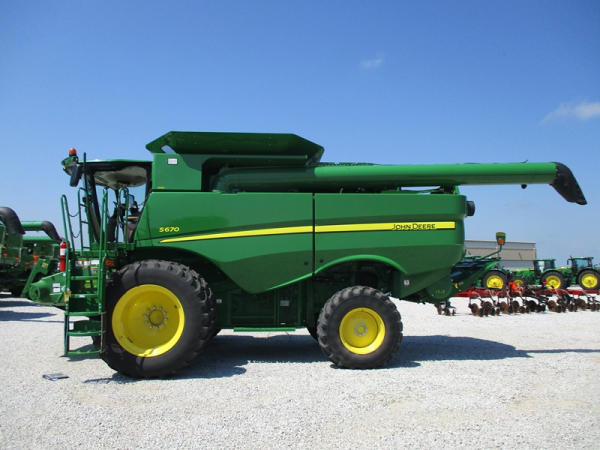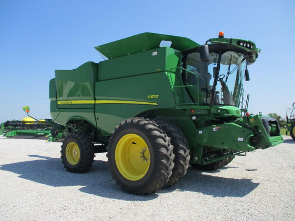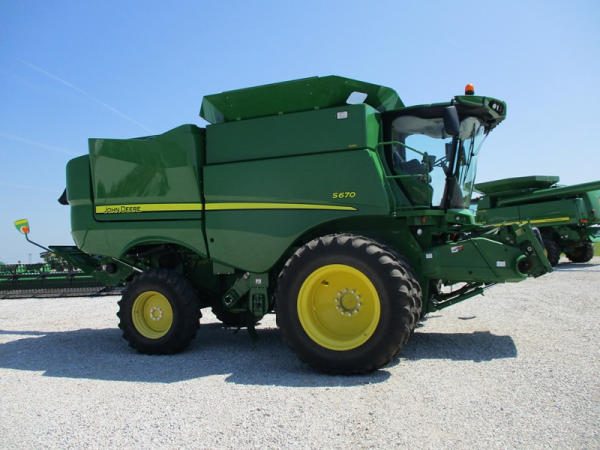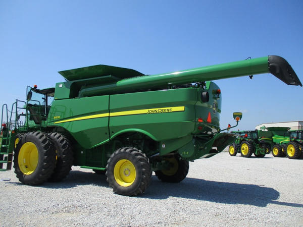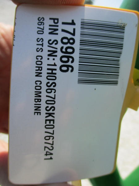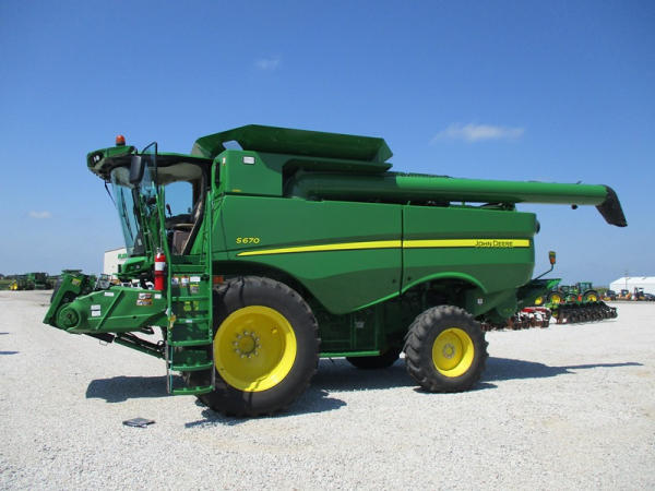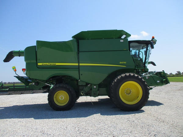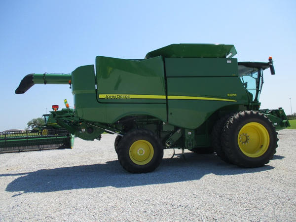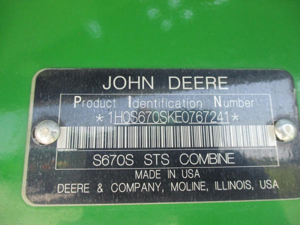 2014 John Deere S670 Combine (DR3144, Unit 178966), John Deere diesel engine, hydrostatic drive, Green Star 3 harvest monitor, grain tank extensions, 6.9M unloading auger, AM/FM radio, cab heat/air conditioning, HID light package, NEW 520/85R42 front tires & duals, 620/75R26 rear tires, shows 1229 engine hours, 862 seperator hours.
