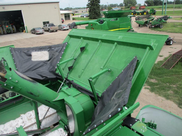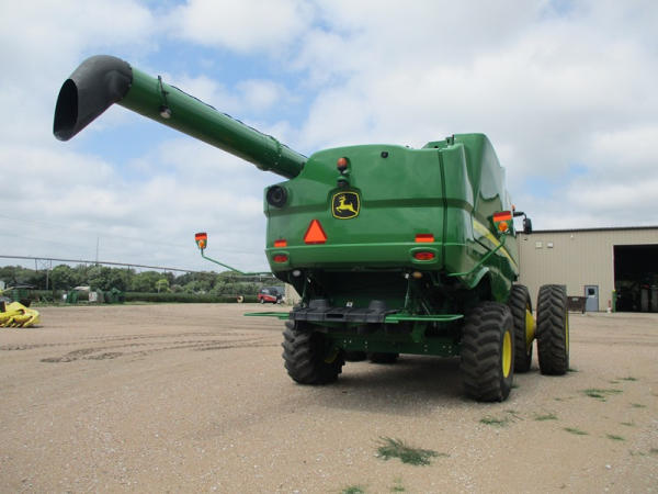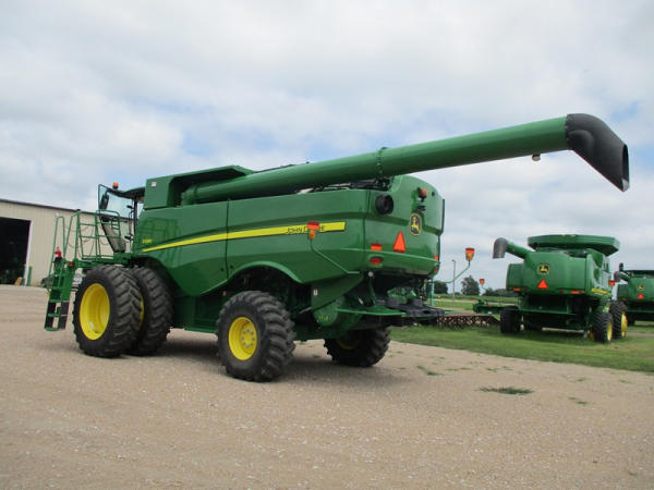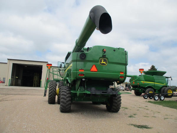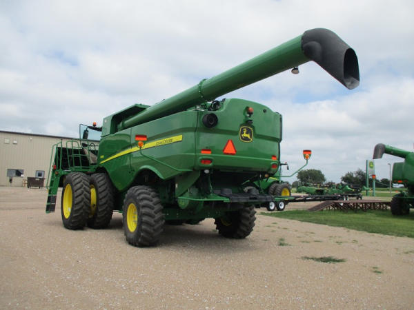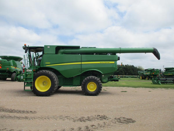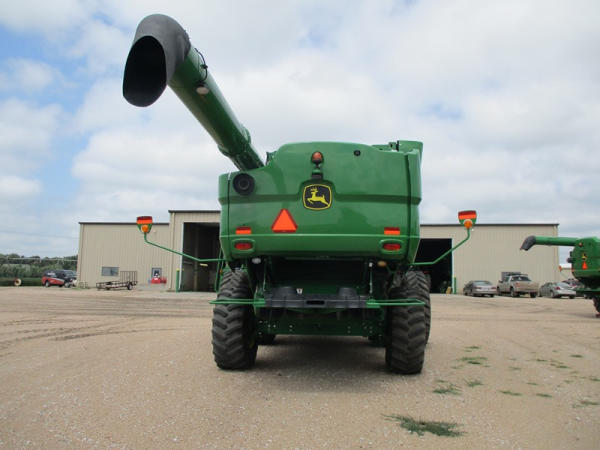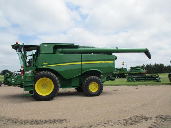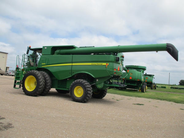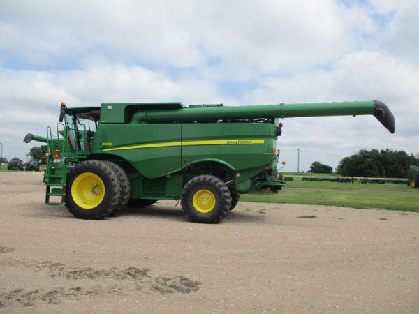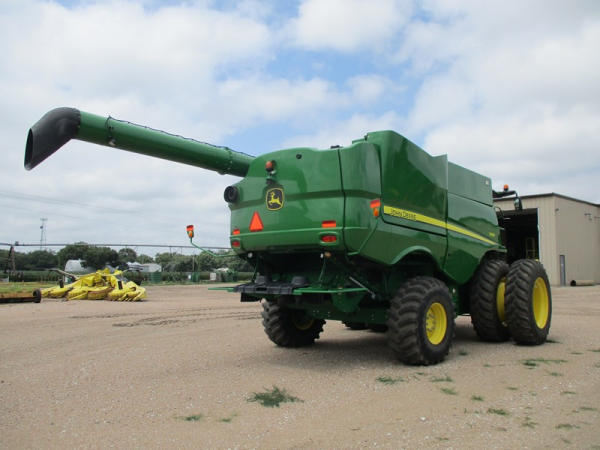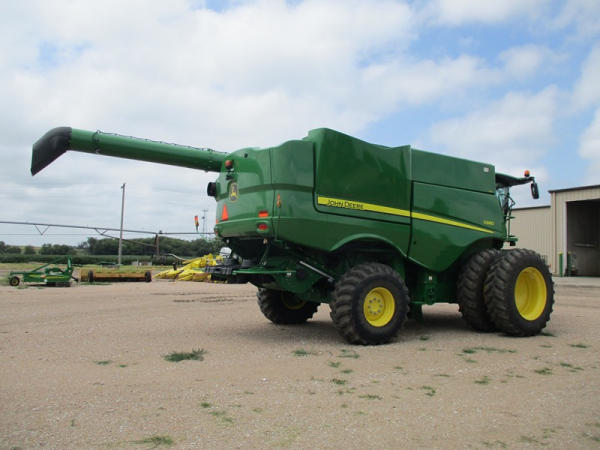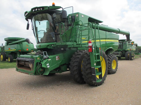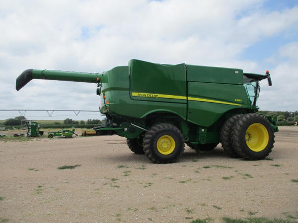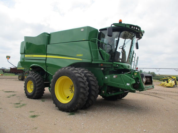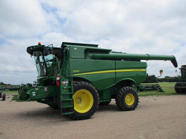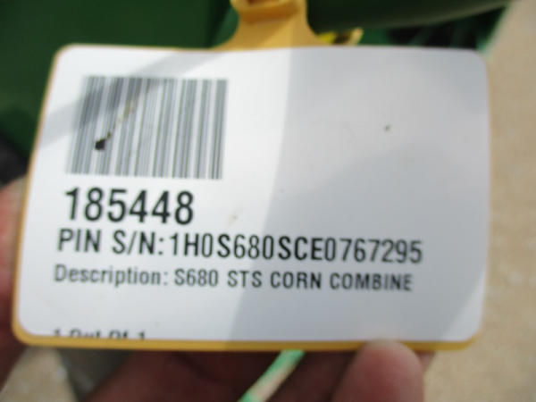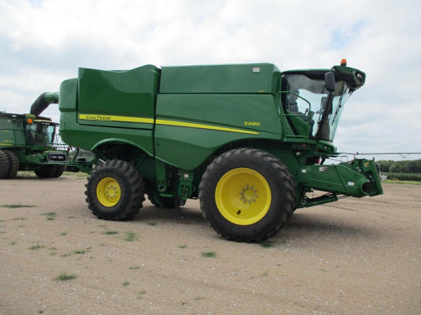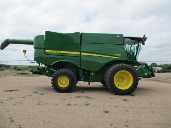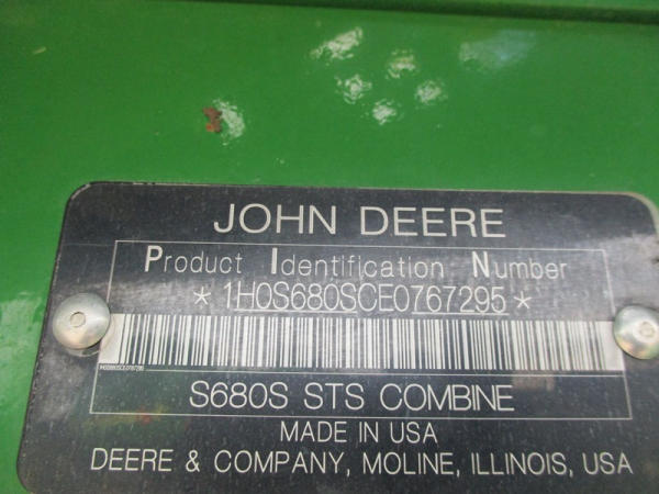 2014 John Deere S680 Combine (DR3145, Unit 185448), John Deere diesel engine, hydrostatic drive, 2 speed gear box, rotor reverser, stalk chopper, 7.9M unloading auger, HID light package, premium cab, 7" Green Star 3 display autotrac ready, big top grain tank extension, side hill performance package, power tail board, AM/FM CD radio, cab hat/air conditioning, 520/85R42 front tires & duals, 620/75R26 rear tires, shows 2060 engine hours, 1263 separator hours.