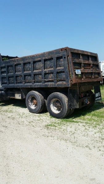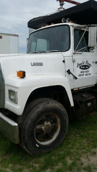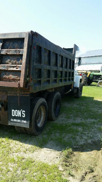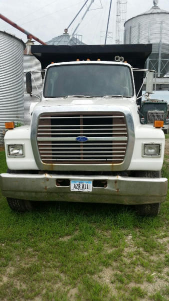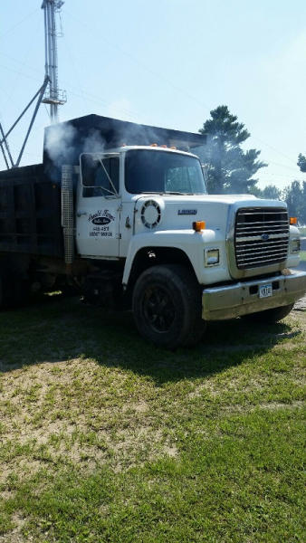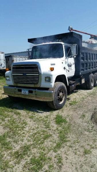 1987 Ford L9000 Dump Truck (LD205), 1987 Ford Conventional L LT9000, L10 Cummins diesel engine, 13-speed transmission, spring ride suspension, tandem axle, air brakes, steel dump box, 385/65 R 22.5 steer tires, 11 R 22.5 rear tires, shows 139,194 miles.