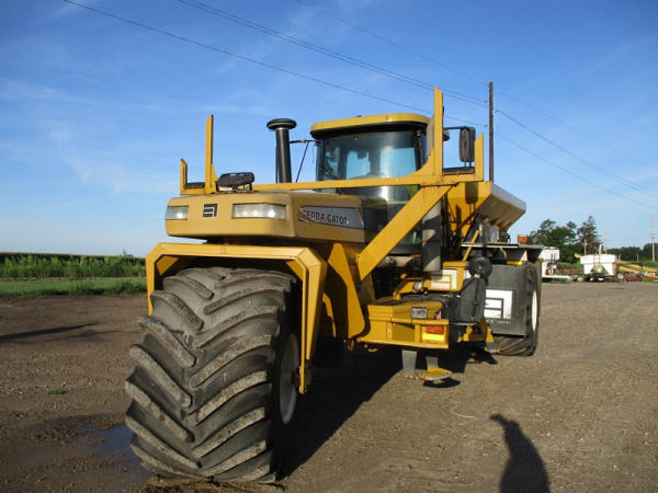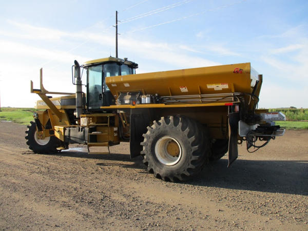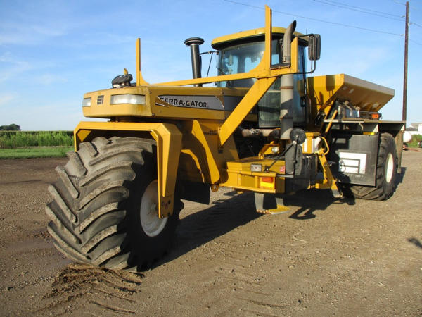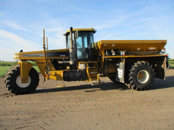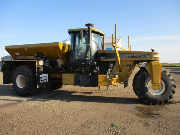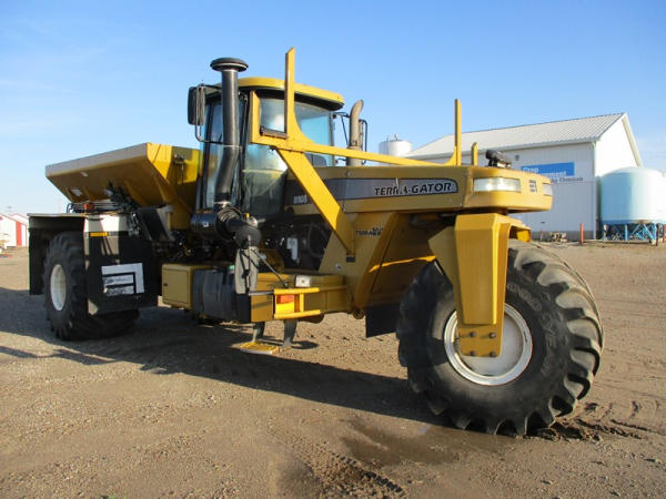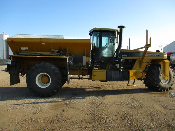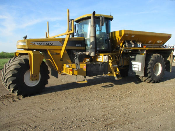 2006 Terra Gator 8103 Dry Floater (DR3161 Unit 109), John Deere diesel engine, Terra Shift transmission, New Leader L3220 G4 stainless steel dry spinner box, includes Multiplier insert, belt/chain, all hydraulic, Raven Viper 4 controller, cab heat/air conditioning, 1000/50R25 tires, shows 6316 hours.