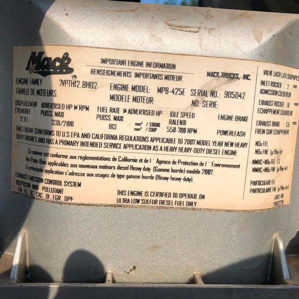 2008 Mack CXU613 Day Cab Truck (NP8886, Unit 10186), MP8-425E diesel engine (400HP), Eaton Fuller 10 speed transmission, heat, air conditioning, Am/Fm radio, tandem axle, air ride suspension, 5th wheel plate, dual fuel tanks, single stack, air ride cab, engine heater, cruise, differential lock, shows 564,109 miles.