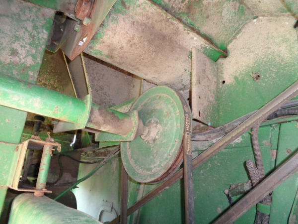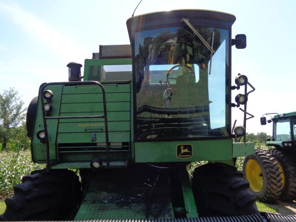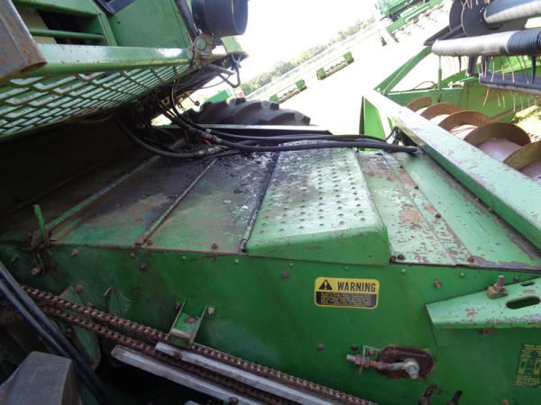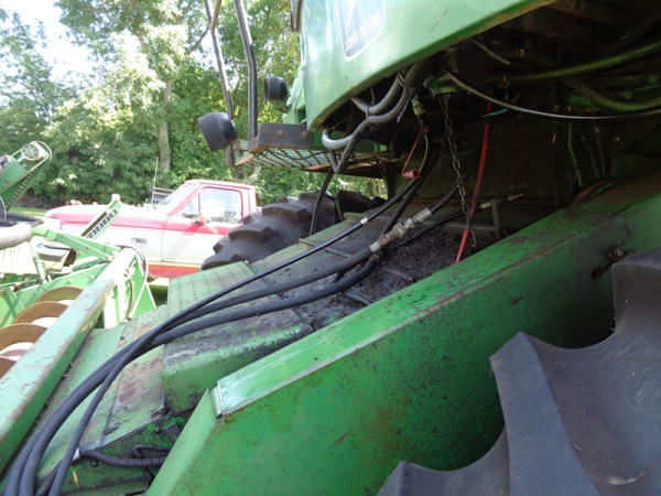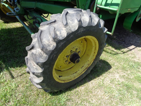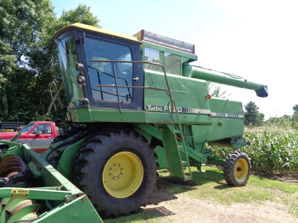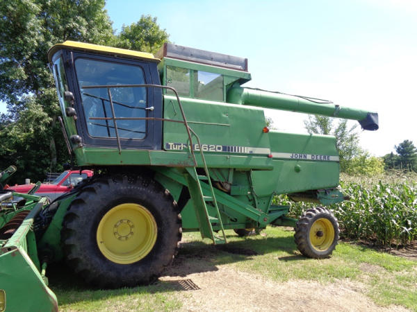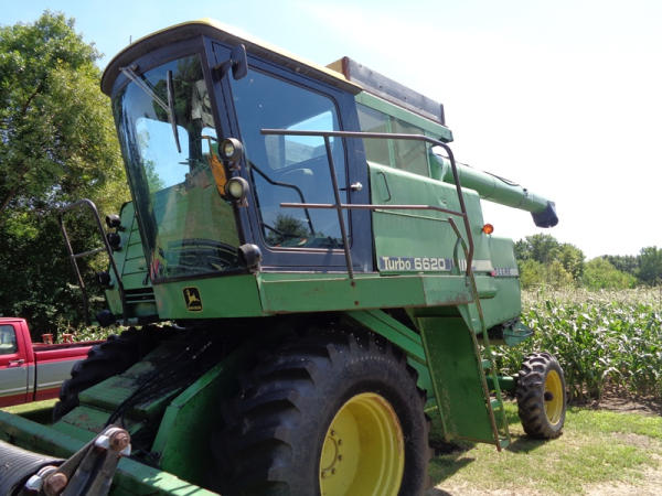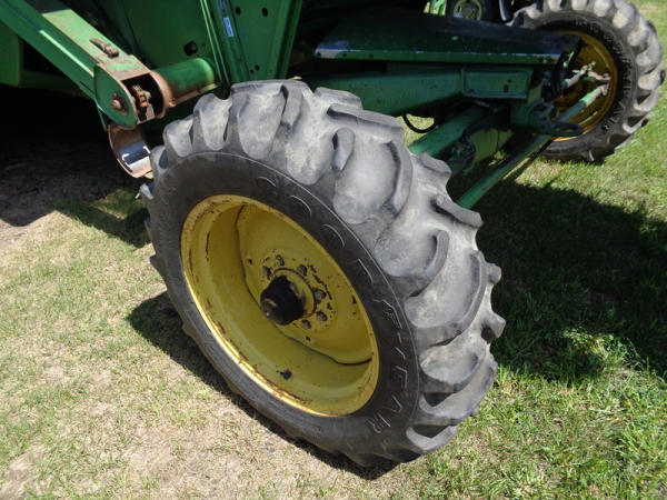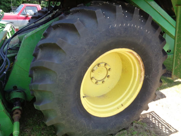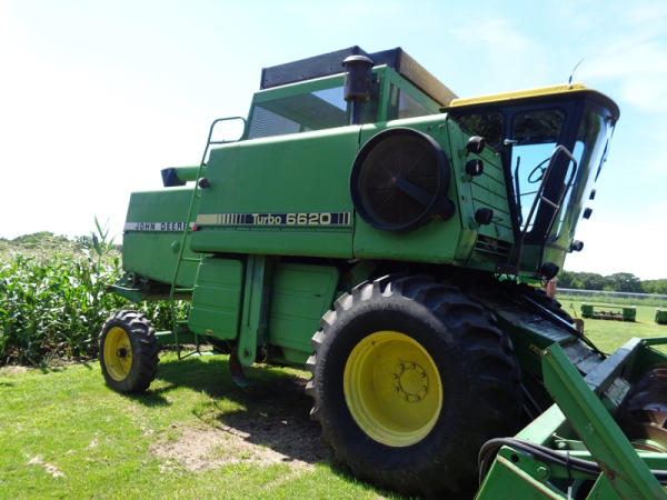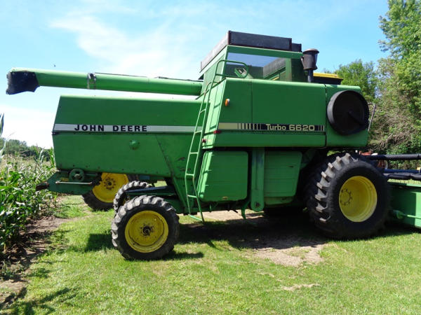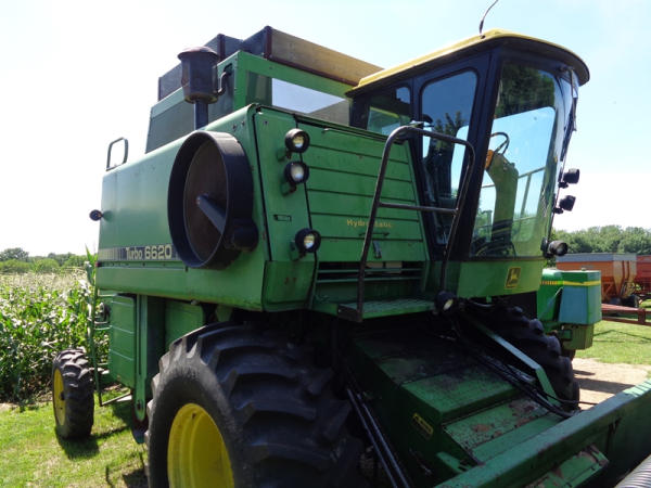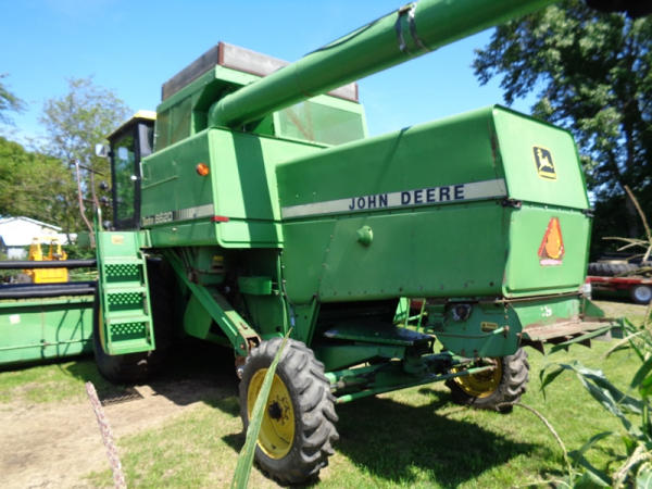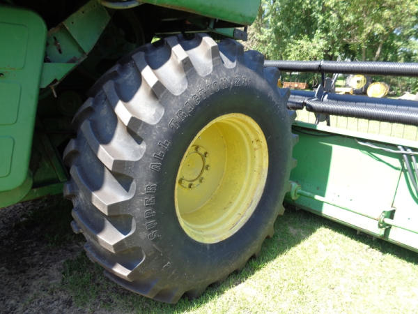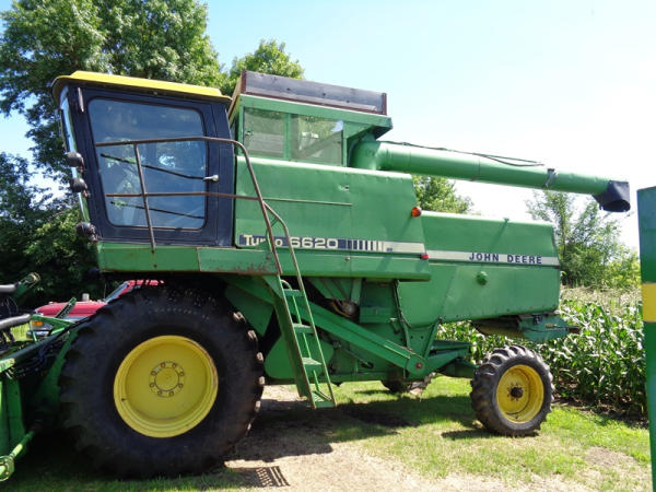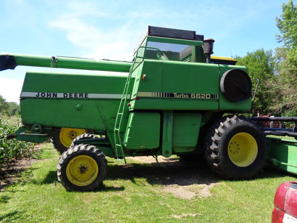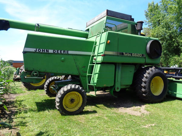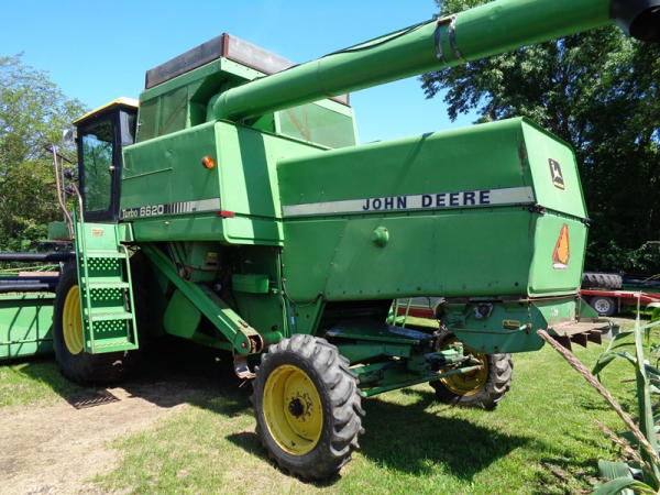 1979 John Deere 6620 Turbo Combine (PZ2802), diesel engine, hydrostatic transmission, air conditioning, heat, Am/Fm radio, Firestone 24.5-32 front tires, Good Year 11.2-24 rear tires, shows 1818 hours.