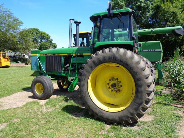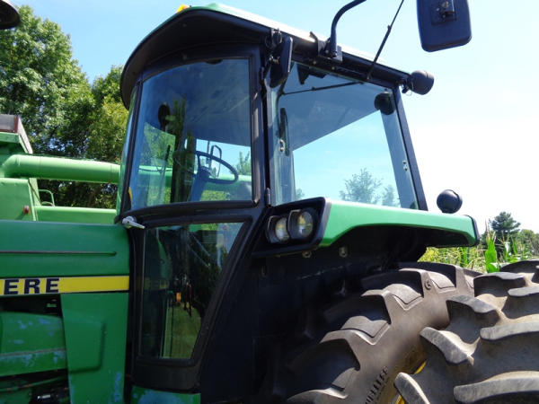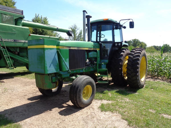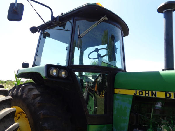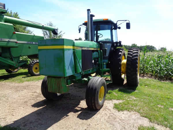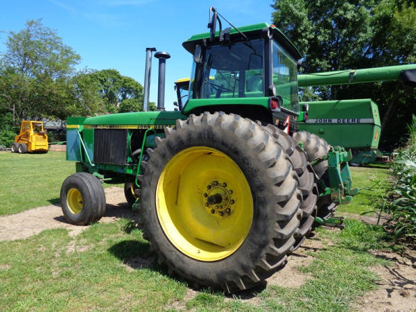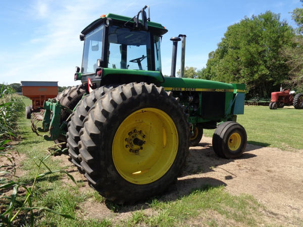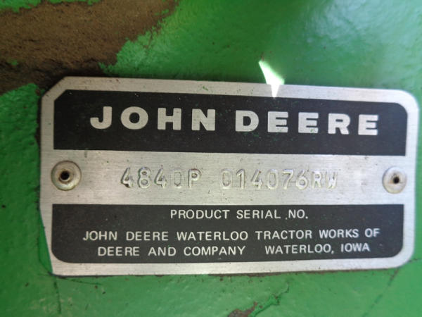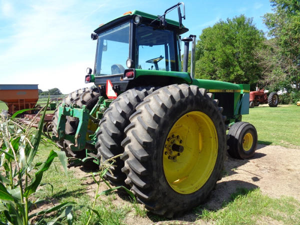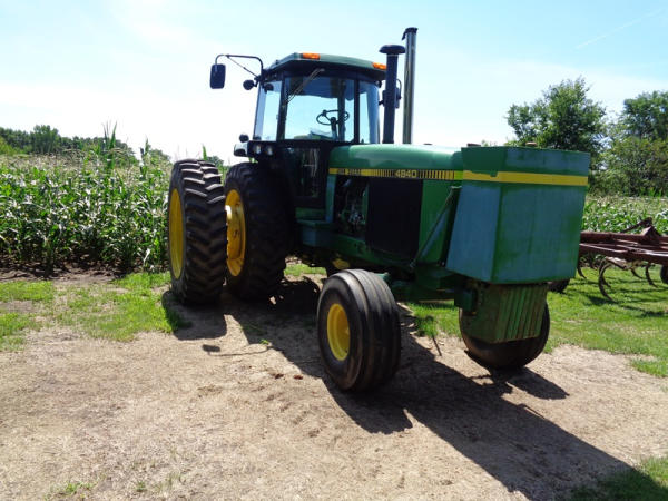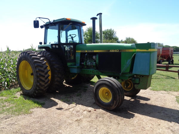 1981 John Deere 4840 Tractor (PZ2803), diesel engine (Major overhaul and clutch in 2001), Powershift transmission, air conditioning, heat, Am/Fm cassette radio, extension mirrors, side steps, 3 port hydraulics, PTO, quick hitch, front weights, Firestone 14L-16.1 front tires, 18.4R42 rear dual tires, shows 1838 hours (Tach replaced in 2001 it showed 5000 hours).