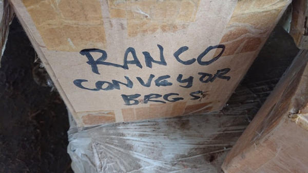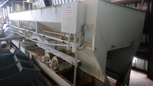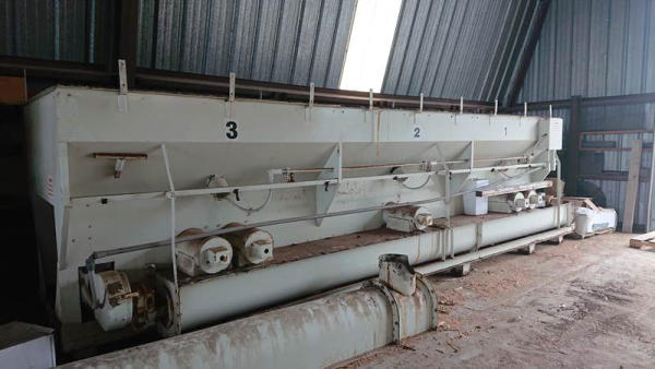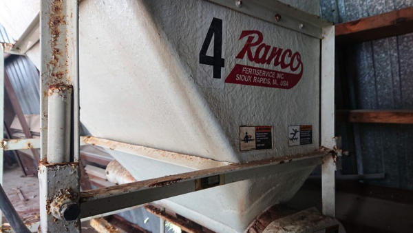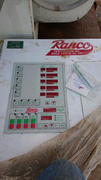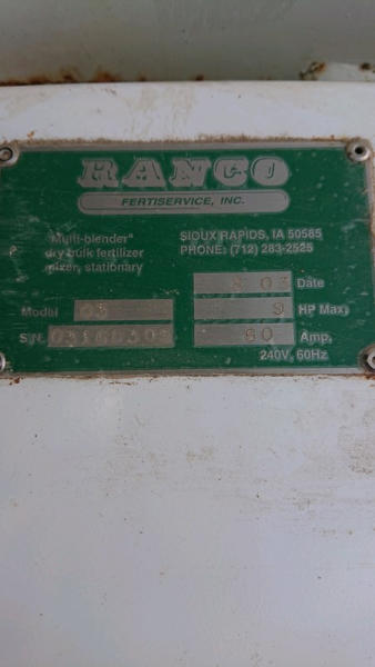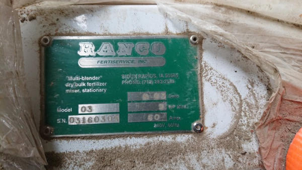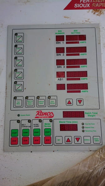 2003 Ranco Blender (DL595), Ranco 3 compartment blender, 3 7inch wide bins, fiberglass insert hoppers, 5 variable speed Ranco DC drive system with DC motors, gear reducers, Ranco additive hopper, 4th microbin with wheels.