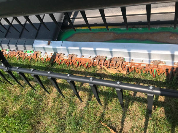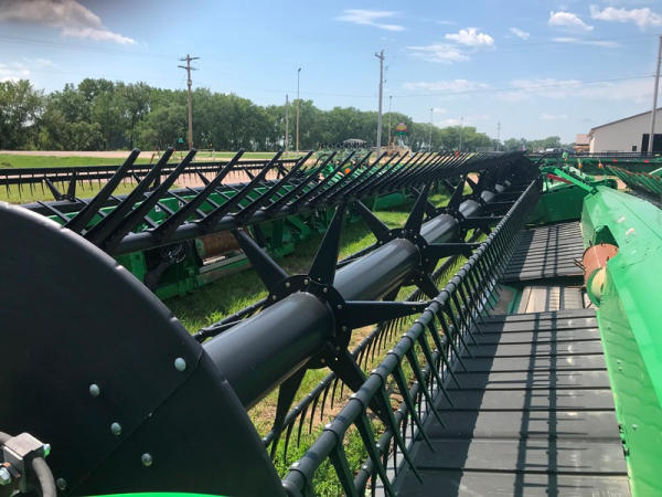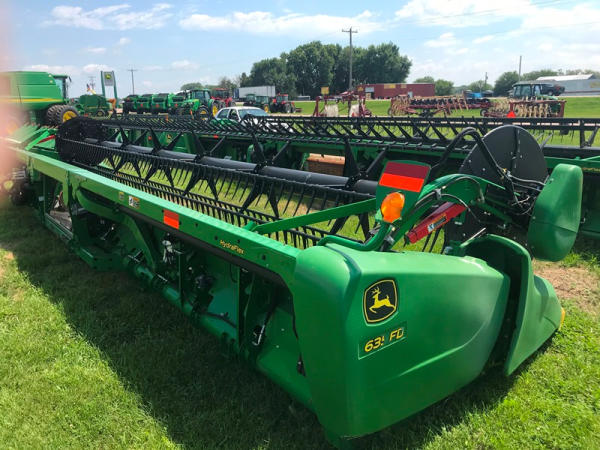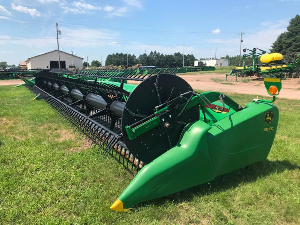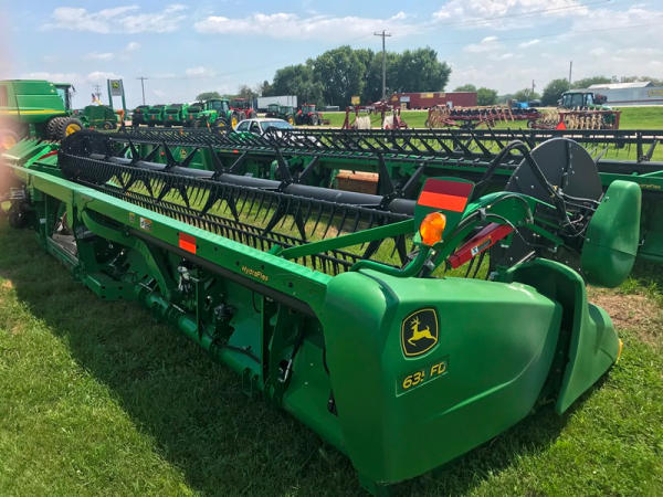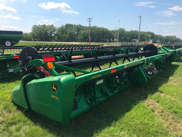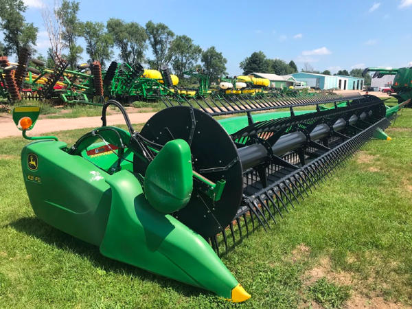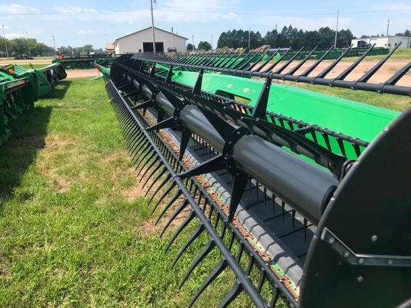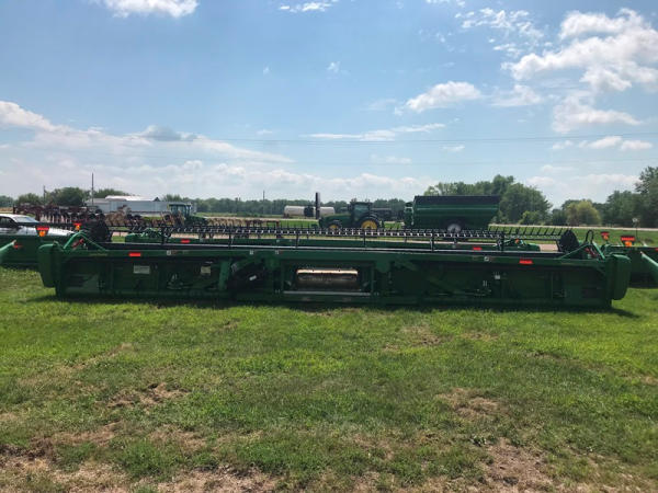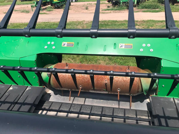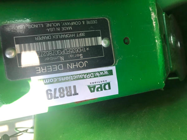 2016 John Deere 635FD (TR8798), dual knife drive, header height sensing IN rigid mode, reel tine flip over bundle, poly tine, platform size 35'.