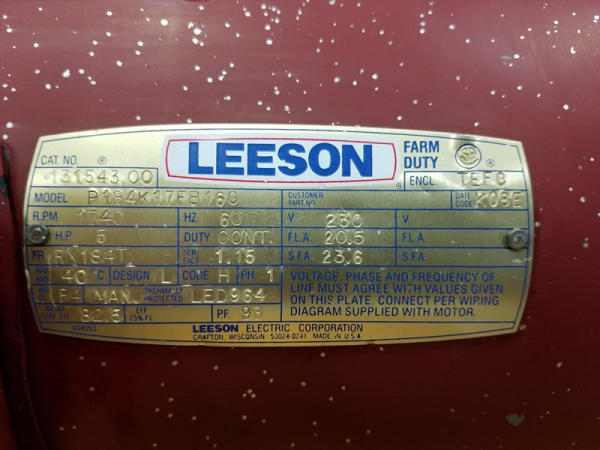 Leeson 5hp Motor (DL602), Leeson 5hp single phase motor, came off an incline 6 inch bin auger.