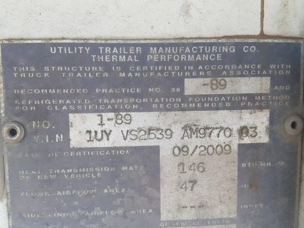 2010 Utility Reefer Trailer (ED1133), 53 foot Carrier, Air Ride Suspension, swing door, LP22.5 tires.