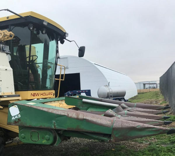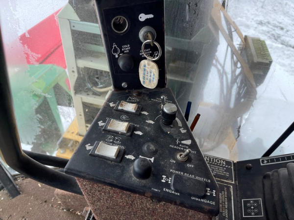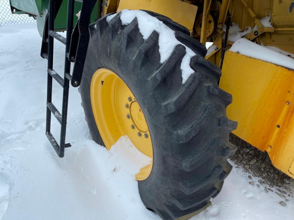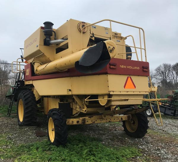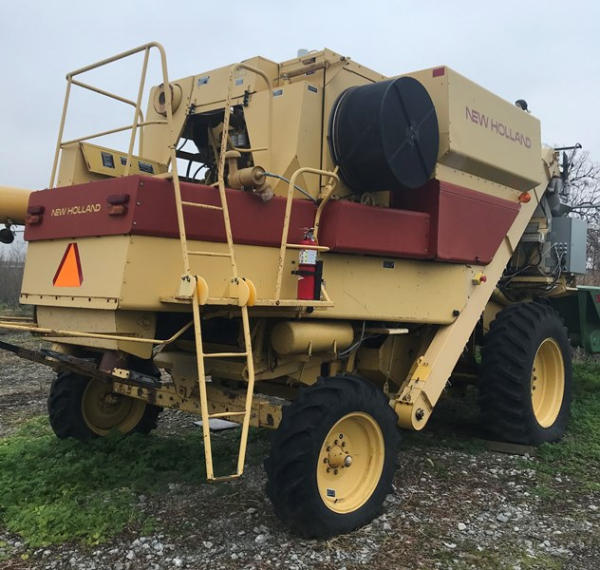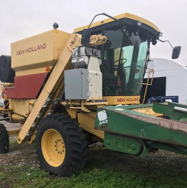 New Holland TR86 Plot Combine (NP1352), diesel engine, cab, heat, air conditioning, Am/Fm radio, 18.4-34 front tires, 12.4-24 front tires, power rear wheels, auto header height, with John Deere 443 corn head, 4 row 30", shows 4,732 hours.