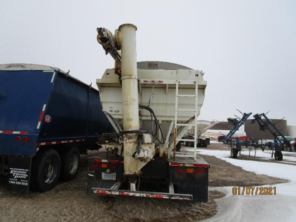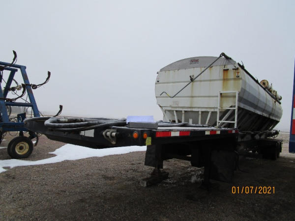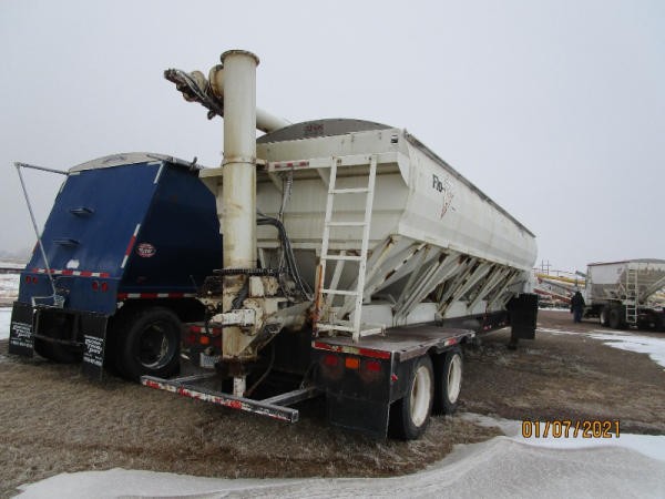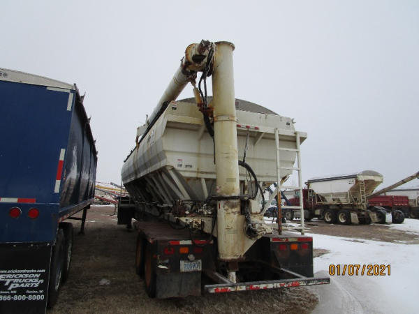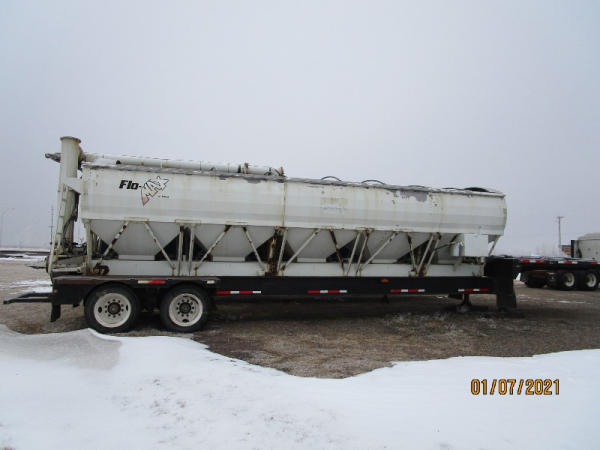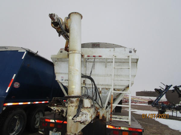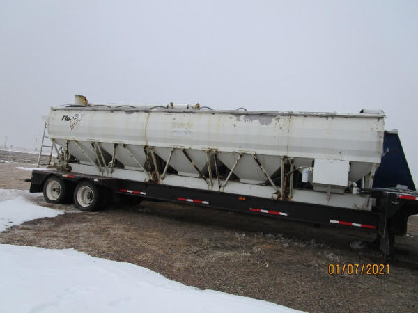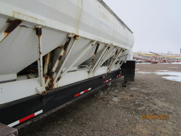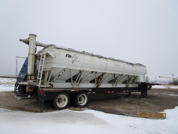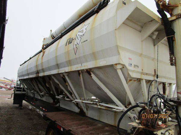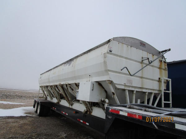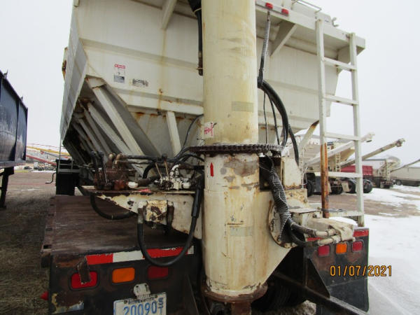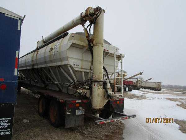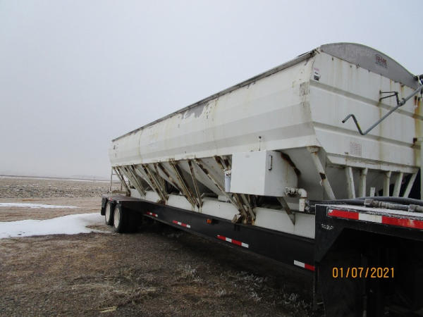 1999 Mauer Dry Tender Trailer (DR7530), Loral Flo Max 5 bin stainless steel hydraulic dry fertilizer tender trailer, over head auger, roll tarp, 255/7-R22. tires.