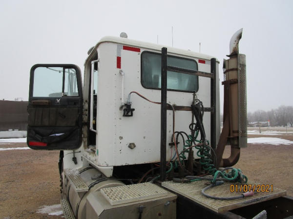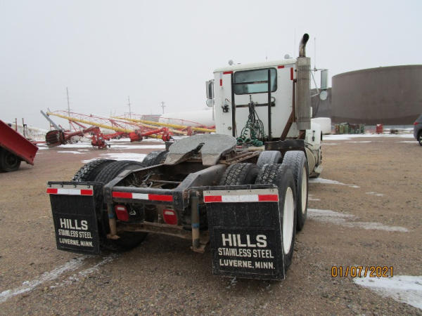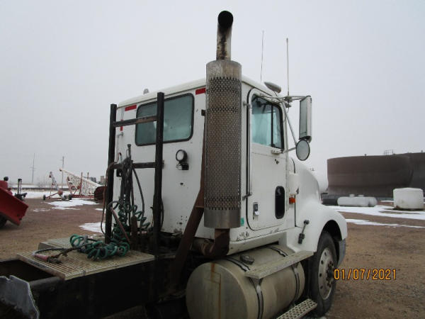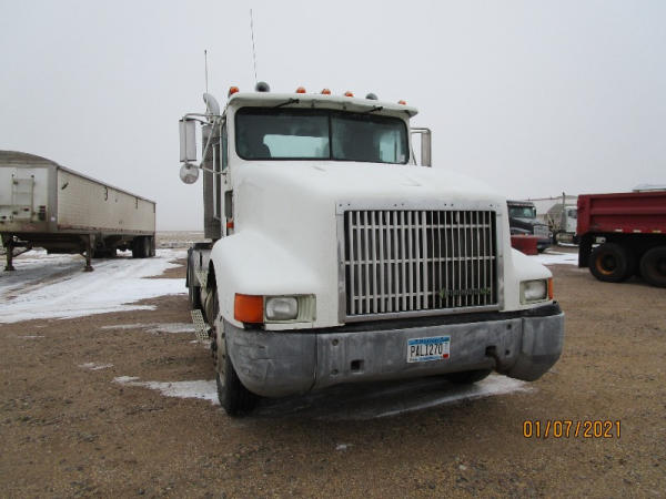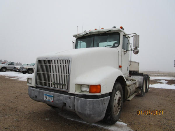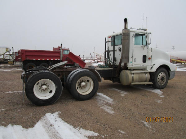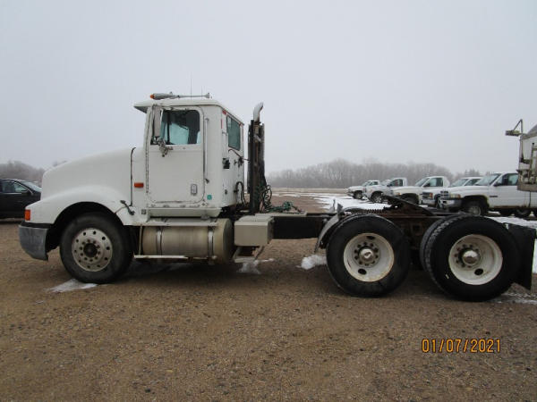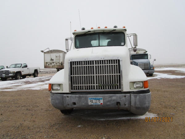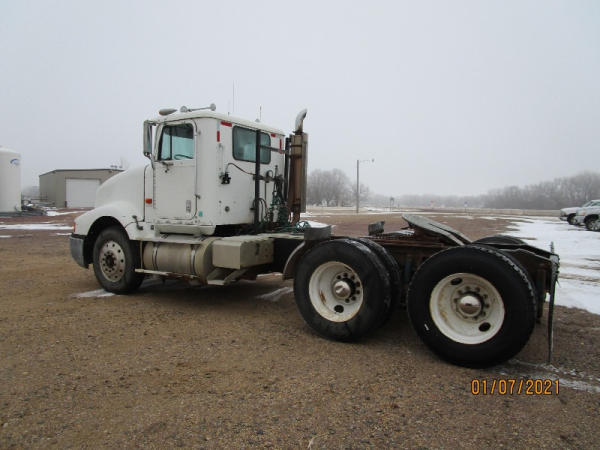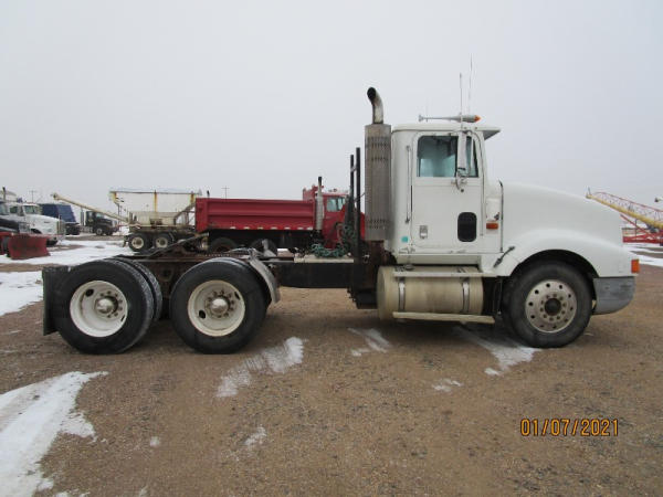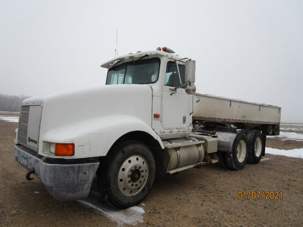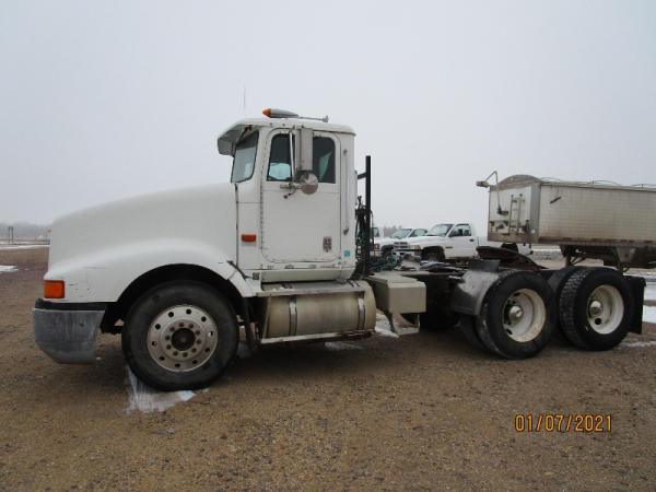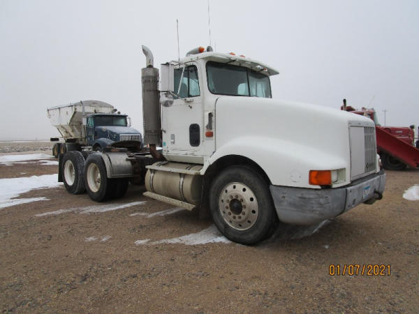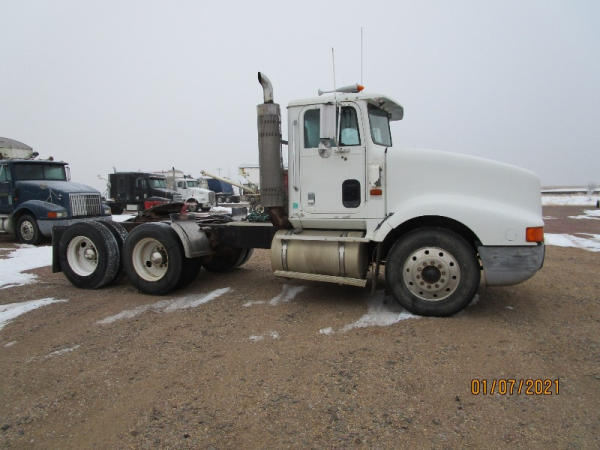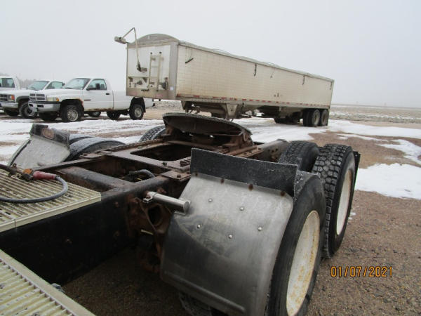 1992 International 9400 Truck (DR7521), Cat diesel engine, 9 speed transmission, tandem axle full screw, air ride suspension, 5th wheel plate, hydraulic wet kit, day cab, dual aluminum fuel tanks, shows 779,914 miles.