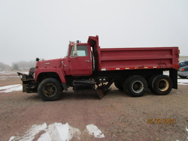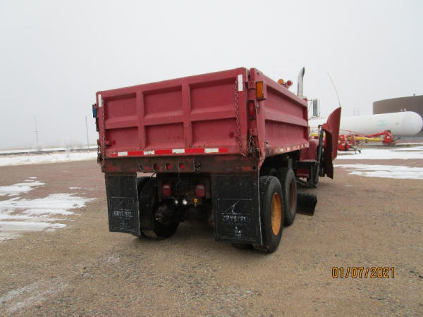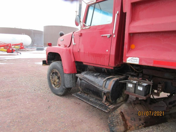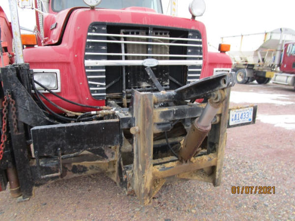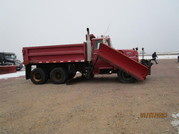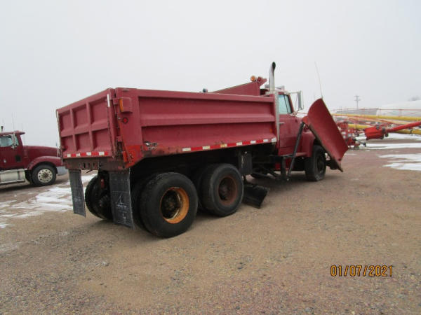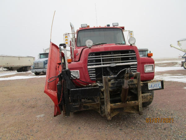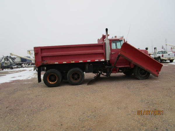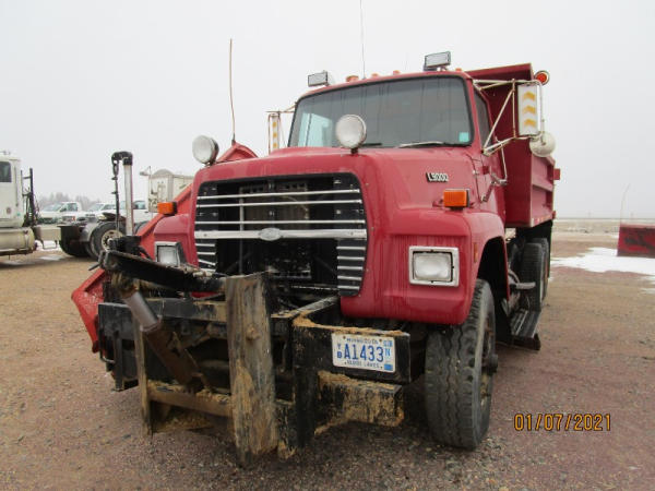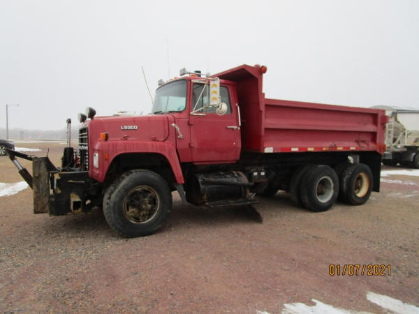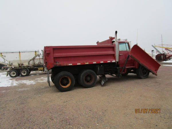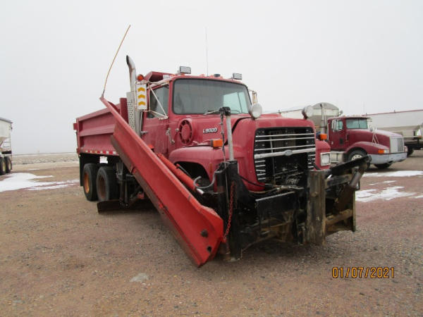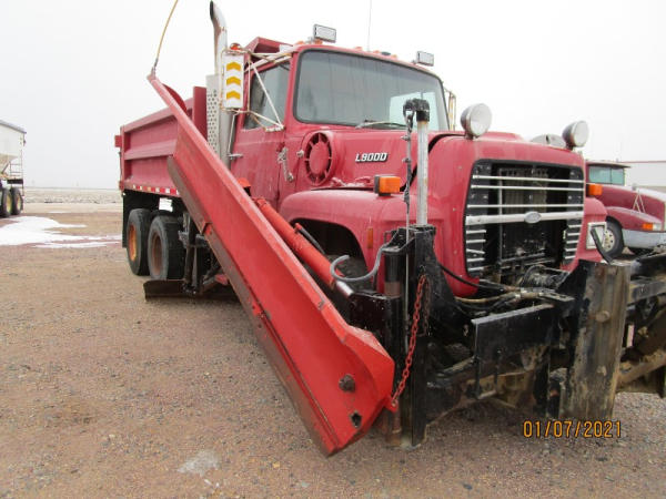 1990 Ford L9000 Dump Truck (DR7523), Cummins diesel engine, 4 speed automatic transmission, tandem axle full screw, air brakes are weak, 11' hydraulic front blade, belly and wing blade, Crysteel 13' hydraulic dump box, rear hydraulic hook ups, 10:00 R20 tires, shows 16,601 miles.
