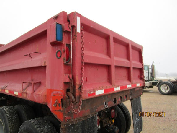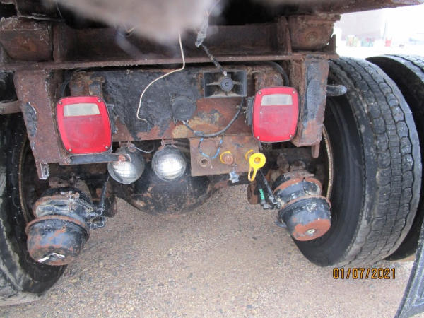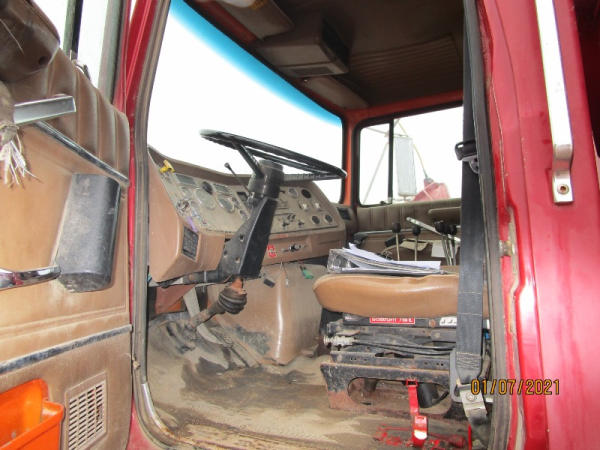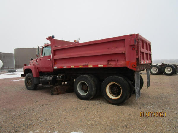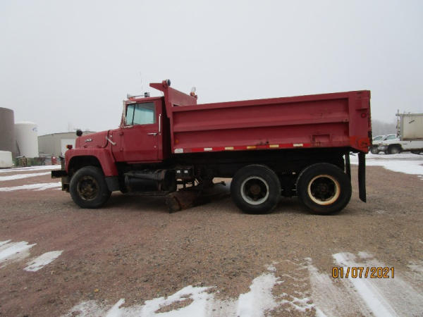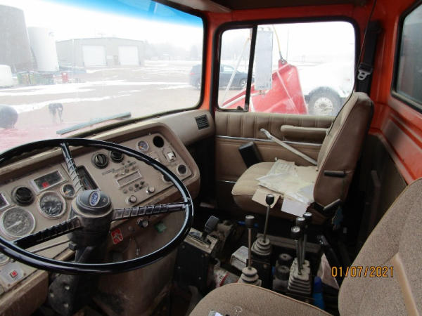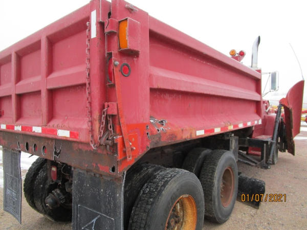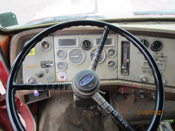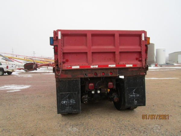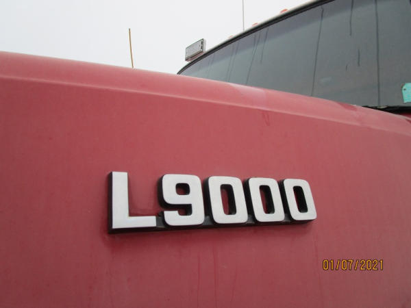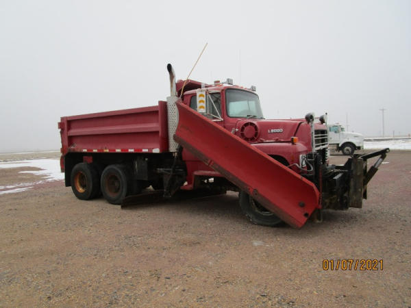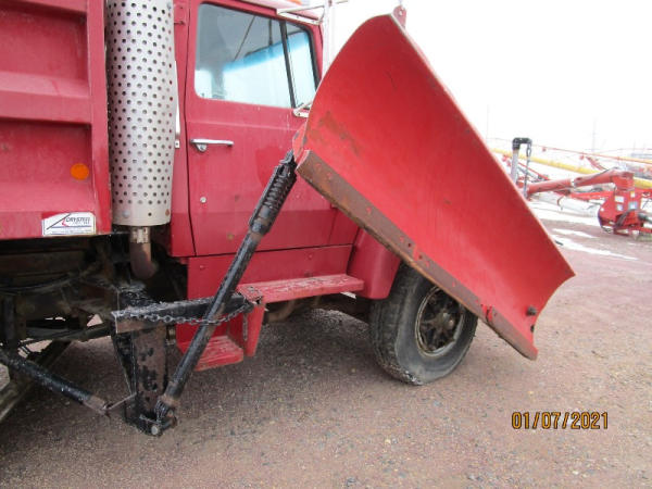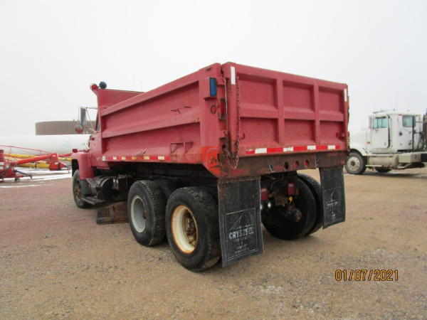 1990 Ford L9000 Dump Truck (DR7523), Cummins diesel engine, 4 speed automatic transmission, tandem axle full screw, air brakes are weak, 11' hydraulic front blade, belly and wing blade, Crysteel 13' hydraulic dump box, rear hydraulic hook ups, 10:00 R20 tires, shows 16,601 miles.