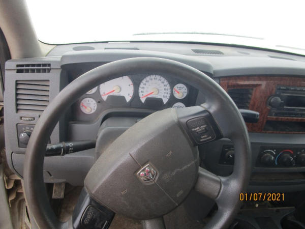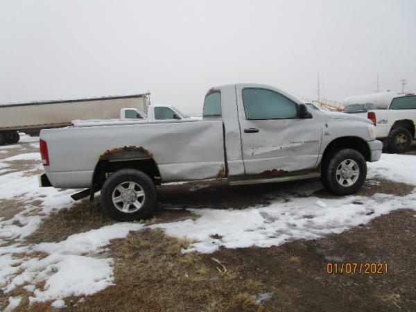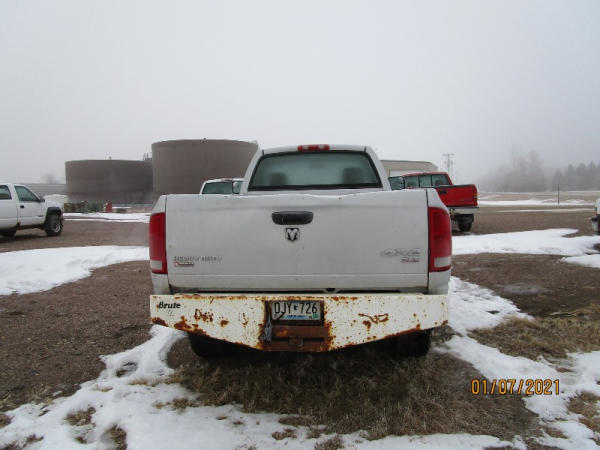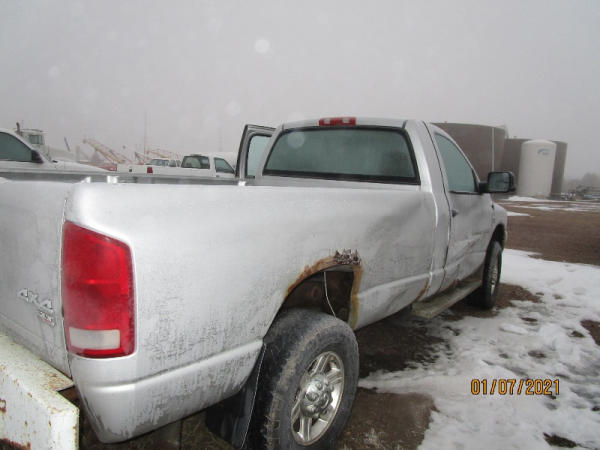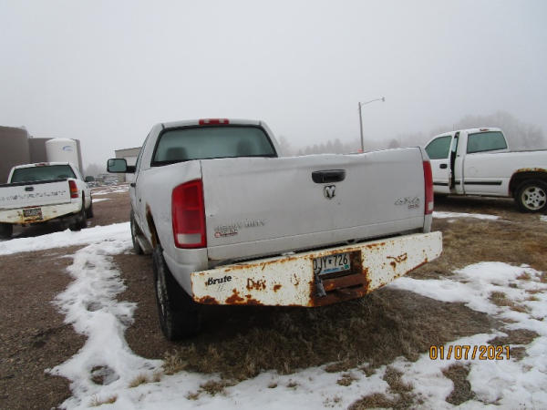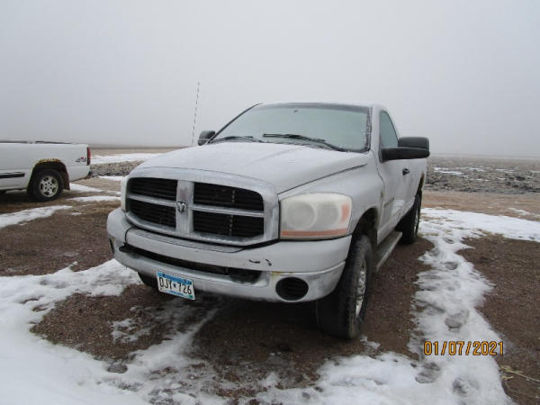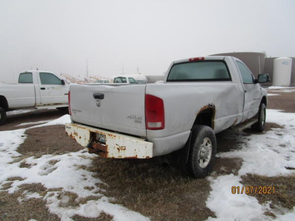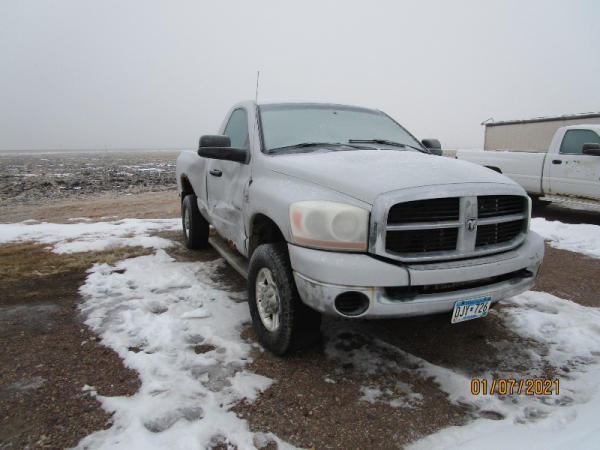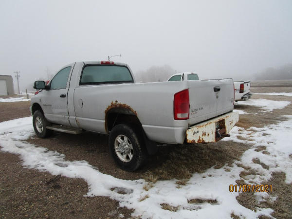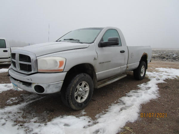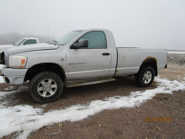 2006 Dodge Ram, 2500 Pickup (DR7516), Cummins diesel engine, automatic transmission, 4X4, regular cab long box, rear ag bumper, heat/air conditioning, AM/FM CD radio, power windows, locks and drivers seat, 285/70R17 tires, shows 213,185 miles.