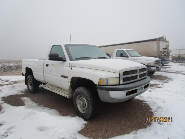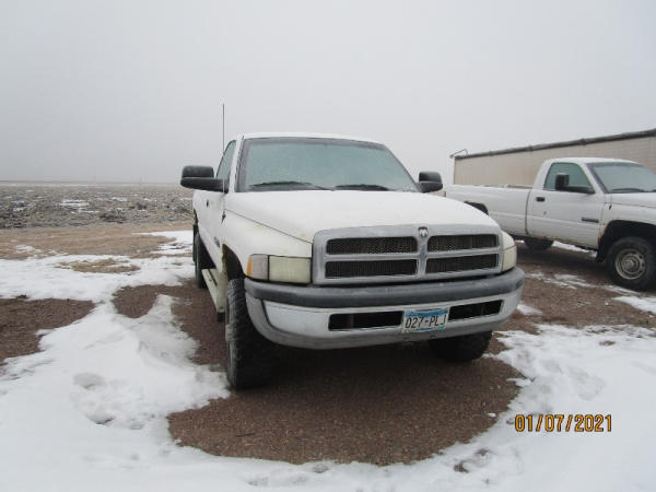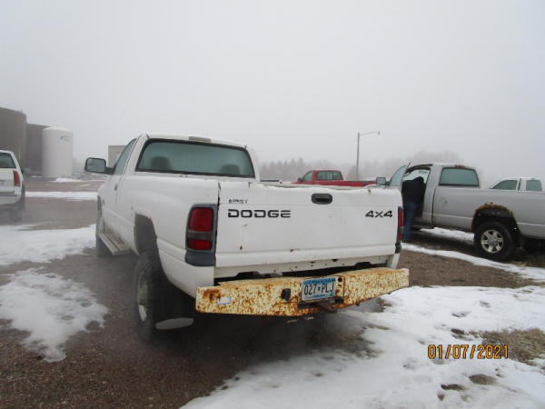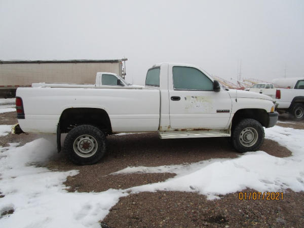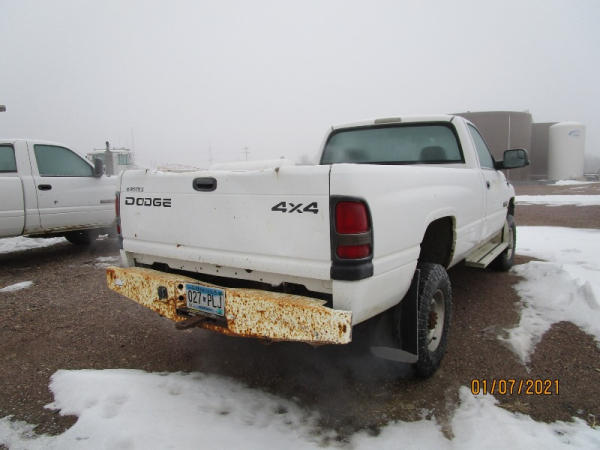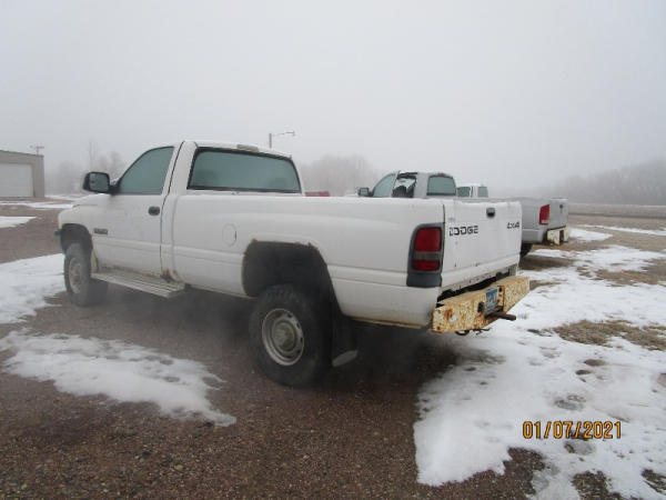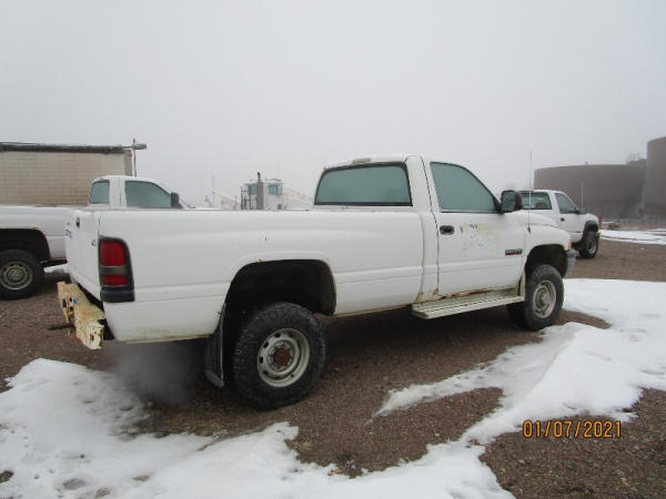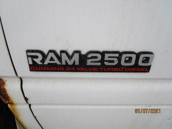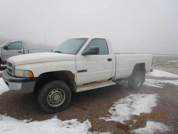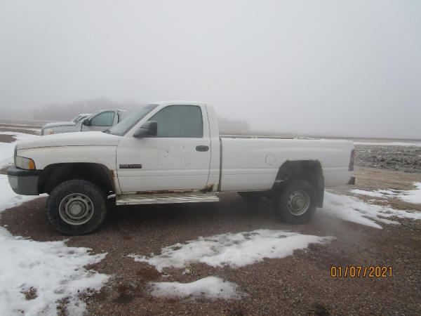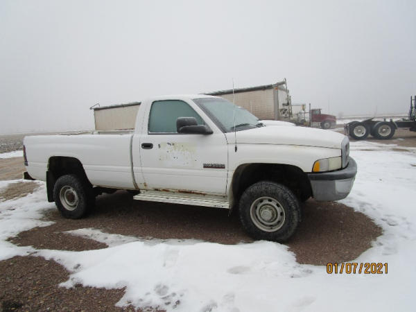 2001 Dodge Ram 2500 Pickup (DR7517), Cummins diesel engine, 5 speed manual transmission, 4X4, regular cab long box, 5th wheel ball, rear ag bumper, AM/FM cassette radio, cab heat/air conditioning, 265/75R16 tires, shows 185,807 miles.
