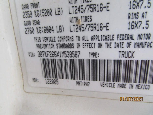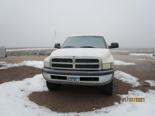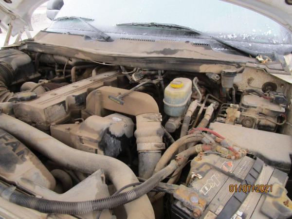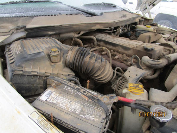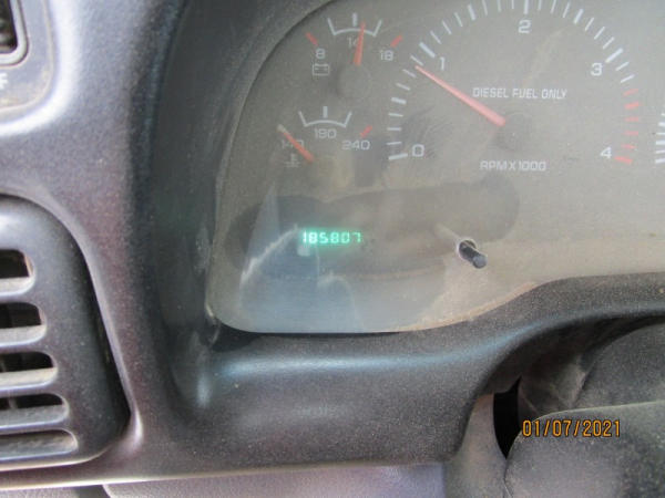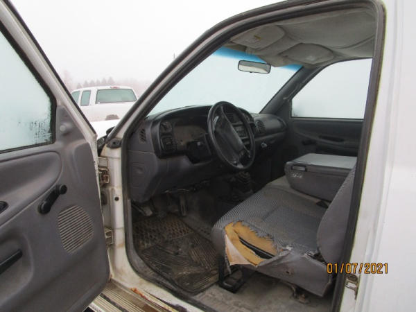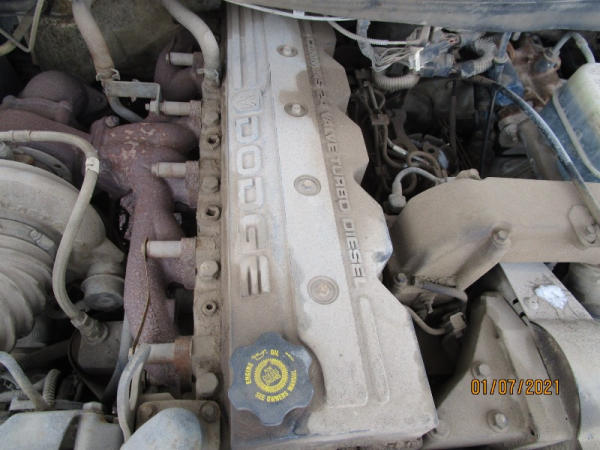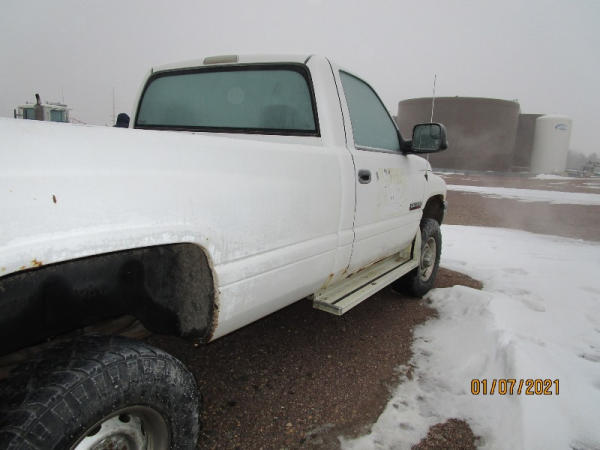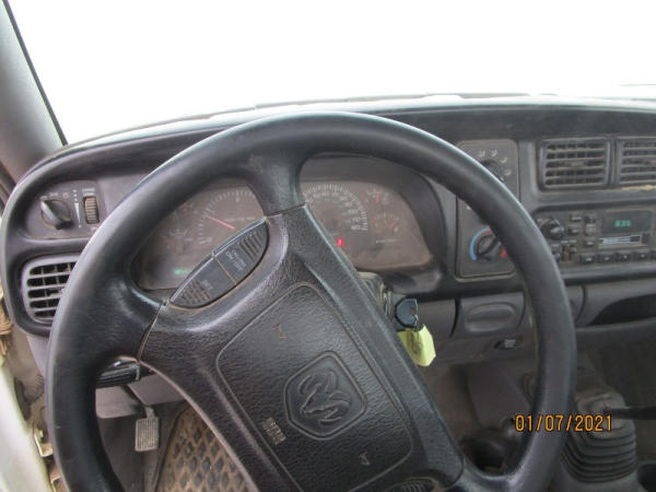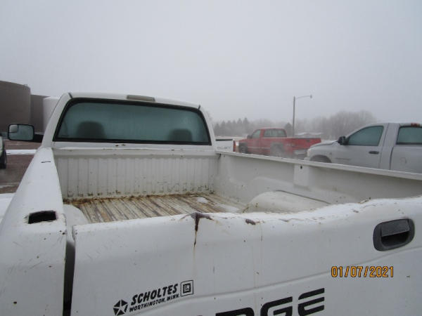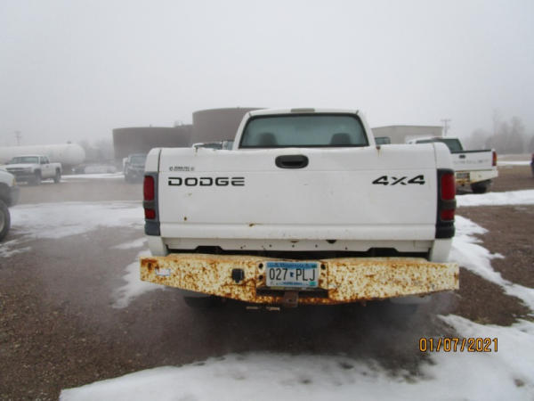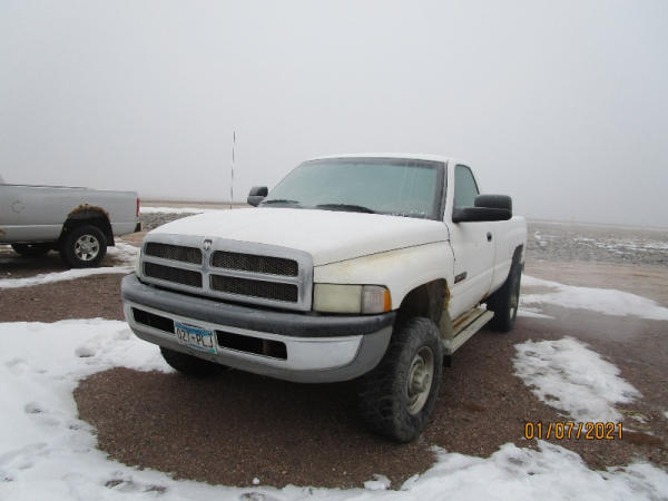 2001 Dodge Ram 2500 Pickup (DR7517), Cummins diesel engine, 5 speed manual transmission, 4X4, regular cab long box, 5th wheel ball, rear ag bumper, AM/FM cassette radio, cab heat/air conditioning, 265/75R16 tires, shows 185,807 miles.