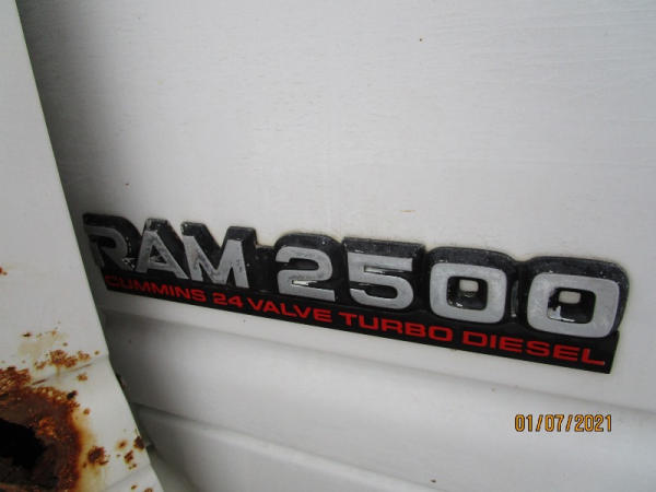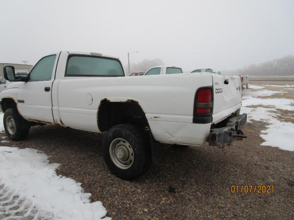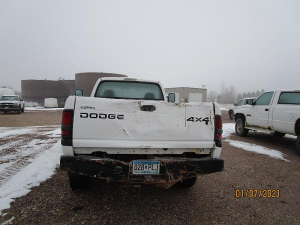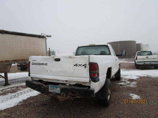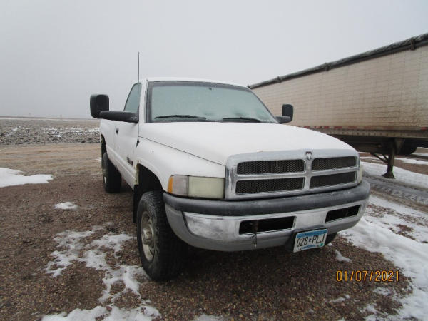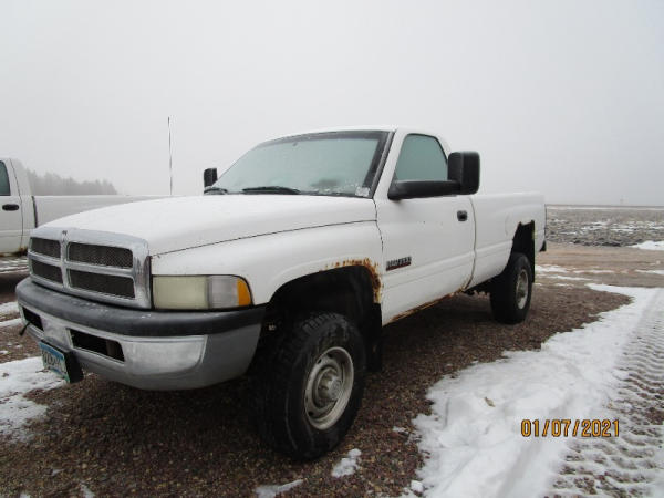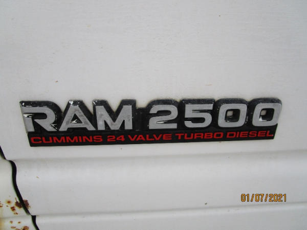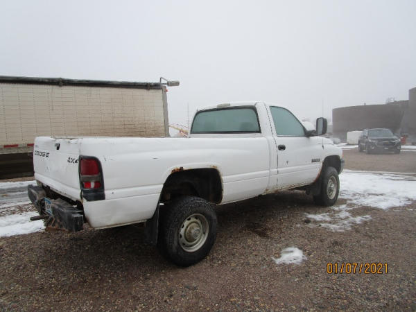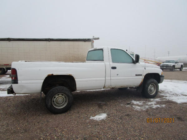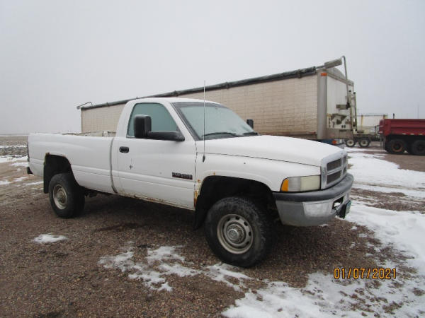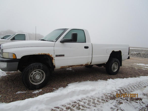 2001 Dodge Ram 2500 Pickup (DR7518), Cummins diesel engine, 5 speed manual transmission, 4X4, regular cab long box, 5th wheel ball, rear ag bumper, AM/FM cassette radio, cab heat/air conditioning, cruise control, 265/75R16 tires, shows 186,702 miles.