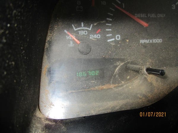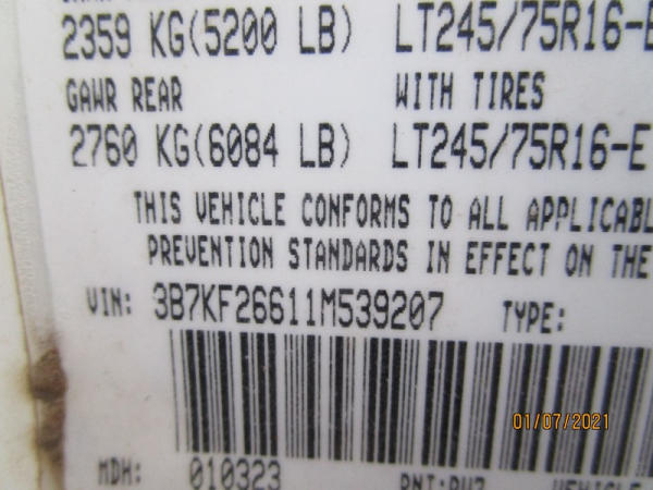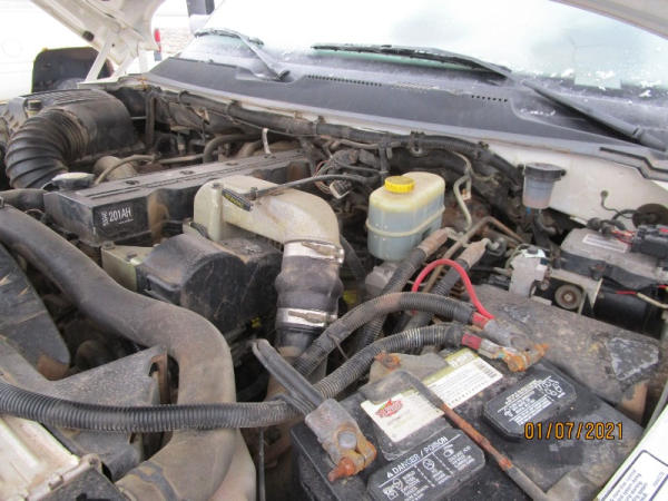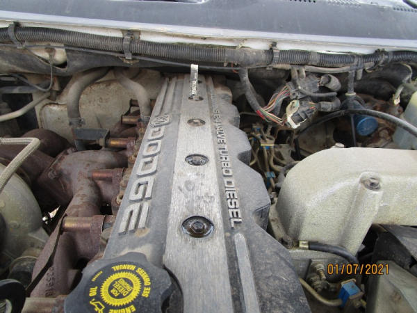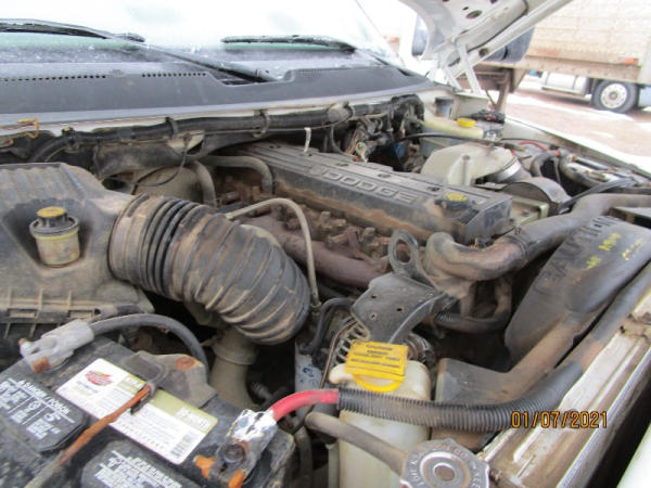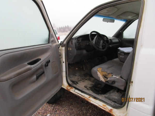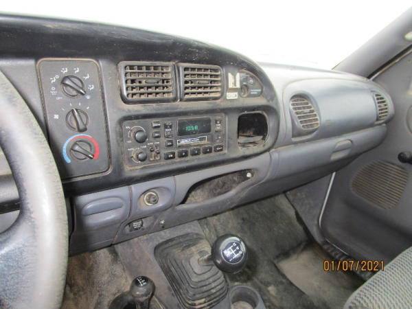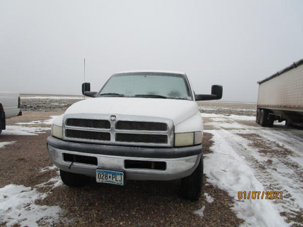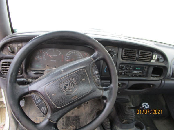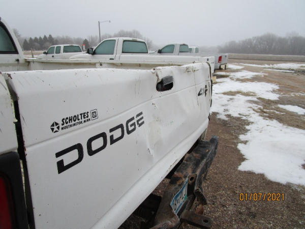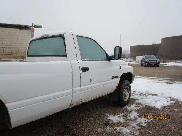 2001 Dodge Ram 2500 Pickup (DR7518), Cummins diesel engine, 5 speed manual transmission, 4X4, regular cab long box, 5th wheel ball, rear ag bumper, AM/FM cassette radio, cab heat/air conditioning, cruise control, 265/75R16 tires, shows 186,702 miles.