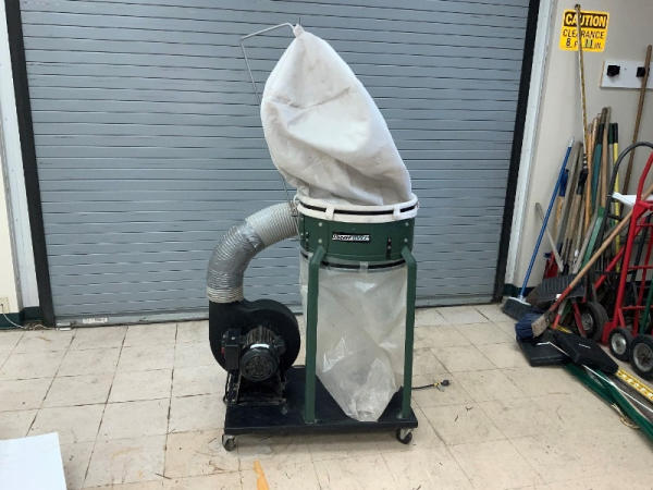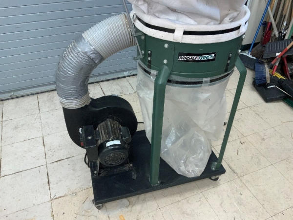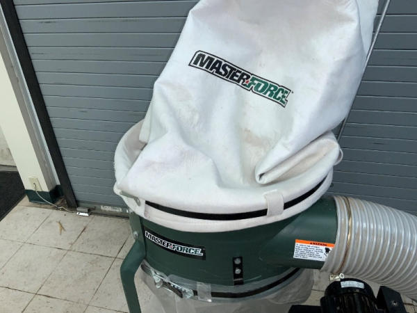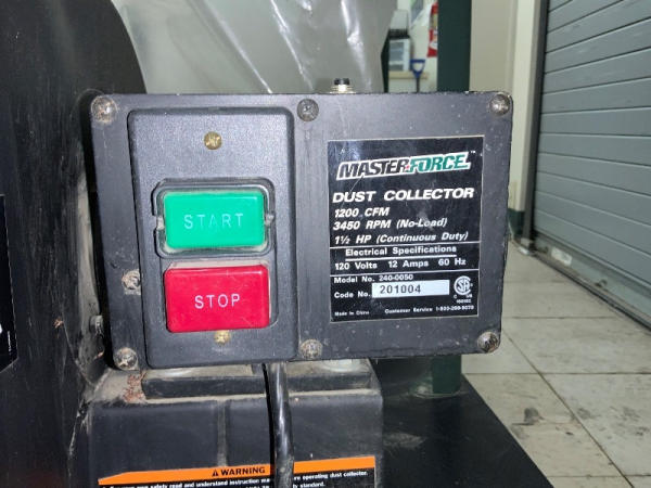 Master Force Dust Collector (NP1376), Model 240-0050, 33" long x 27" wide x 80" tall, 1200 CFM, 3450 RPM, 1.5HP (continuous duty), 120 volts, 12 amps, 60 hz.