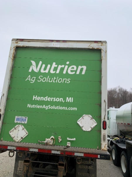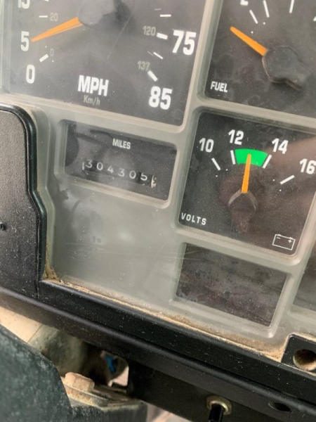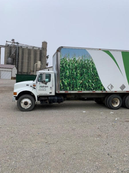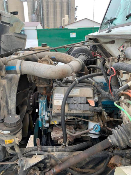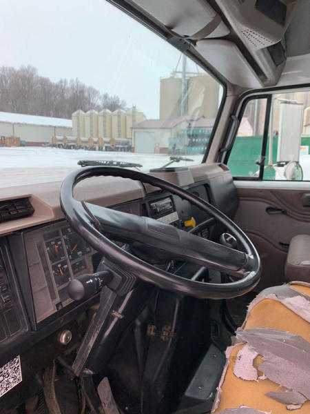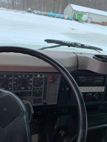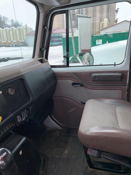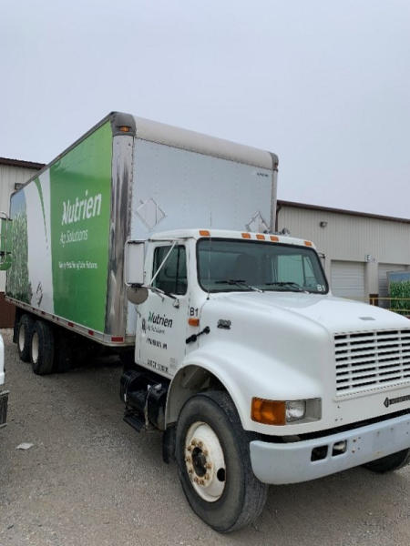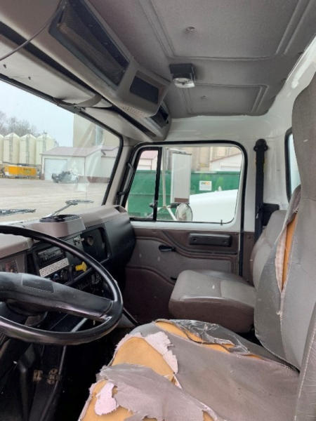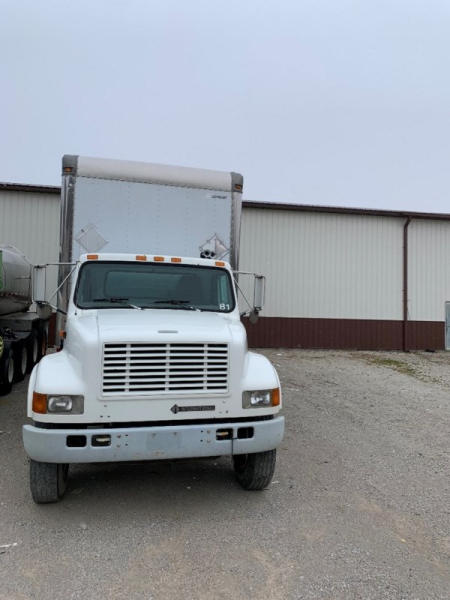 2001 IHC 4900 Van Truck (PZ6300, Unit 46032), diesel engine, Spicer 10 speed transmission, heat, Am/Fm radio, tandem axle, full screw, van body, roll up rear door, shows 304,305 miles.
