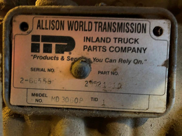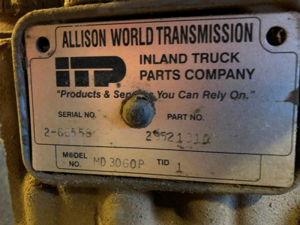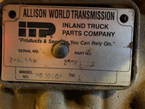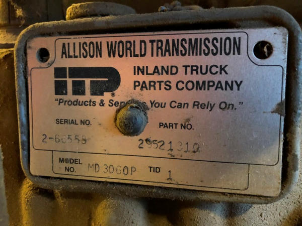 Allison Transmission (NP1380), Model MD 3060P, Part 29521310, S/N 2-66558, came out of a Tyler spreader machine.