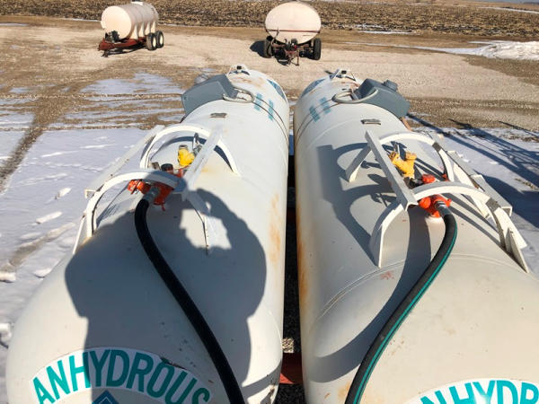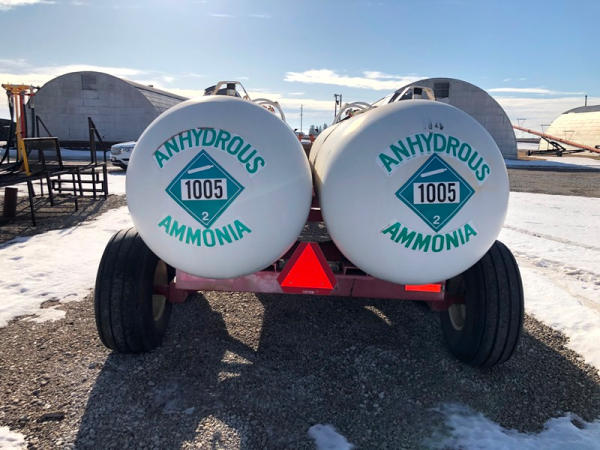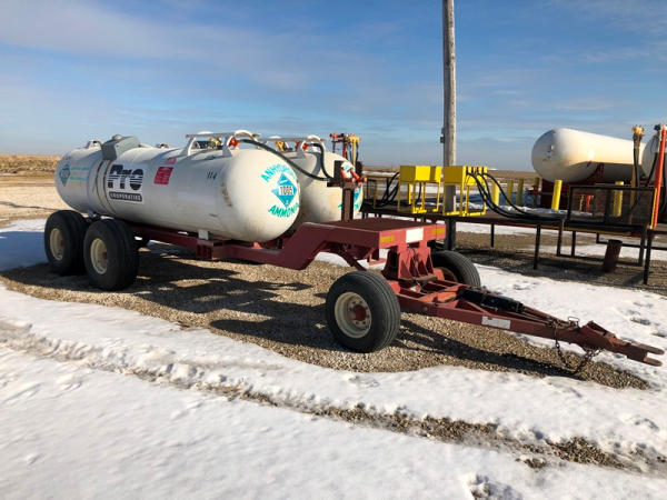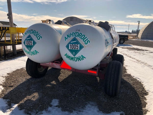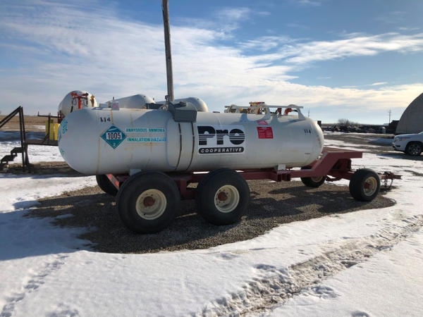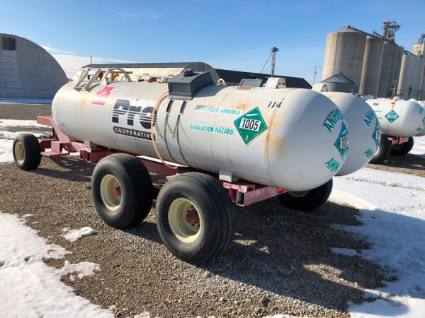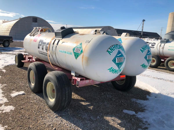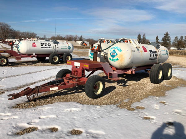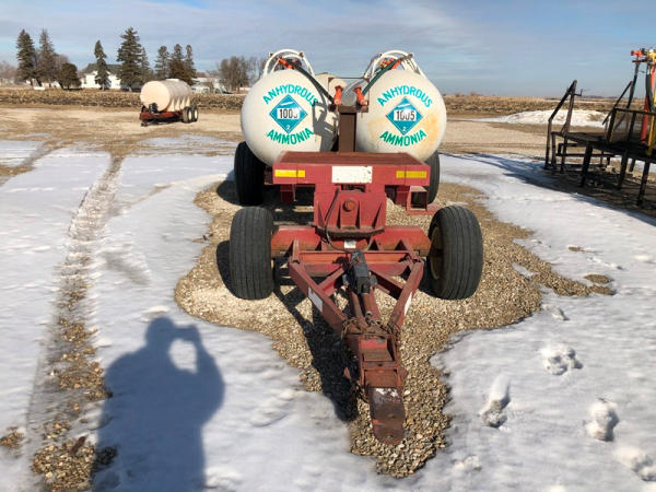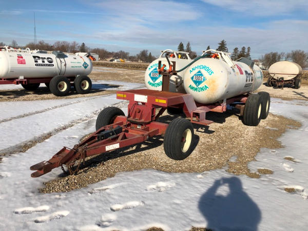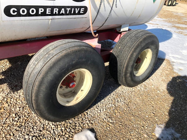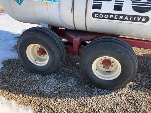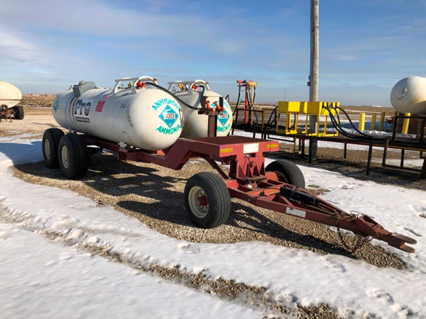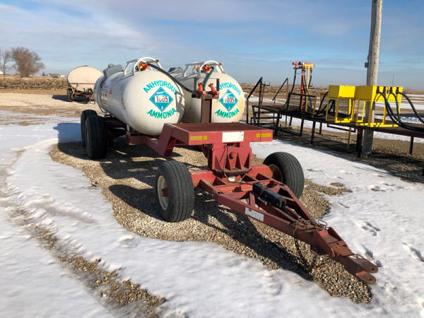 Double NH3 Nurse Tanks (NP1403, Unit 114), (2) 1,000 gallon NH3 nurse tanks, top front fill, water tanks, Tank 1 - NTIP No: 148313, data plate, Tank 2 - NTIP No: 148310, data plate, Dalton Ag WNDT1000 6 wheel running gear (S/N 04135), 11L-15 front tires, 14L-16.1 rear tires.