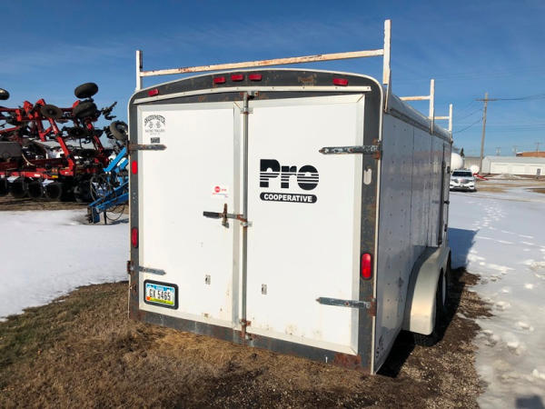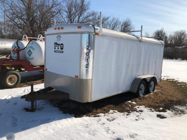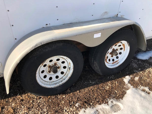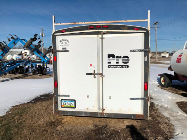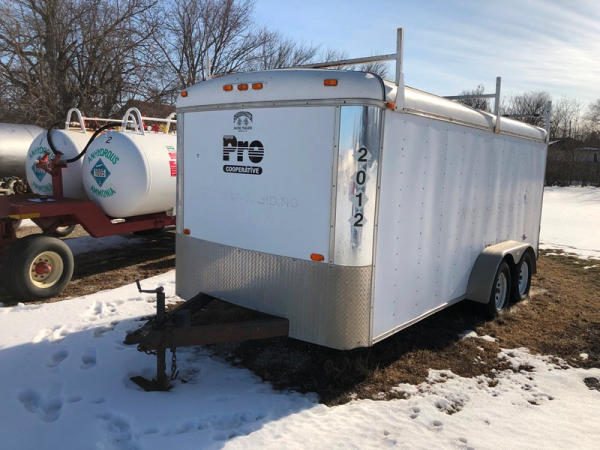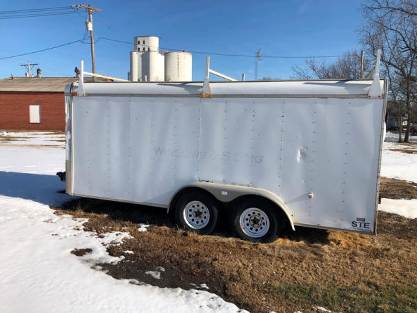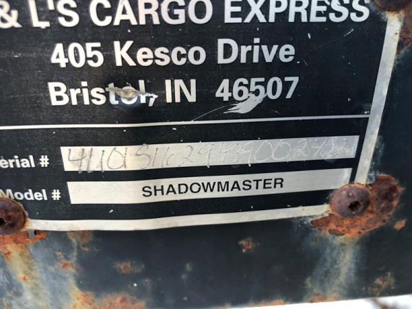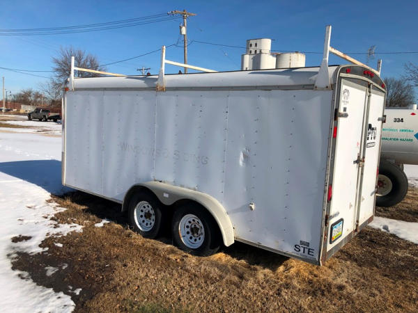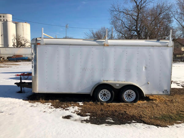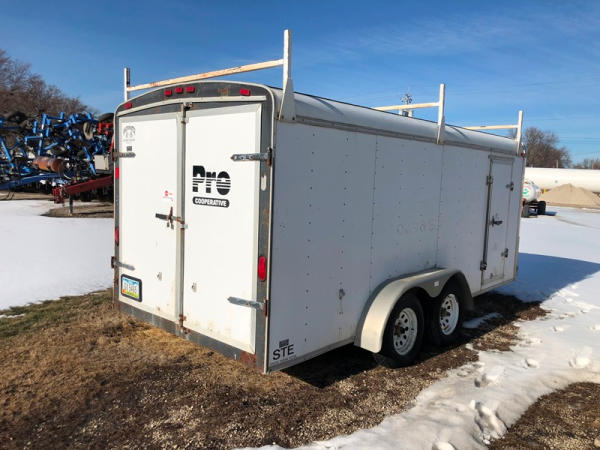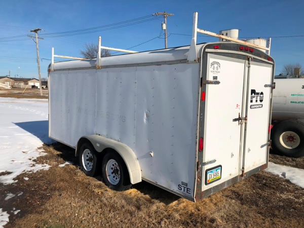 2000 Shadowmaster Enclosed Trailer (NP1415), approx. 16' length, tandem axle, side access door, rear cargo doors, top roof rack, bumper hitch, ST225/75R15 tires.
