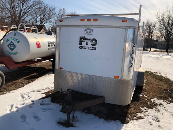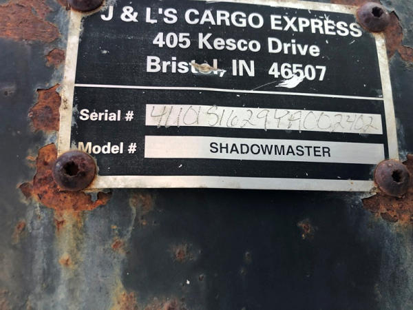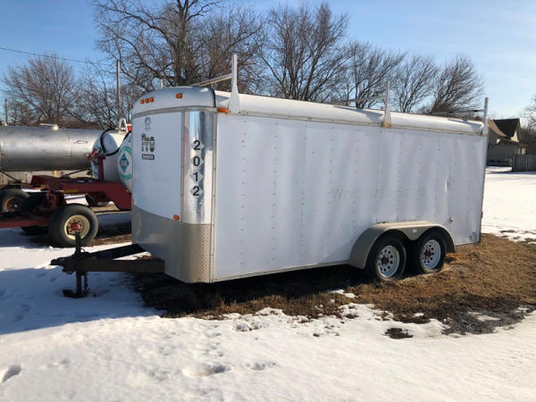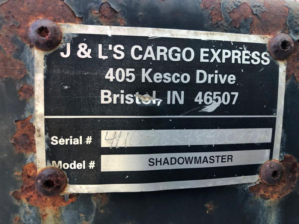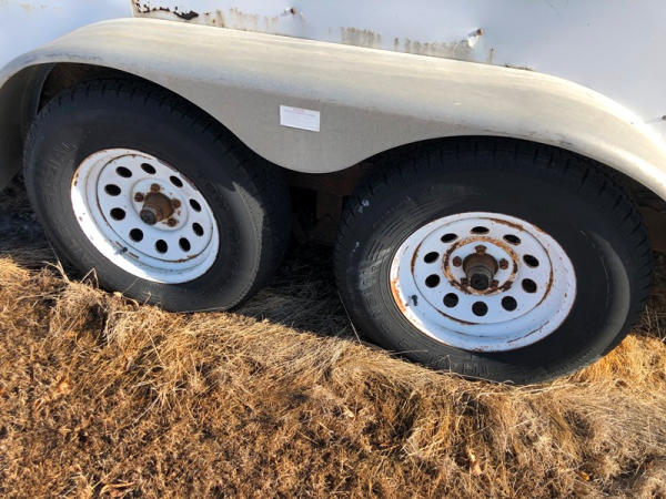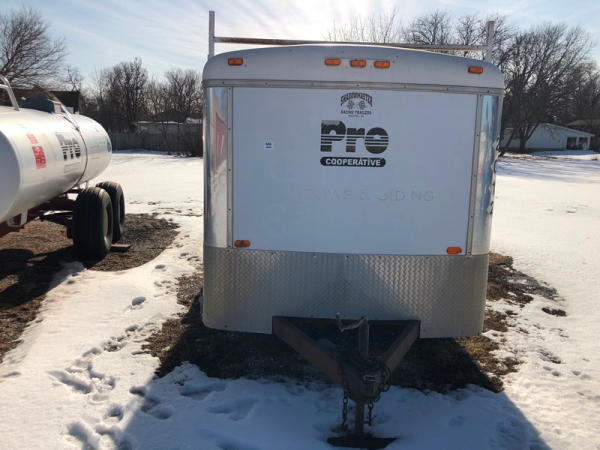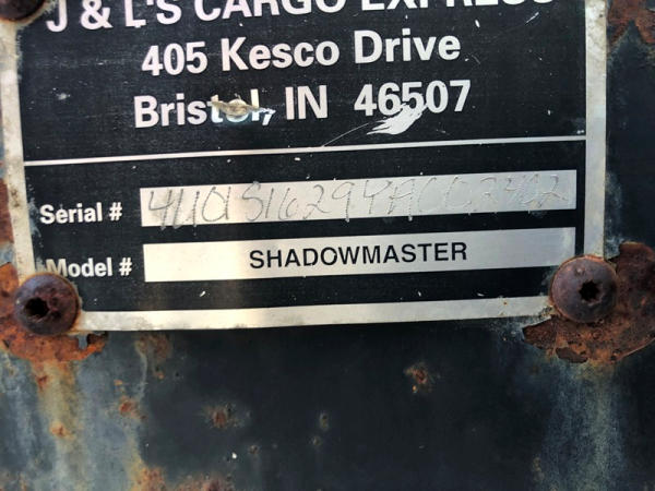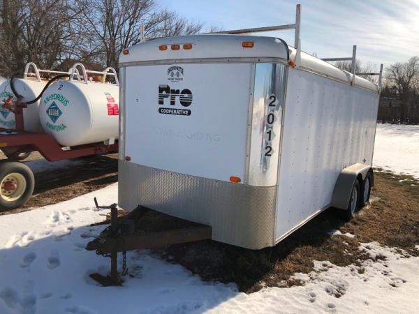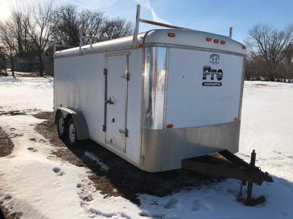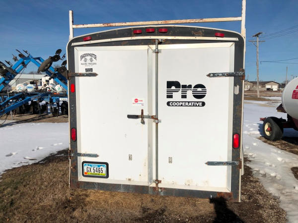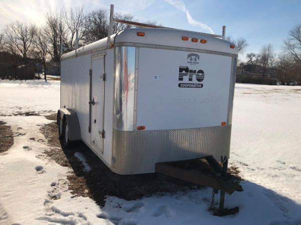 2000 Shadowmaster Enclosed Trailer (NP1415), approx. 16' length, tandem axle, side access door, rear cargo doors, top roof rack, bumper hitch, ST225/75R15 tires.